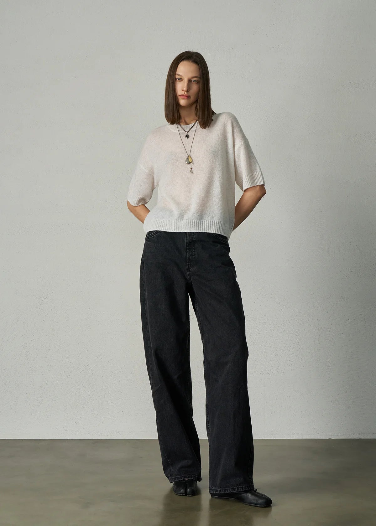 · Loose fit, finished at the high hip