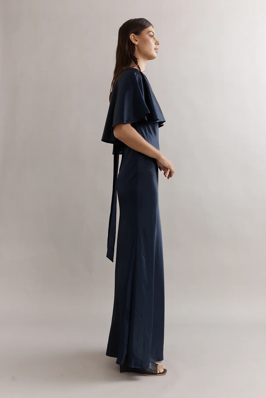 Introducing - the Blair gown. Crafted in fluid satin, this floor-length silhouette skims the body. Finished with the signature frill cape detail for beautiful movement and subtle drama, it’s the perfect piece for weddings, formal moments, and special occasions.