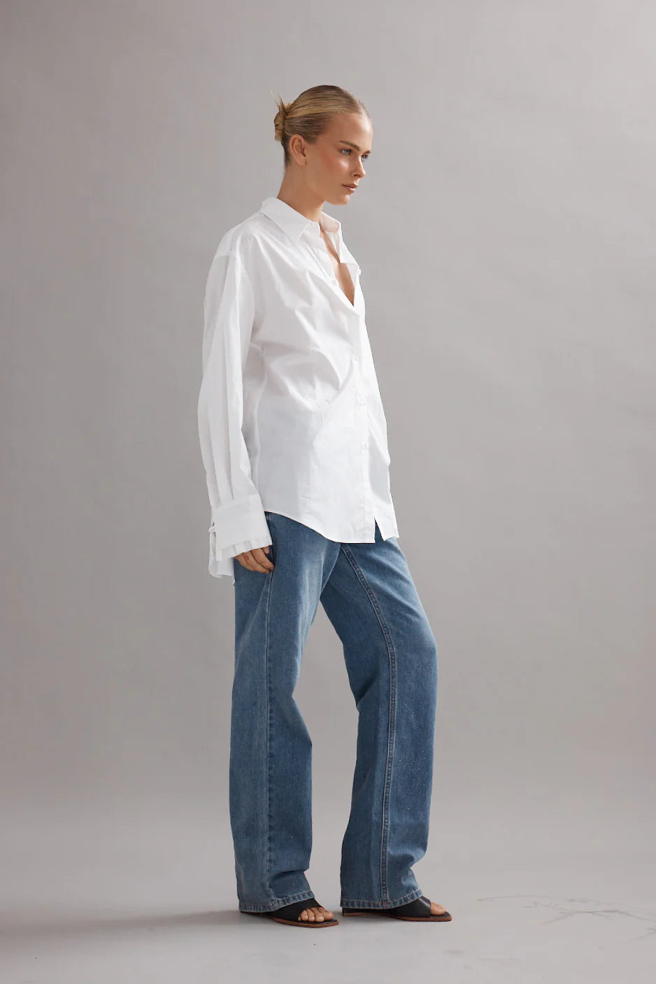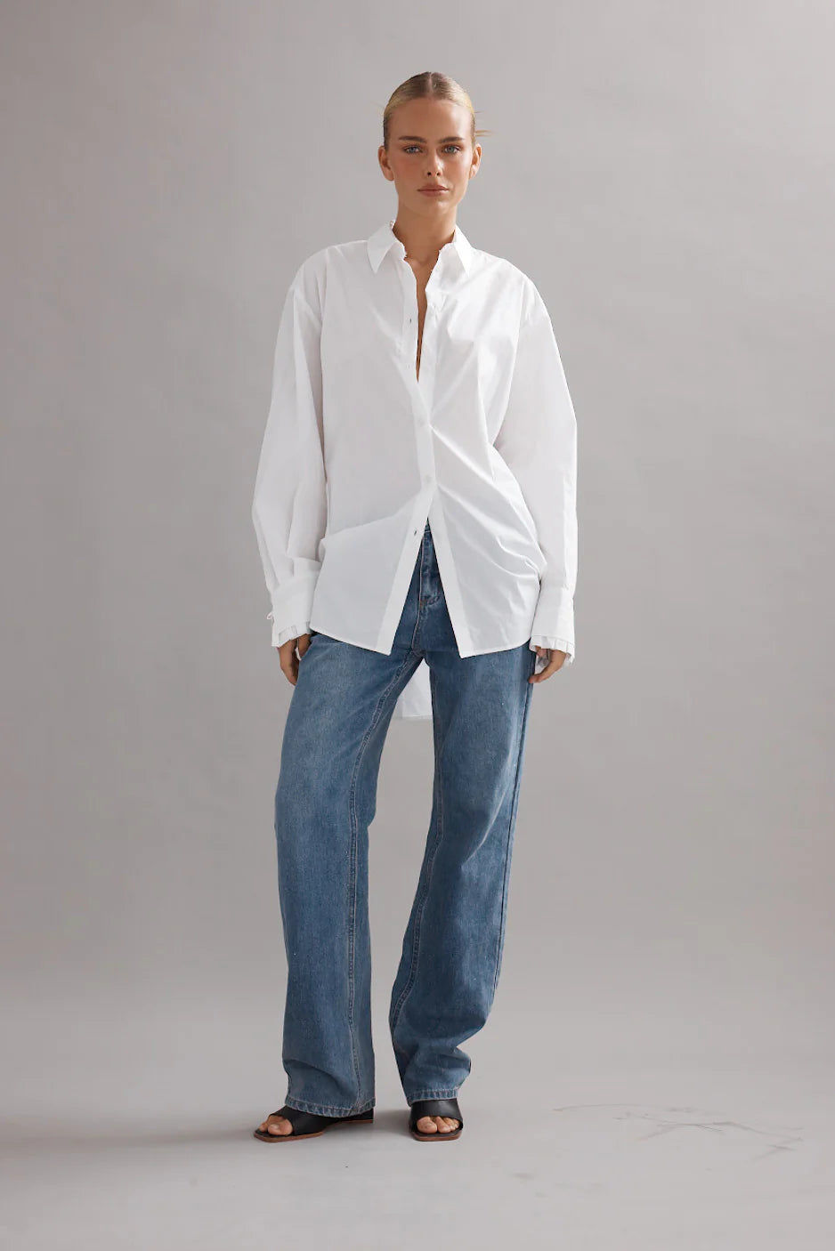 Introducing the Vienna shirt. This oversized design offers a modern, boxy fit, with a delicate frill detailing on the cuffs. Perfect for layering or wearing on its own, the Vienna Shirt is a versatile must-have for any season.
