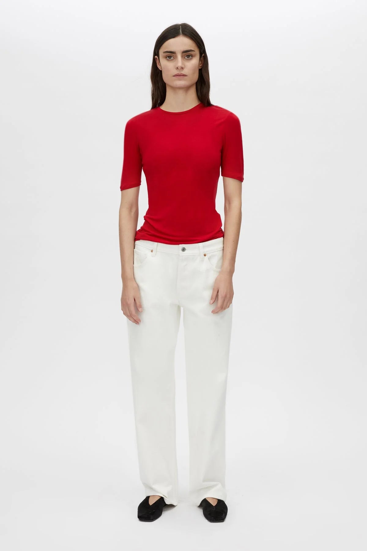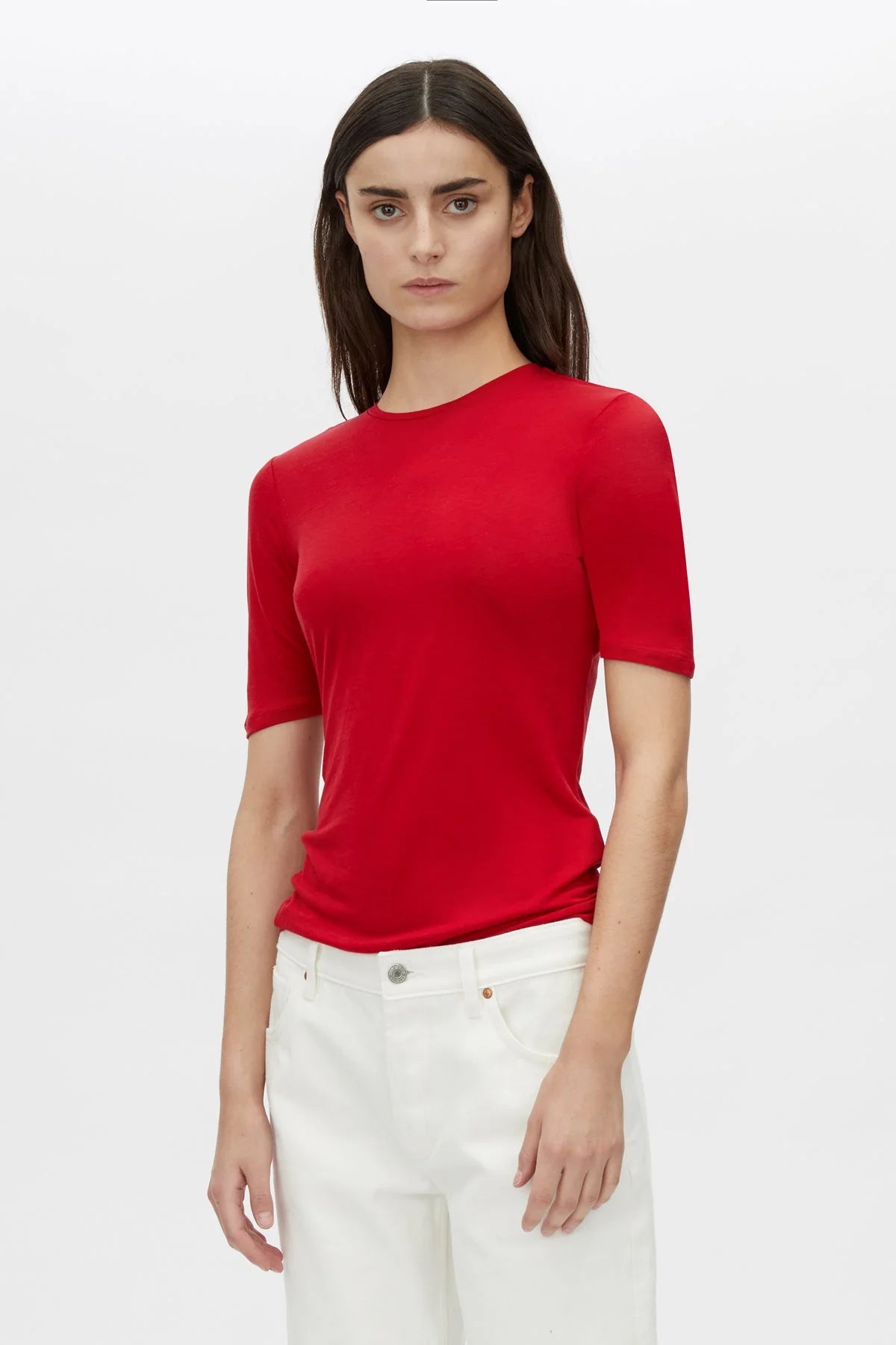 The Marjorie Tee is crafted from a semi-sheer Tencel and wool blend in a fitted tee silhouette. This tee features twin needle-stitched hems and extended short sleeves.