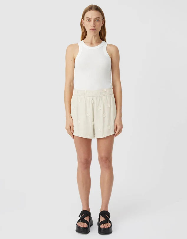 The Ottilie Short offers laid-back charm with its relaxed fit and intricate dot embroidery detailing. Designed to sit comfortably at the waist, these shorts feature an elastic waistband for ease and comfort. Complete with side seam slant pockets, the Ottilie Short effortlessly combines style and function for casual days and beyond.