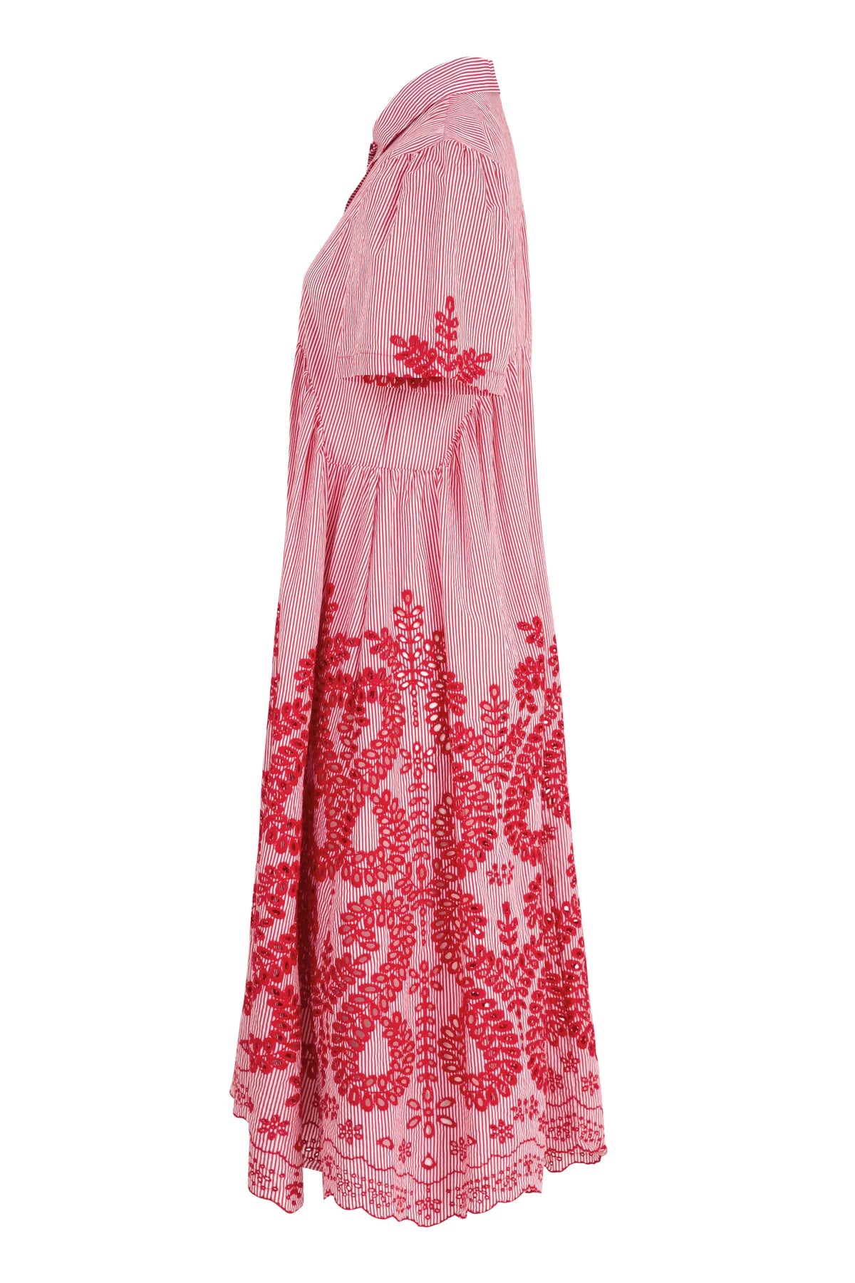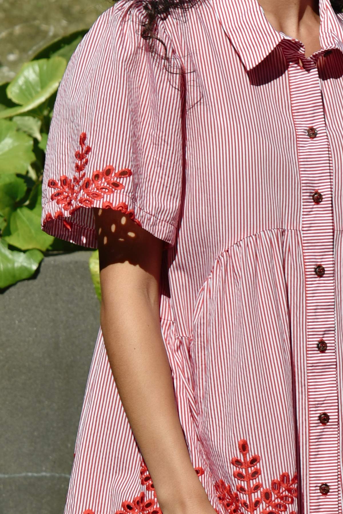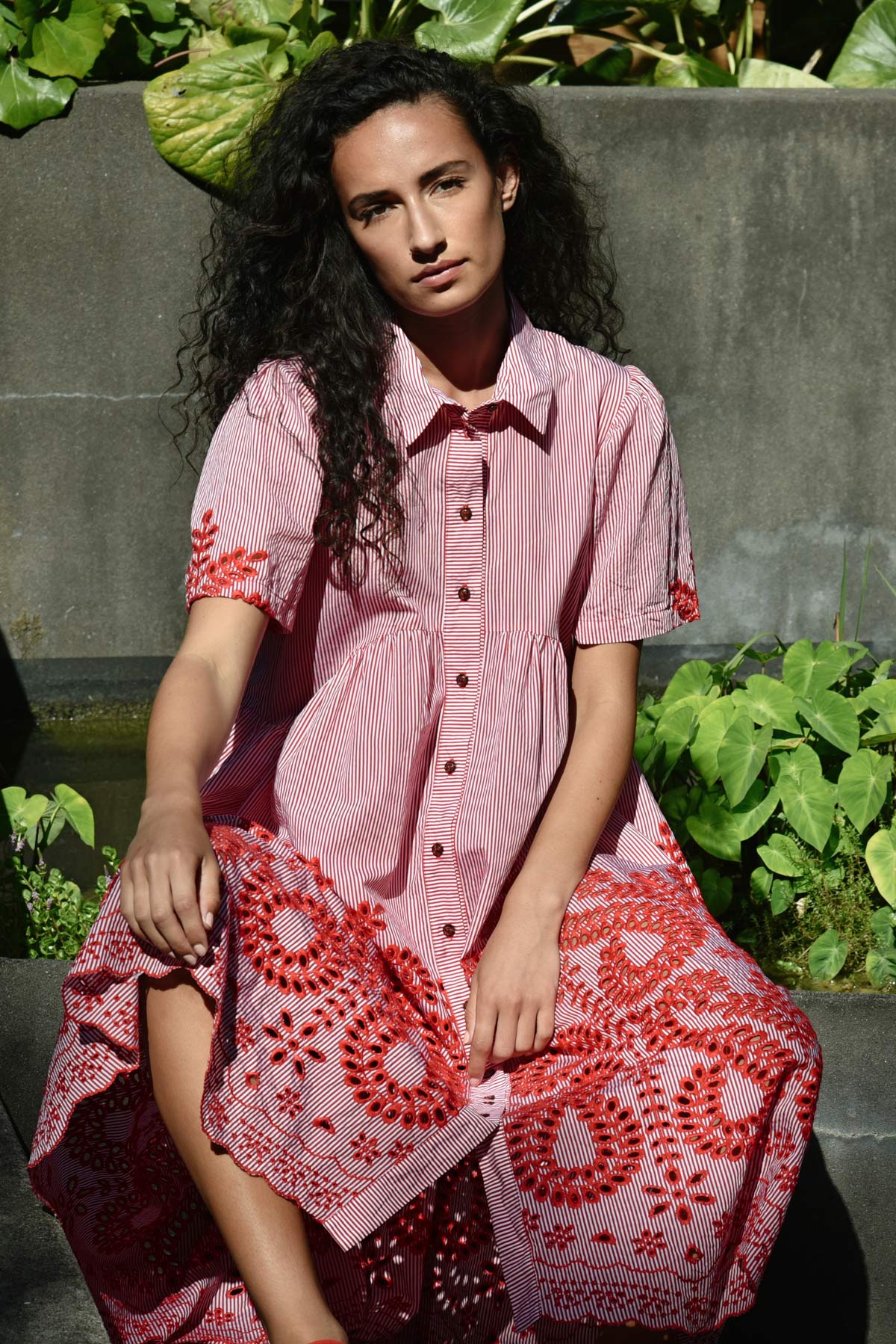 Delicate broderie anglaise and a dainty stripe come together in the 'A Stitch to Wear' fabric to present the spring classic, āMade for Each Otherā dress. Showcasing a button through front and a high, curved gathered waist this charming spring must-have lends itself to office-to-play wear thanks to its modest detailing. Delicate contrasting embroidery at the hem and sleeve cuffs add a touch of whimsy to an otherwise classic dress.