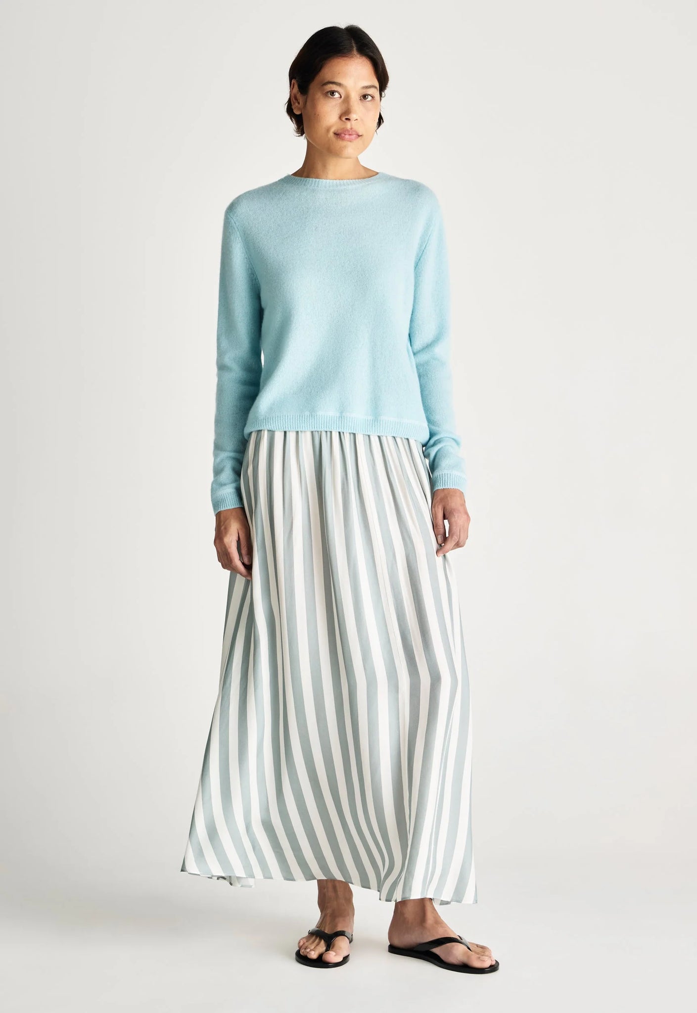 Our signature lightweight women's cashmere sweater is the ultimate transeasonal essential. Made from luxuriously soft cashmere, it's designed to be worn on its own or as layering piece. Featuring a fine crew neckline and a relaxed silhouette that falls at the hip, this versatile piece blends comfort with understated elegance. Pair it with a fluid silk, simple skirt or thrown over shoulders for an effortlessly refined summer evening look.