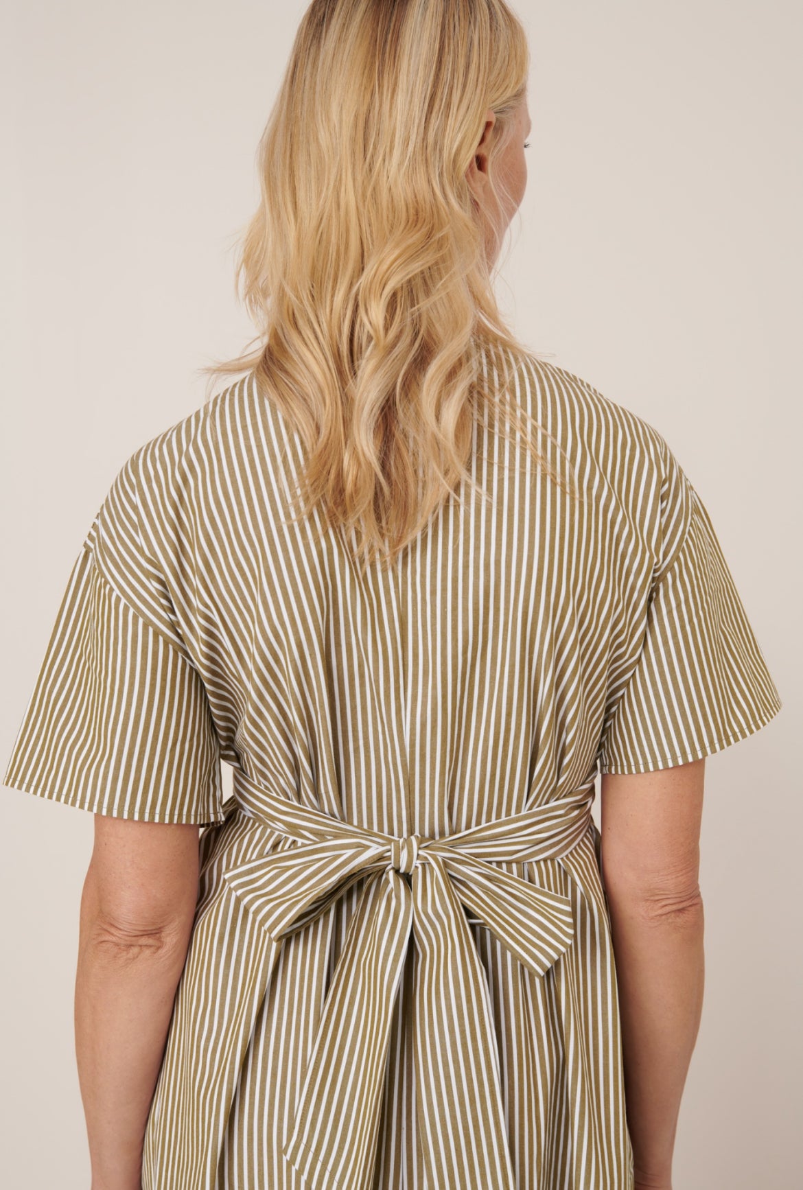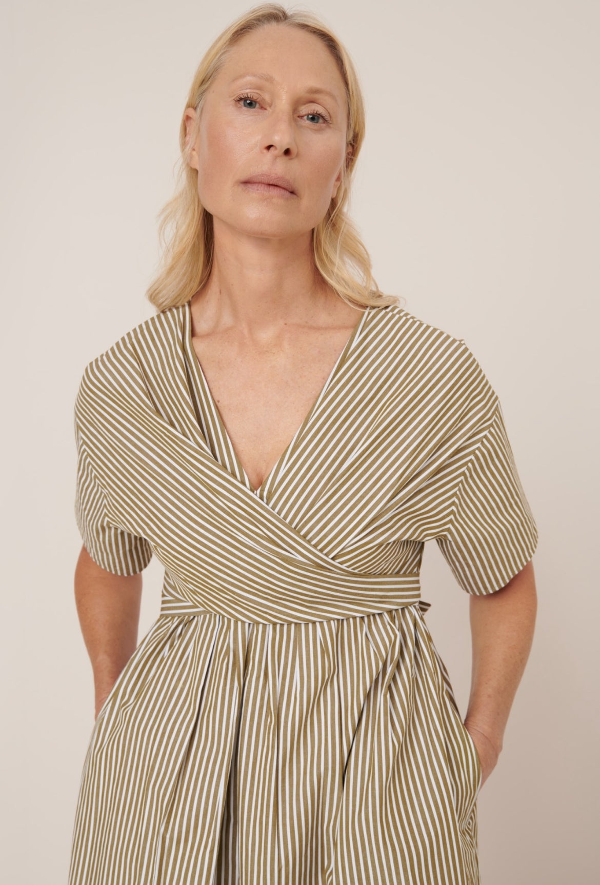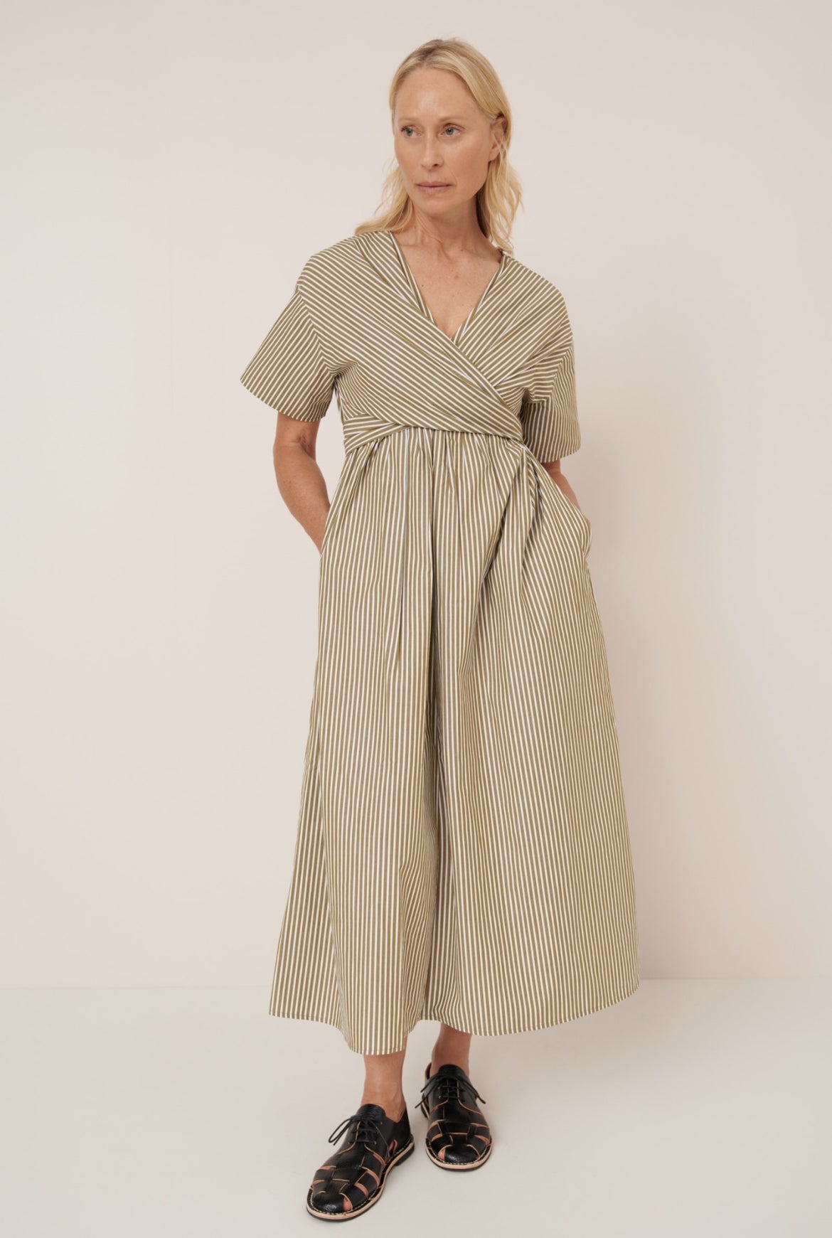 The Composer Dress is defined by its wrap front detail, creating a flattering v-neckline. Crafted from a crisp organic cotton poplin, it features a standard fit with subtle shaping through the back bodice and inseam pockets for effortless functionality.
