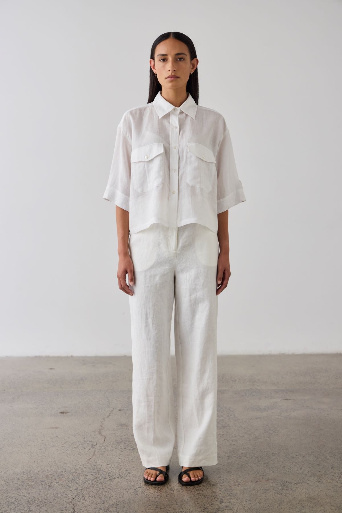 A modern update on a timeless staple. This women's linen shirt is crafted from fine 100% linen, offering a crisp, breathable feel perfect for warm weather. Cut cropped for a contemporary silhouette, it features elbow-length sleeves, patch pockets, and clean lines that balance structure with ease.