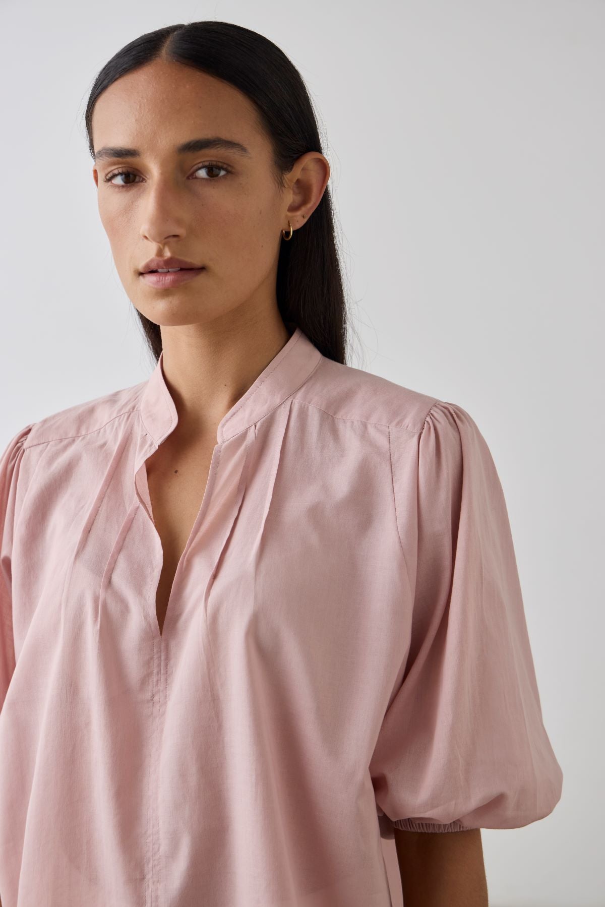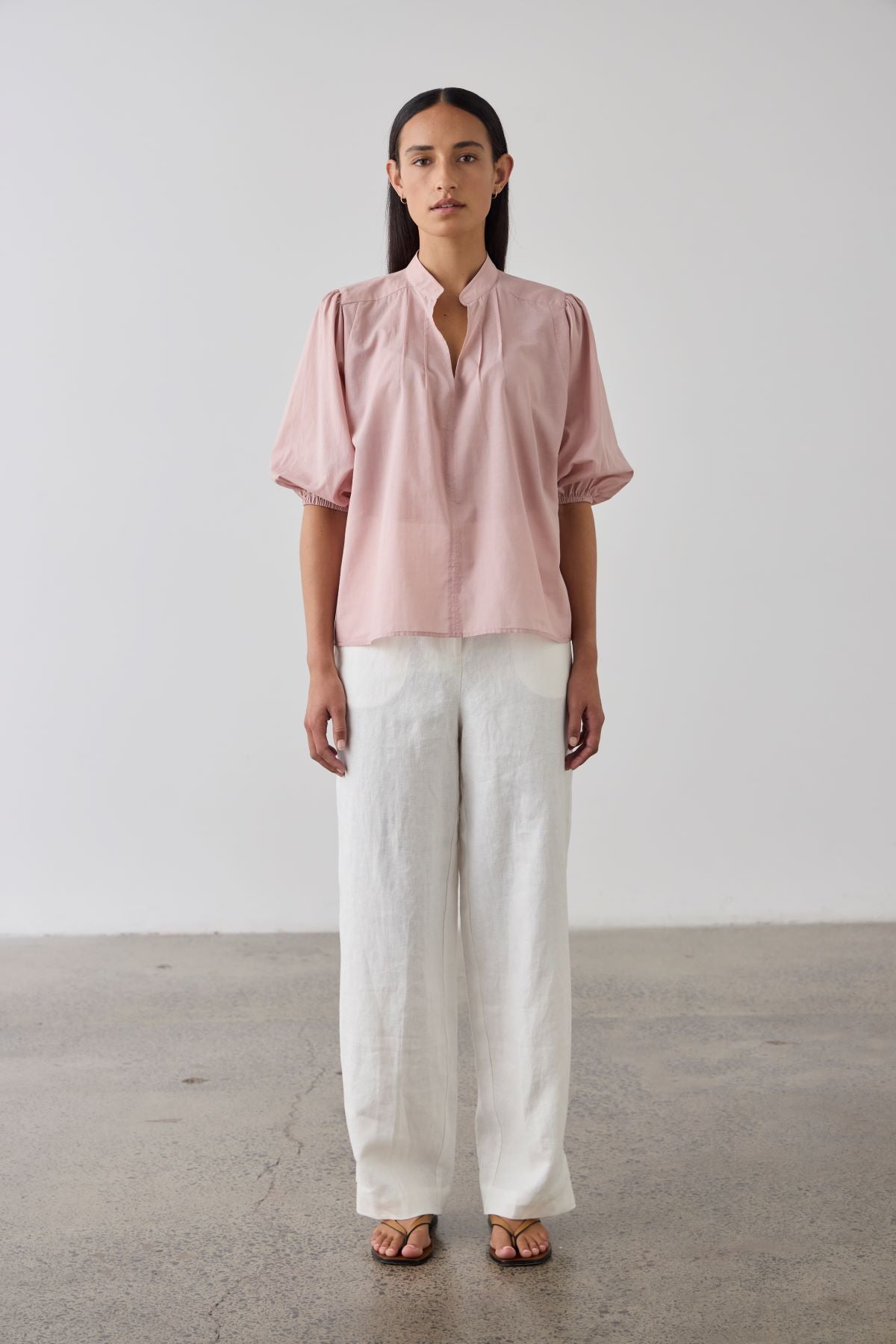 The Maddie Blouse is your easy answer to pulled-together, low-key polish. Cut from soft cotton voile in the softest pink, it features a gently voluminous sleeve, fine pleating through the neckline, and a relaxed placket for a hint of undone charm. The silhouette falls lightly to the hip and is easy to tuck, or leave loose and floaty.