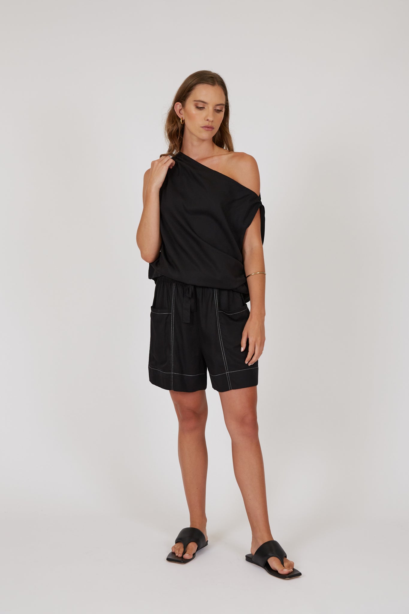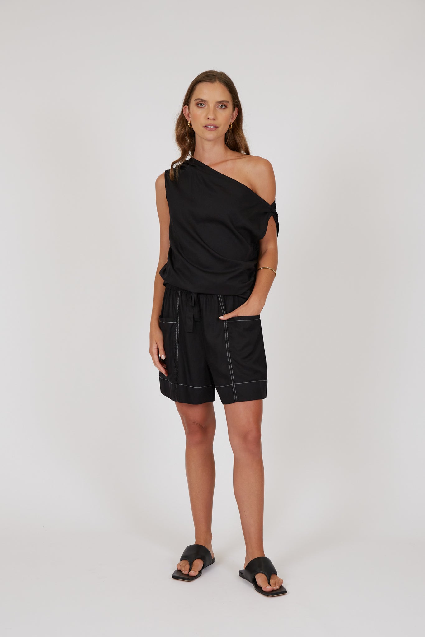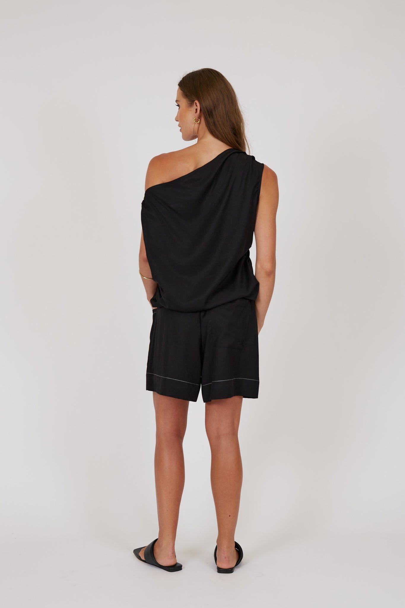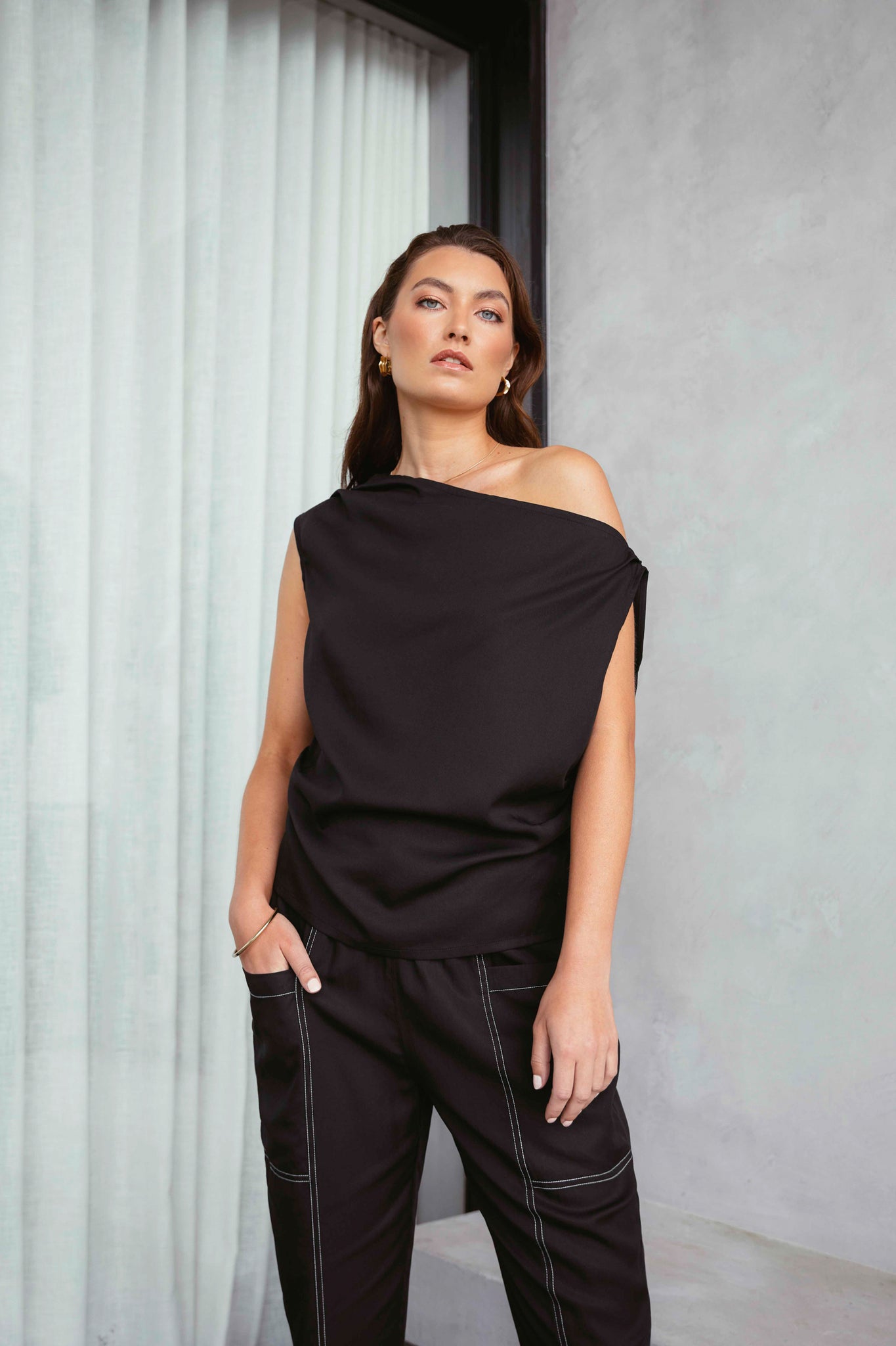 Laid-back with a touch of polish, the Palma Asymmetric Top is designed to take you effortlessly from day to night. Crafted from 100% Tencel with a soft hand feel and beautiful drape, it features an off-the-shoulder design with a straight, asymmetric neckline. Pleating details at the shoulders and sides add texture and shape, making this an understated yet striking piece for any occasion. Pair with the matching Palma Short or Pant for a coordinated look.