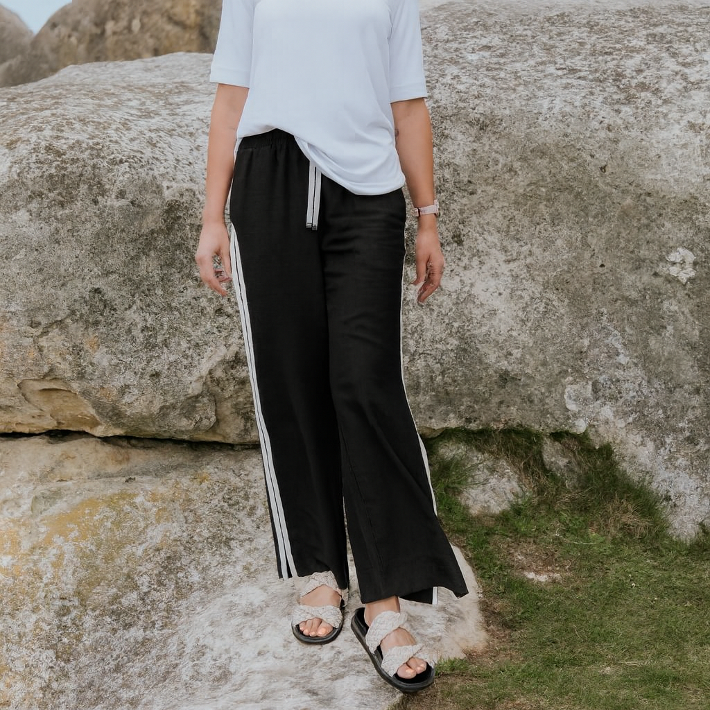 Cream contrast stripes run down each leg for a sport-luxe edge, while subtle side splits at the hem add movement and a touch of ease. The fit is streamlined yet relaxed, with a wide-leg silhouette that flatters every shape and pairs beautifully with tanks, tees, or a crisp shirt.