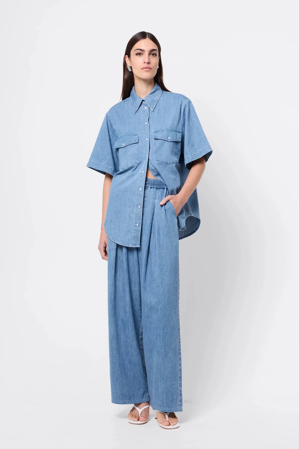 A timeless essential reimagined for modern dressing, the High Tide Shirt in Blue brings effortless versatility to your wardrobe. Crafted from a premium chambray fabrication, this relaxed silhouette features a collared neckline, short sleeves, and a waved hemline for a contemporary edge. Designed with patch pocket detailing and pearlescent snap button closures, it offers the perfect balance of structure and ease. Pair with the matching High Tide Pant for a coordinated look, or style open with a tank and denim for relaxed sophistication.