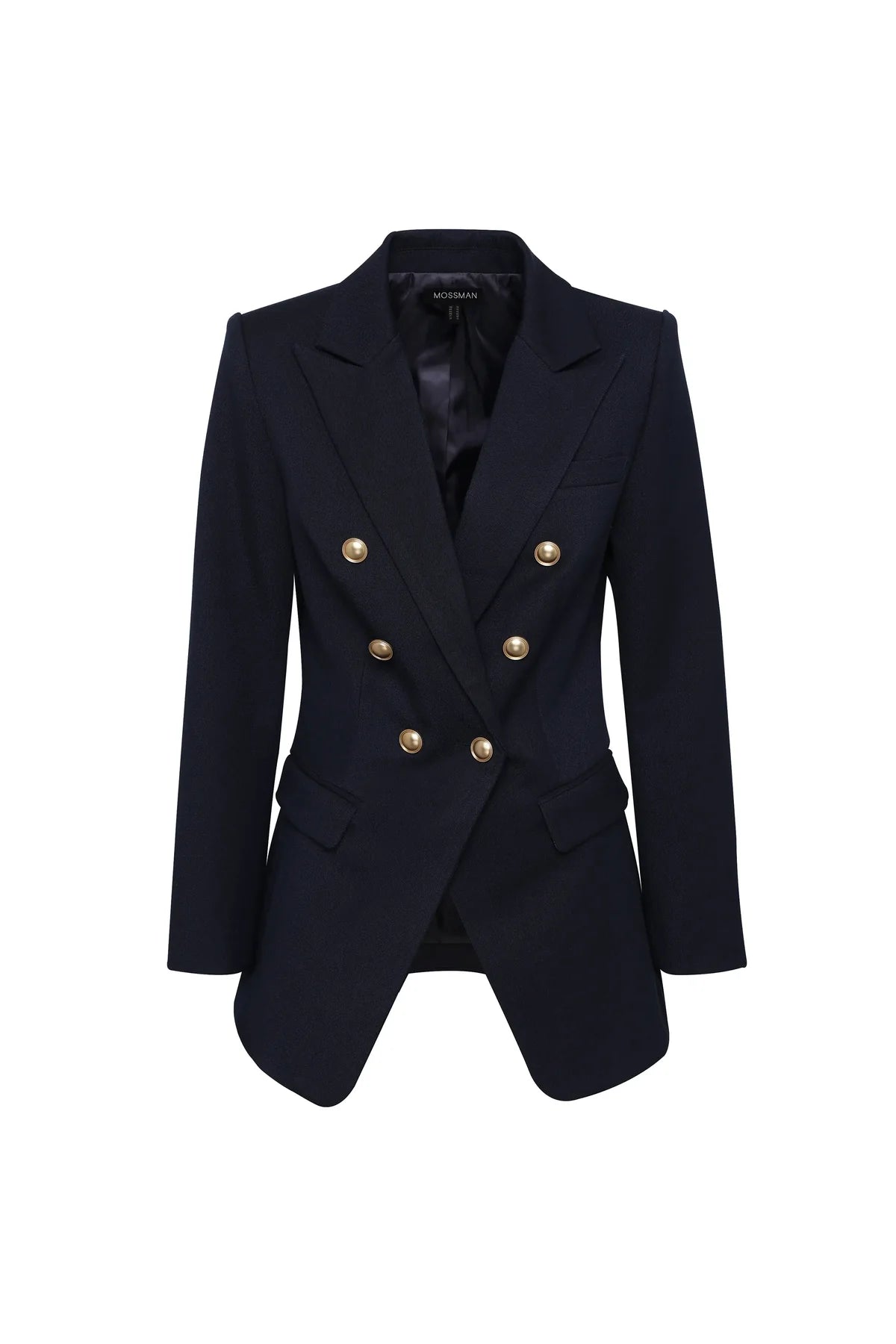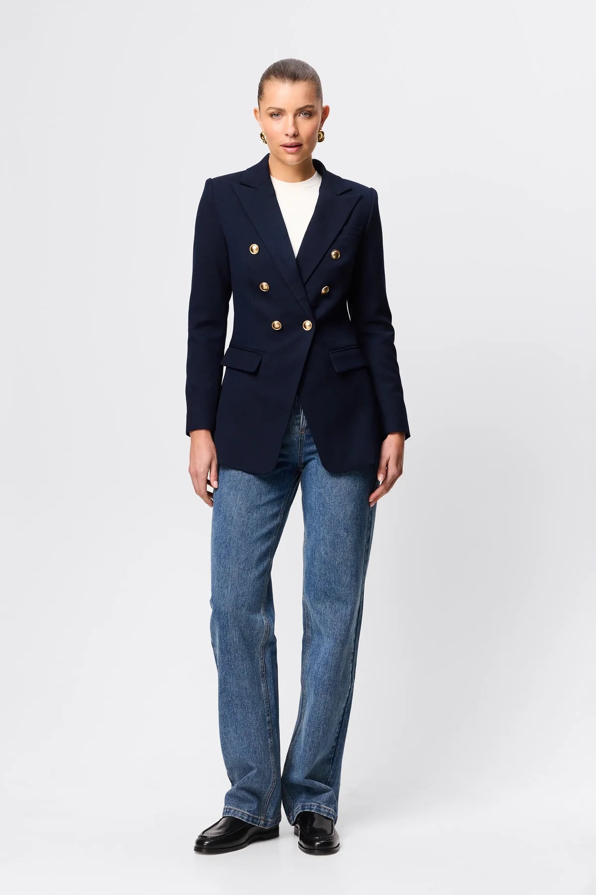 Timeless and refined, the Legacy Blazer in Navy brings understated sophistication to every look. Crafted from premium suiting fabrication, this fitted, double-breasted blazer features gold-toned buttons, padded shoulders, and a peak lapel for a structured finish. Fully lined for comfort, it’s the ultimate throw-on piece that elevates both tailored and casual styling.