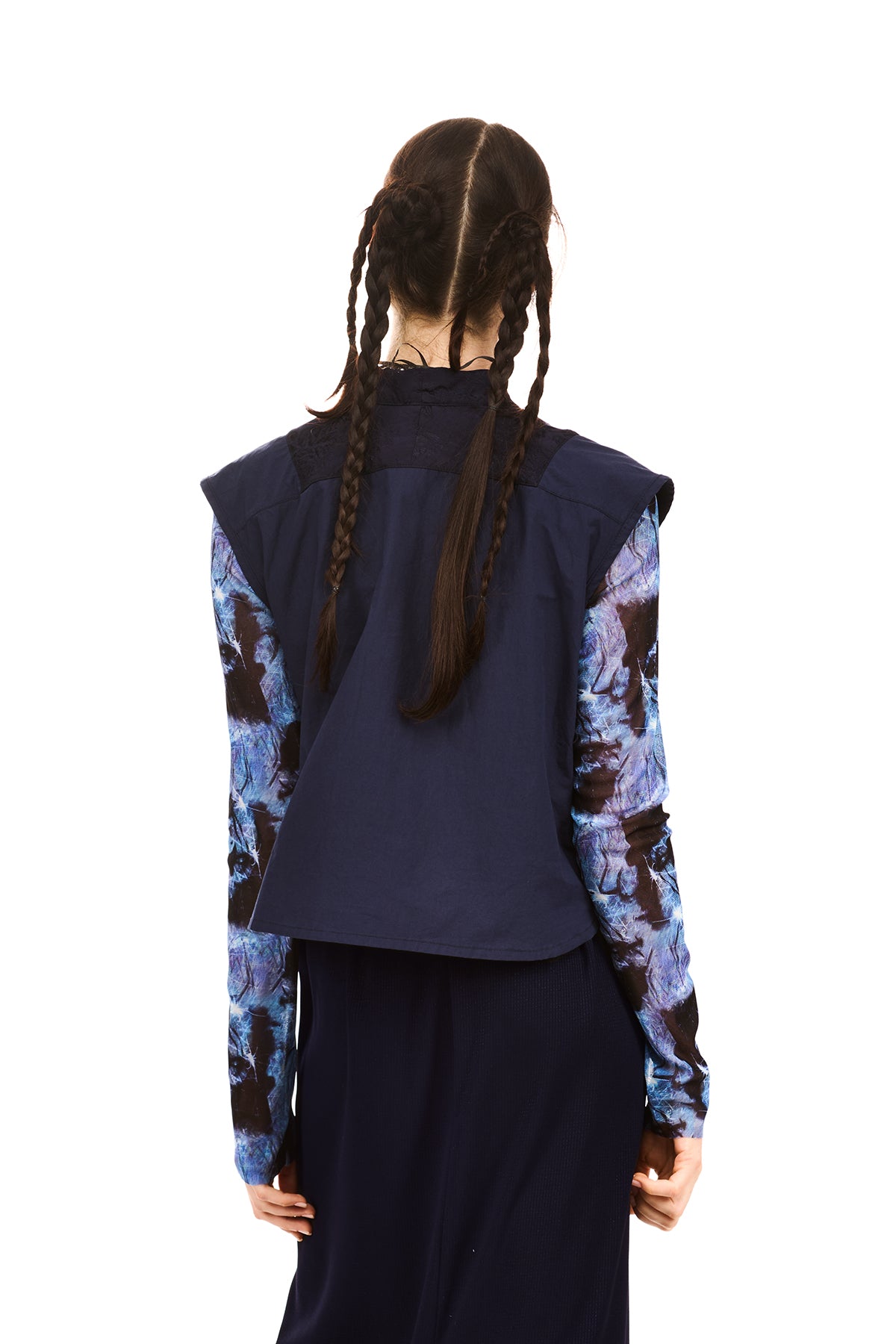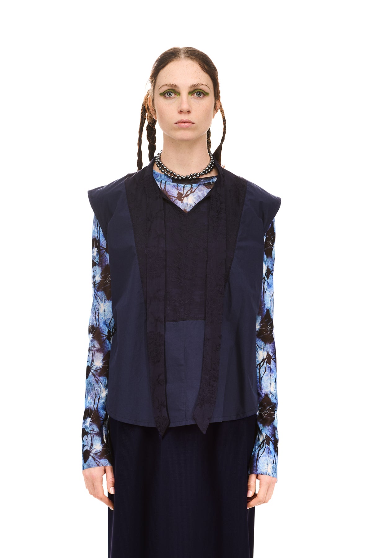 Boxy top with capped shoulderContrast fabric bib and tie detailStepped curved hemline