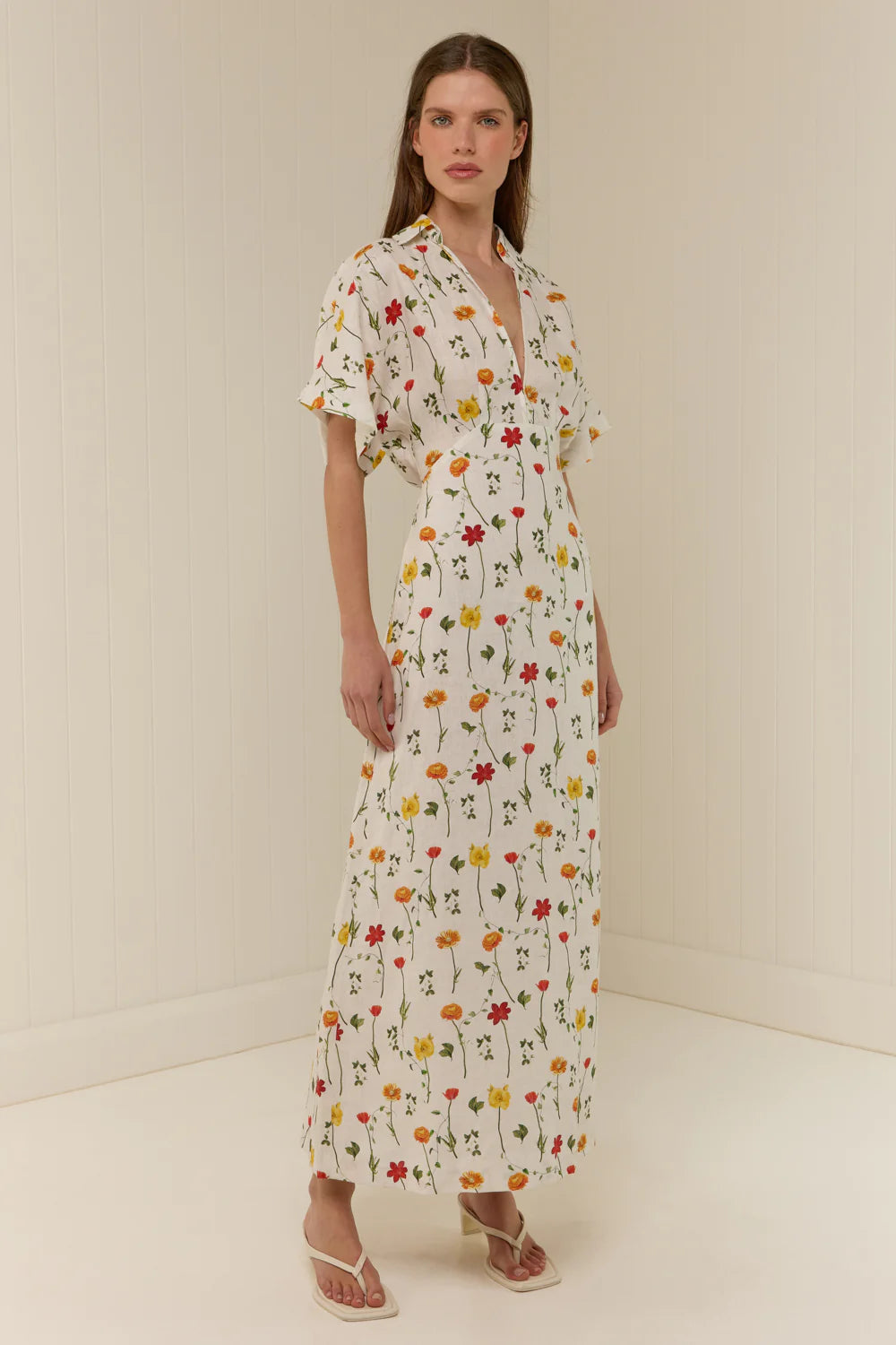 The Jasmine Dress is crafted from Premium Linen, printed in our exclusive Calypso Tile. Offering a relaxed, flattering fit with oversized sleeves that blend in to a slim A-line skirt. The neckline is a flattering deep V-shape that also features a hidden hook and eye for additional coverage if desired.