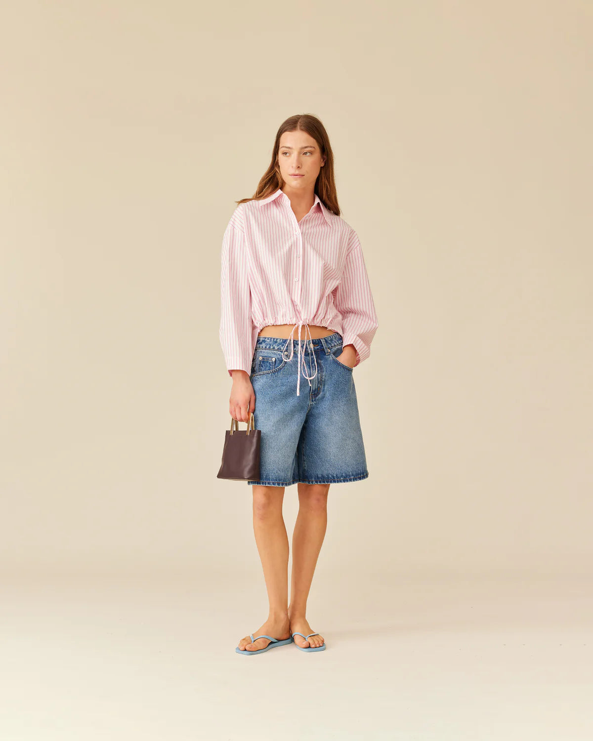 A twist on the classic button-up shirt, designed in a pink stripe organic cotton. Cropped at the front with an adjustable drawstring that can be worn open or cinched.
