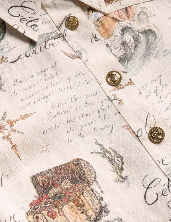 The Tunic Dress in Treasure Island from our Cruise 2026 Collection, Twisted Romance. A linen mini dress featuring a classic collar, buttons down the centre front, finished with wide hem sleeves and side splits.