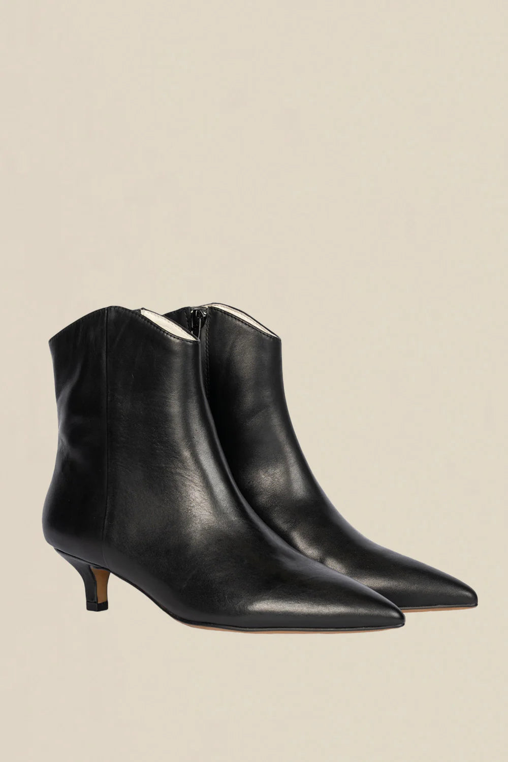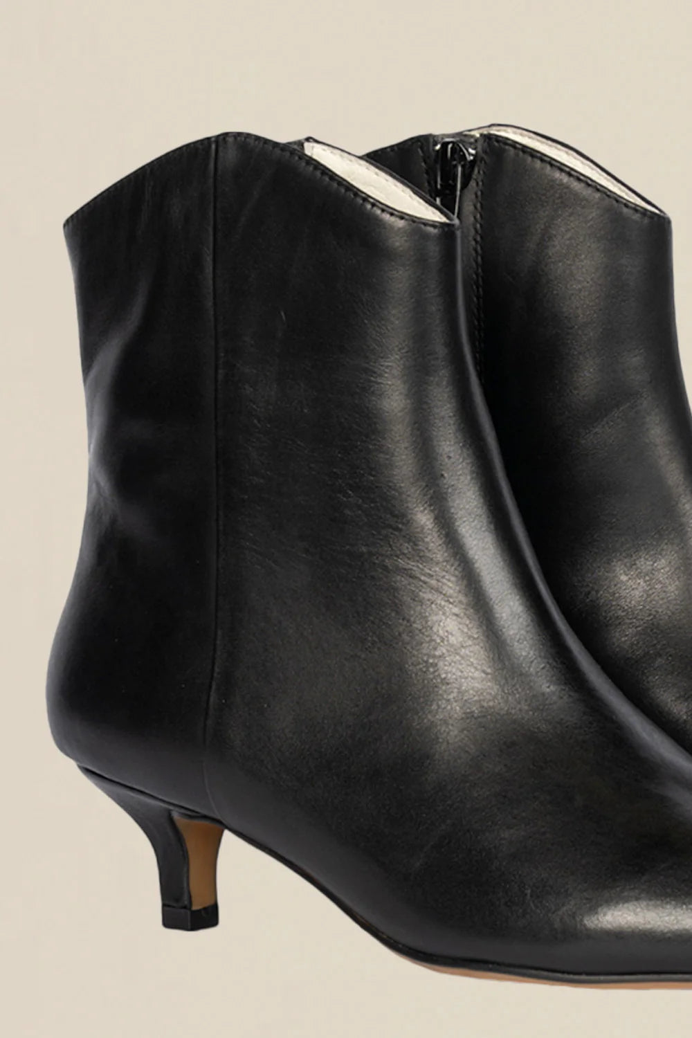 - ankle boot set on a subtle kitten heel for ease and wearability