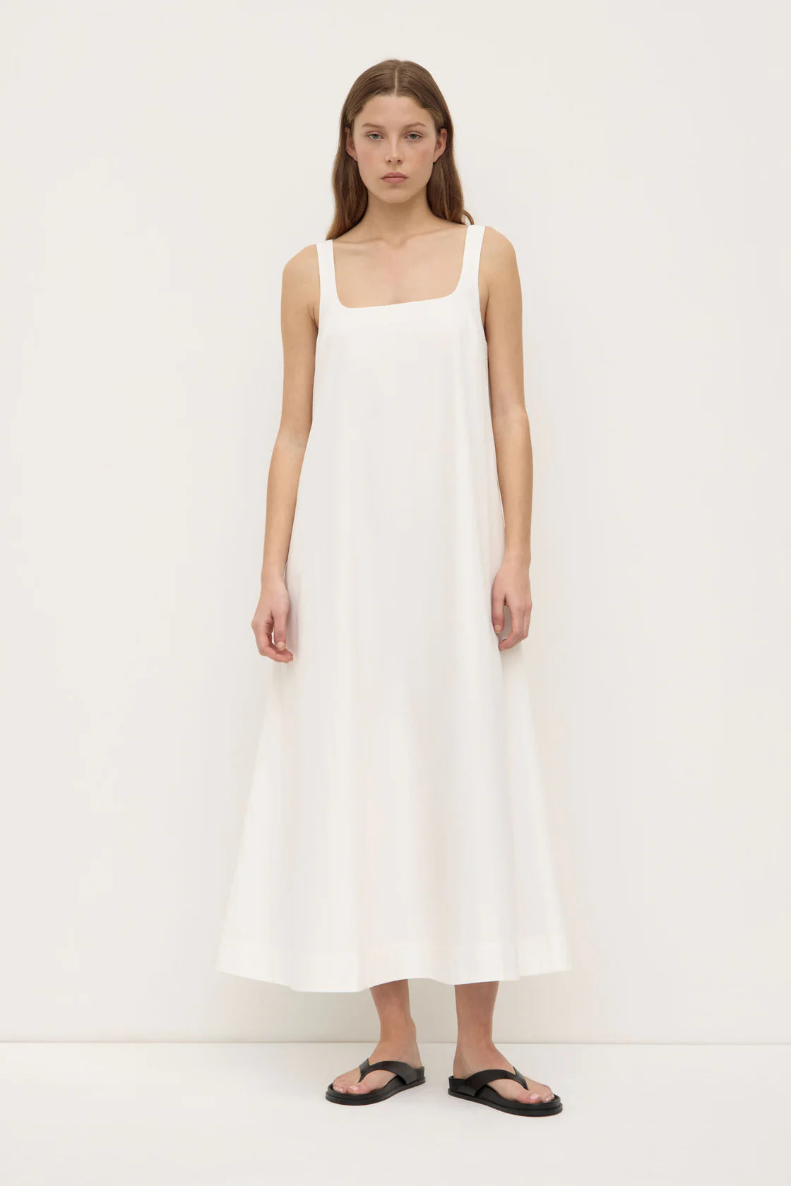 Elevated longline maxi dress crafted from a midweight cotton. Features a square scoop front and back neckline and side pockets for added utility.