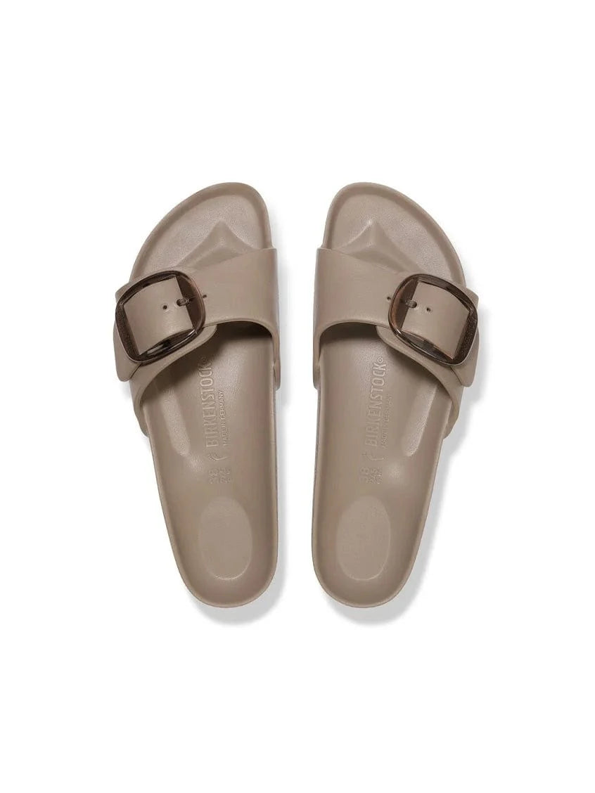 This is a new and modern interpretation of the BIRKENSTOCK classic Madrid. This version features our popular Big Buckle made from a stainless synthetic material and makes an impression with its durability and minimalist design. Modeled on the cork sandal, it is made from the ultra-lightweight and highly flexible synthetic material EVA. The high-quality, odor-neutral EVA has been tested for harmful substances and combines numerous positive attributes: it is very light, highly elastic, shock-absorbent, water-resistant, and skin-friendly.