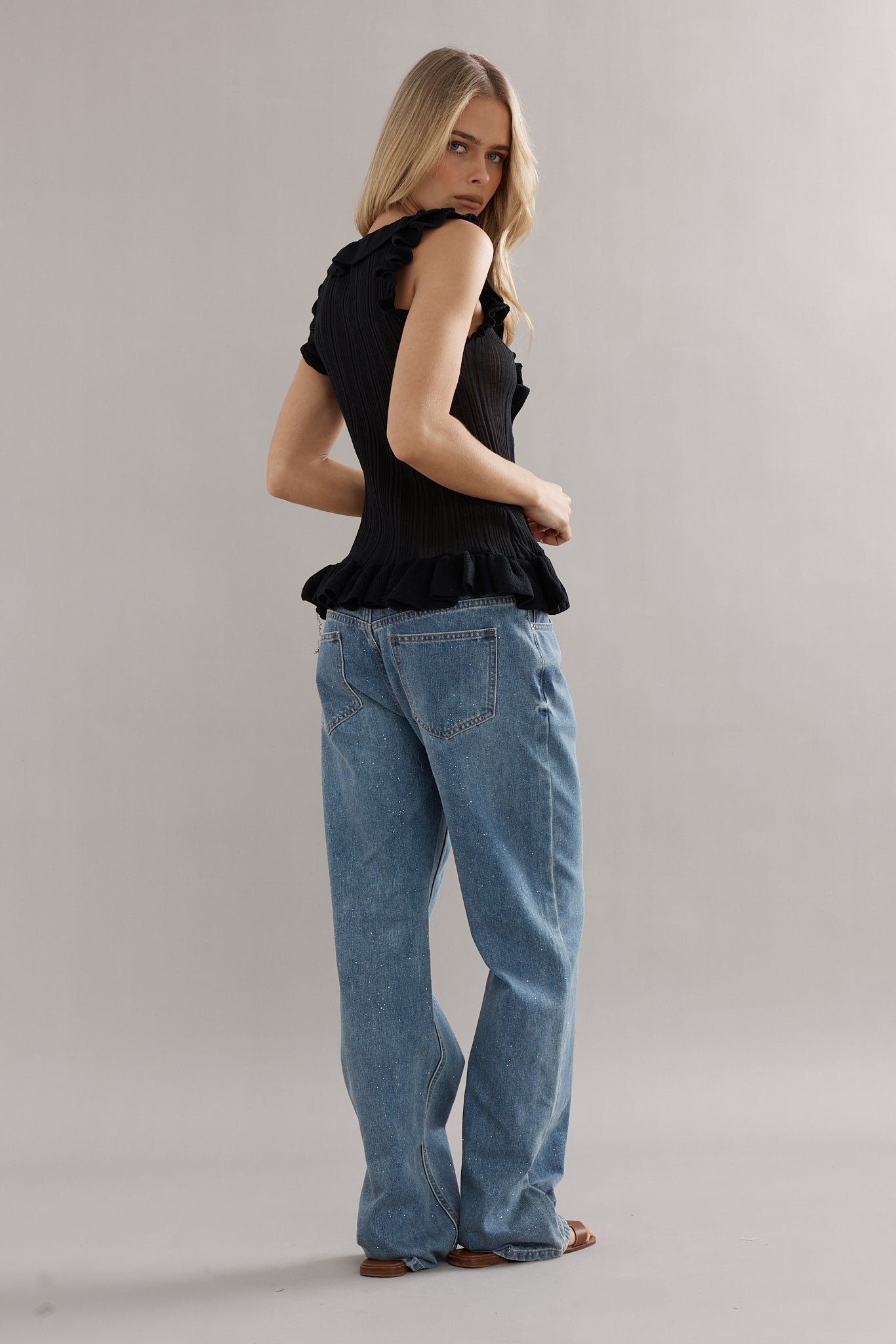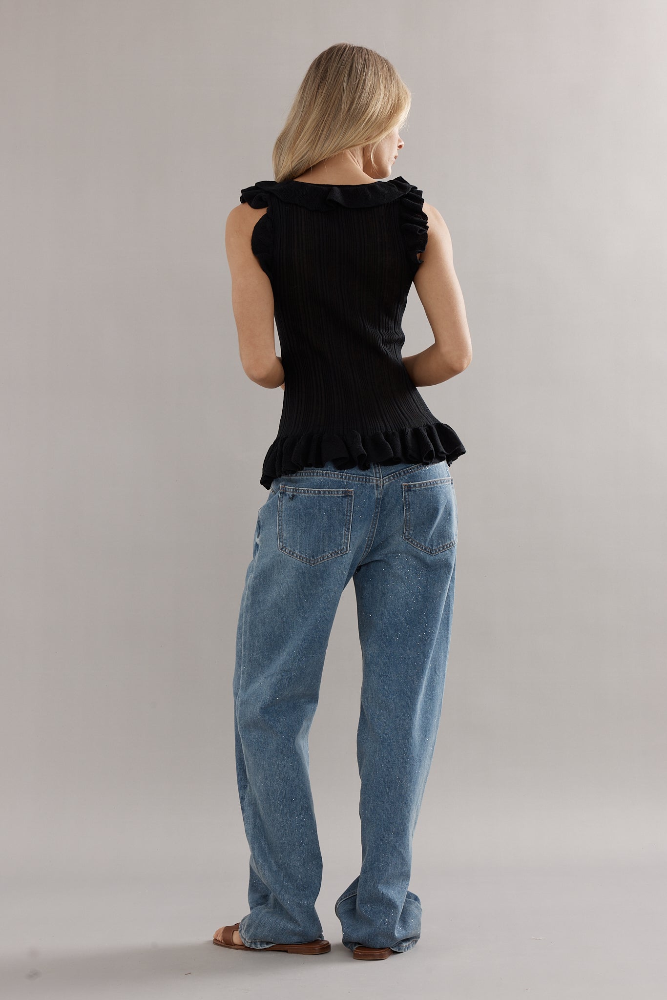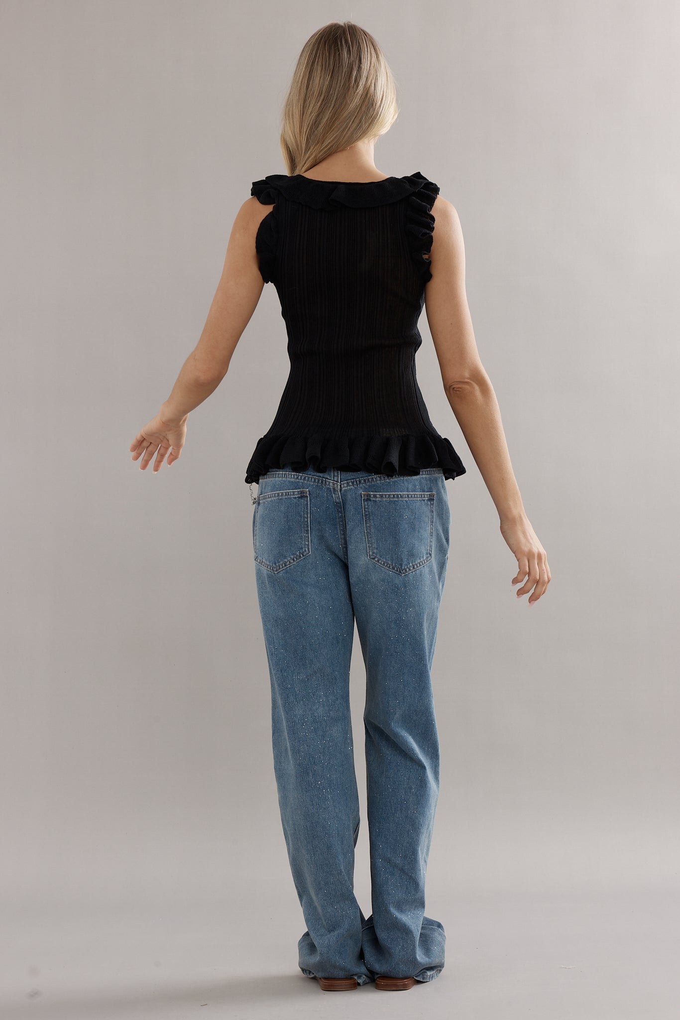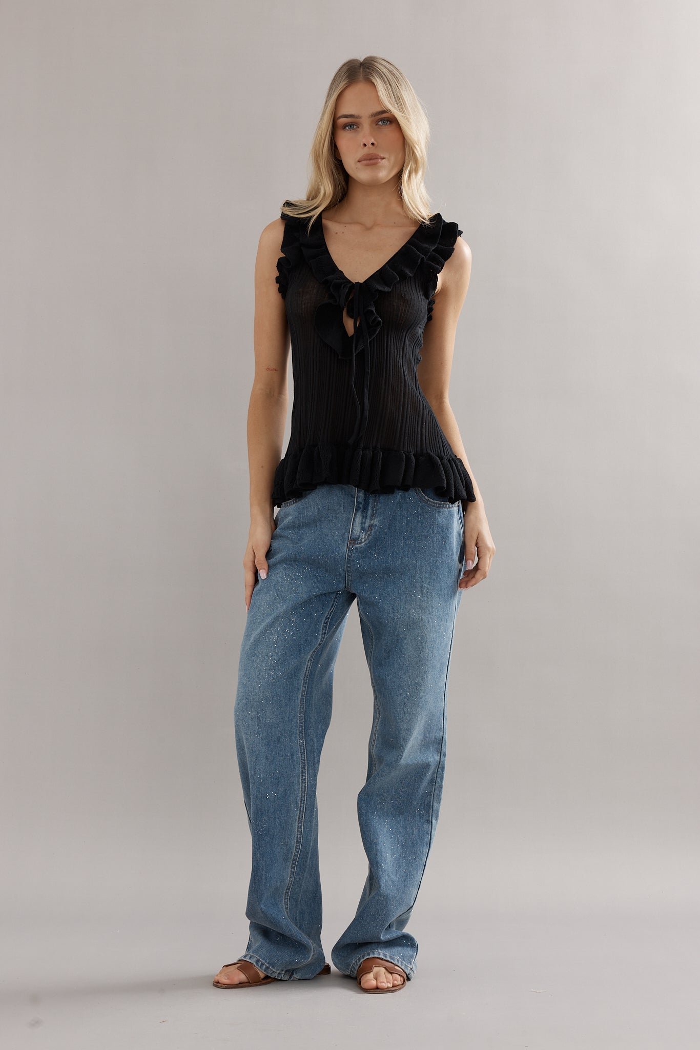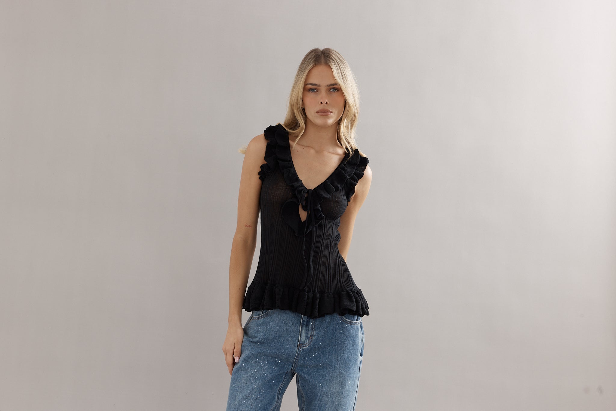 A knit tank, with a feminine twist. Designed in the same rib knit as The Angelica Dress, The Darwin Tank is finished with ruffled edges and a tie-front neckline. Available in blue, white, and black, she’s the versatile little number you’ll be reaching for again and again.