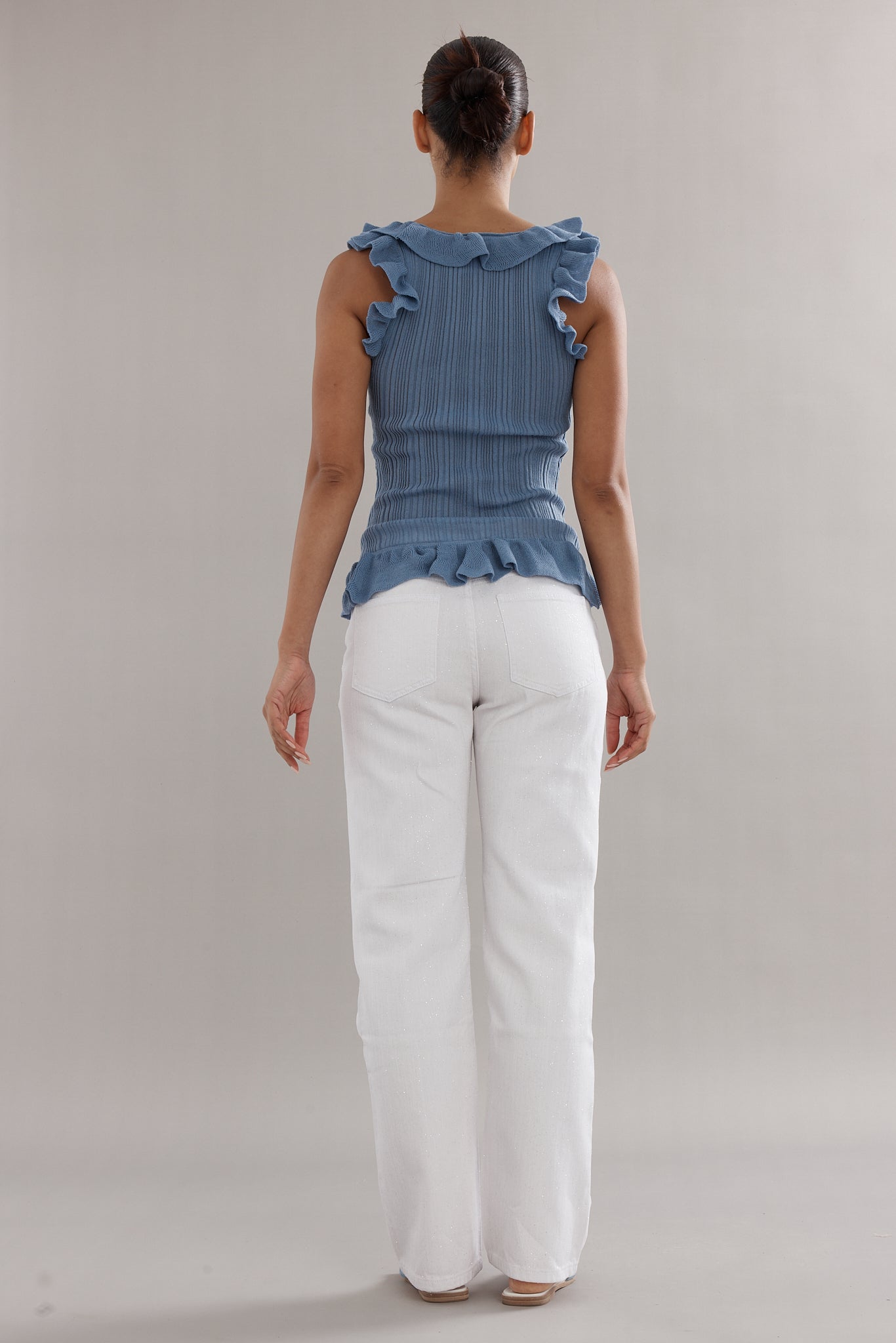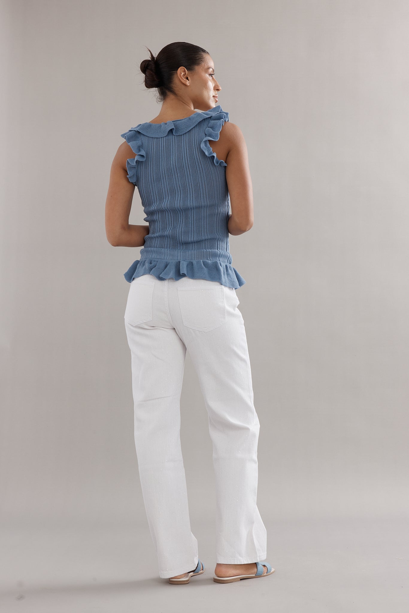 A knit tank, with a feminine twist. Designed in the same rib knit as The Angelica Dress, The Darwin Tank is finished with ruffled edges and a tie-front neckline. Available in blue, white, and black, she’s the versatile little number you’ll be reaching for again and again.