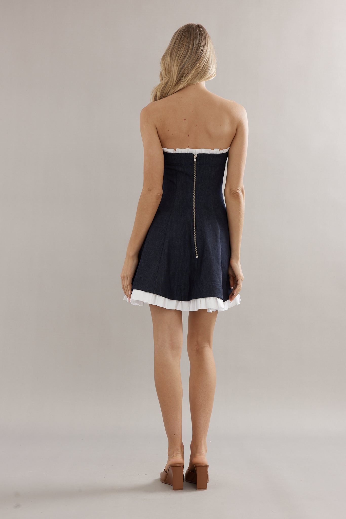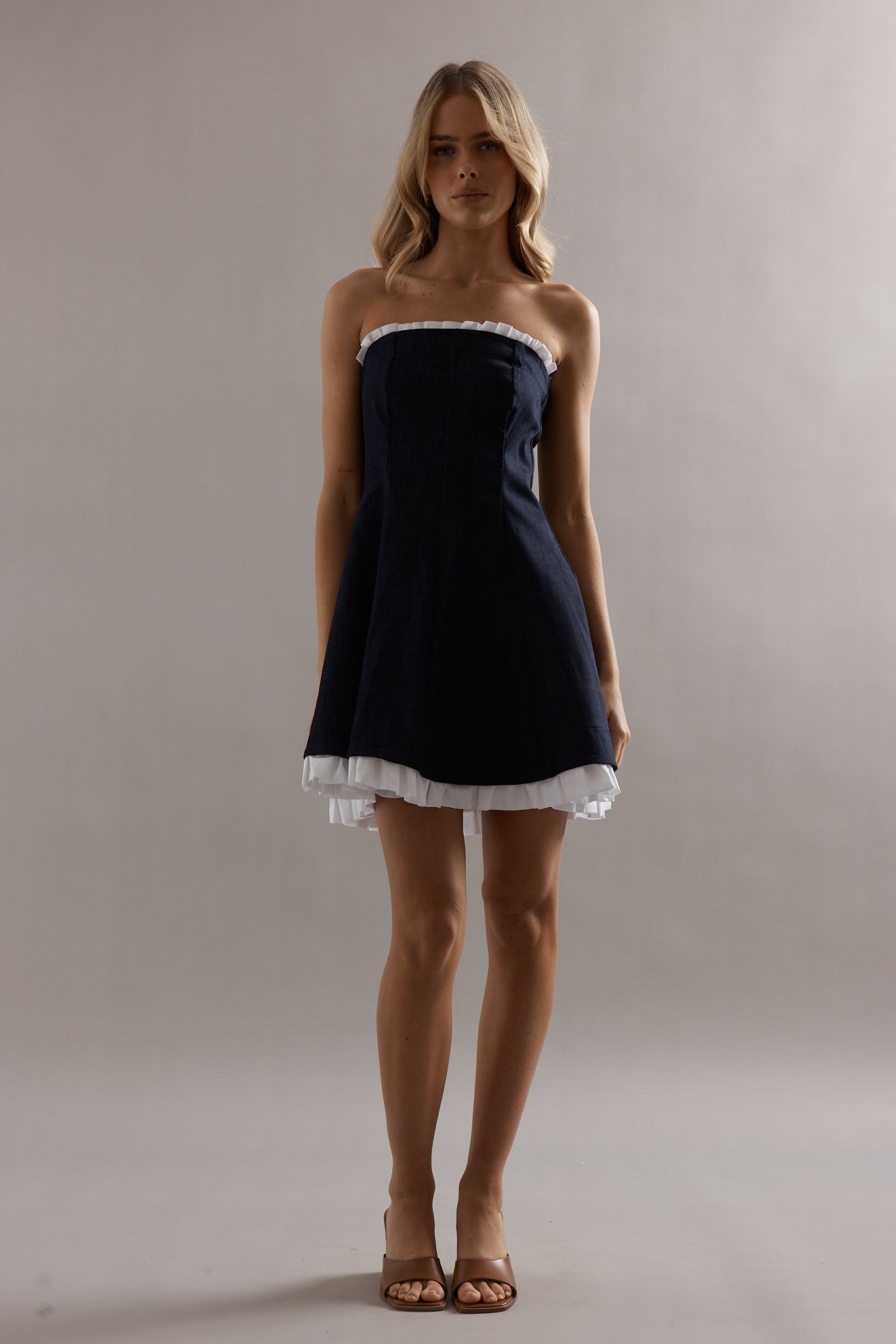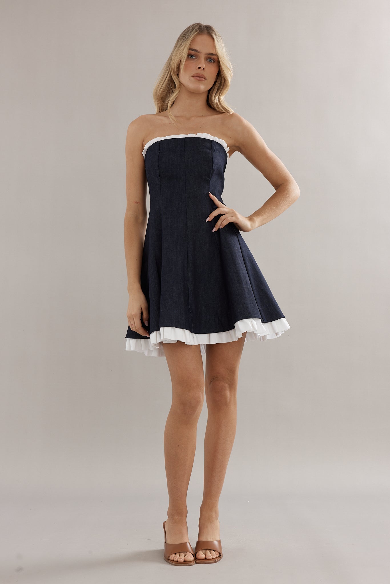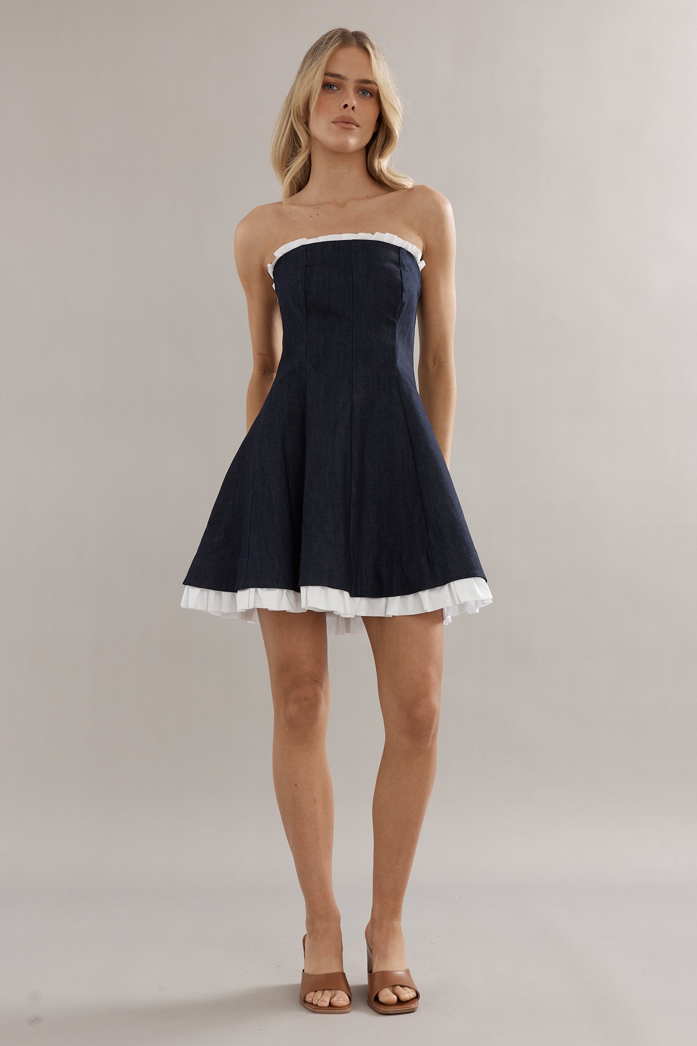 Classic, but make it playful. This strapless mini is cut from soft denim with a flirty flared skirt, trimmed with crisp white ruffles for that perfect peek of contrast. The Frilly Charleston Mini is effortless yet elevated — throw her on with flats for a girls lunch or dress her up with strappy heels for dancing all night long.
