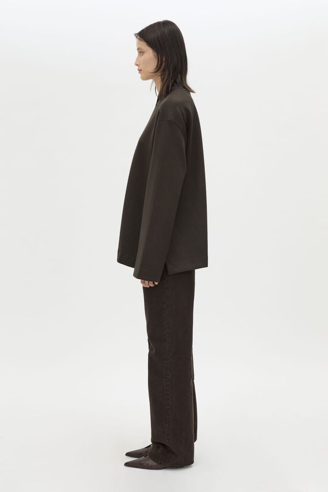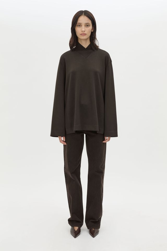 CAMILLA AND MARC Bessette long sleeve brown top with high neck. Side splits, flatlock stitch detail at seams, blind hem.