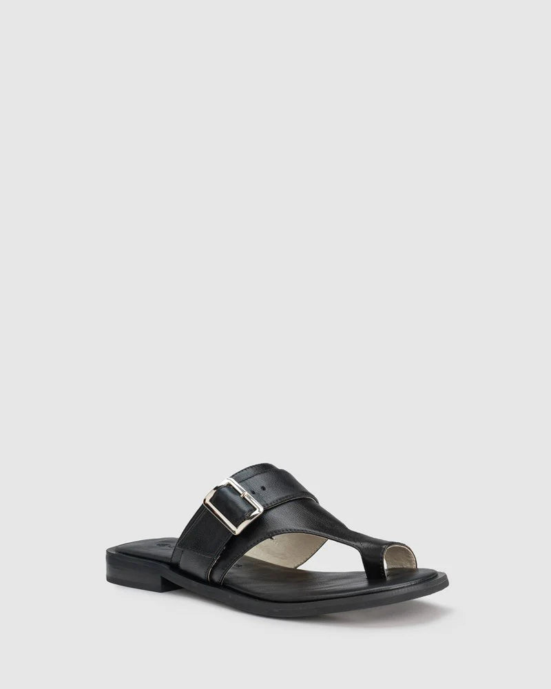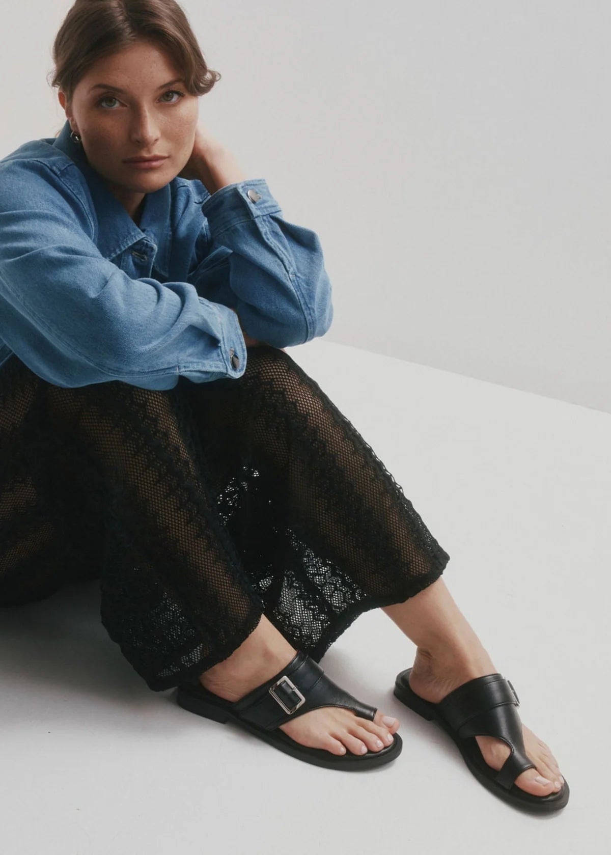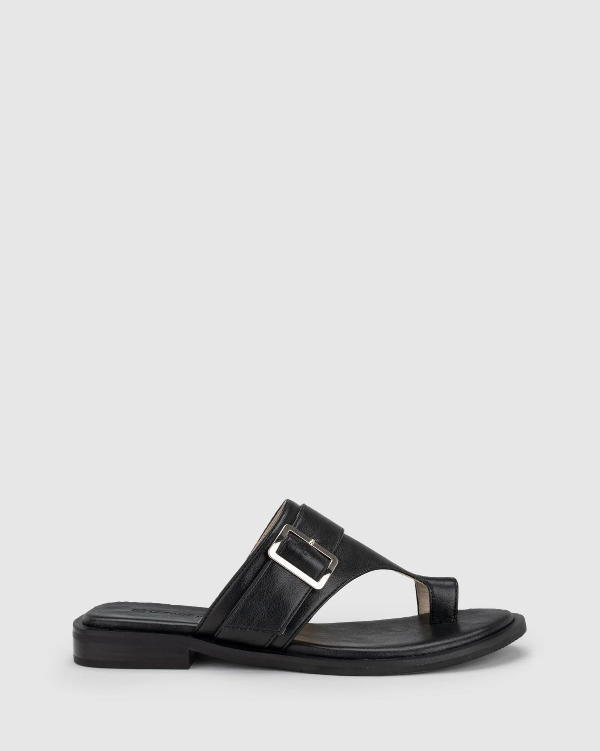 Simple with a statement twist, the YUNA SLIDE in Black features a bold silver buckle atop soft recycled leather straps. With a comfortable heel and clean silhouette, this black leather slide works seamlessly from workdays to weekends.