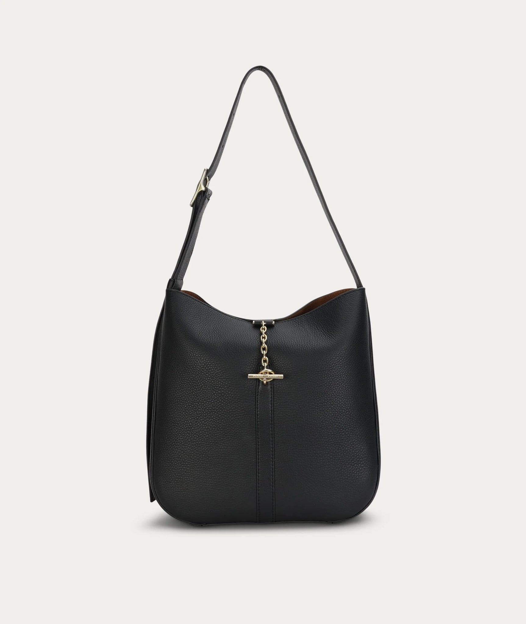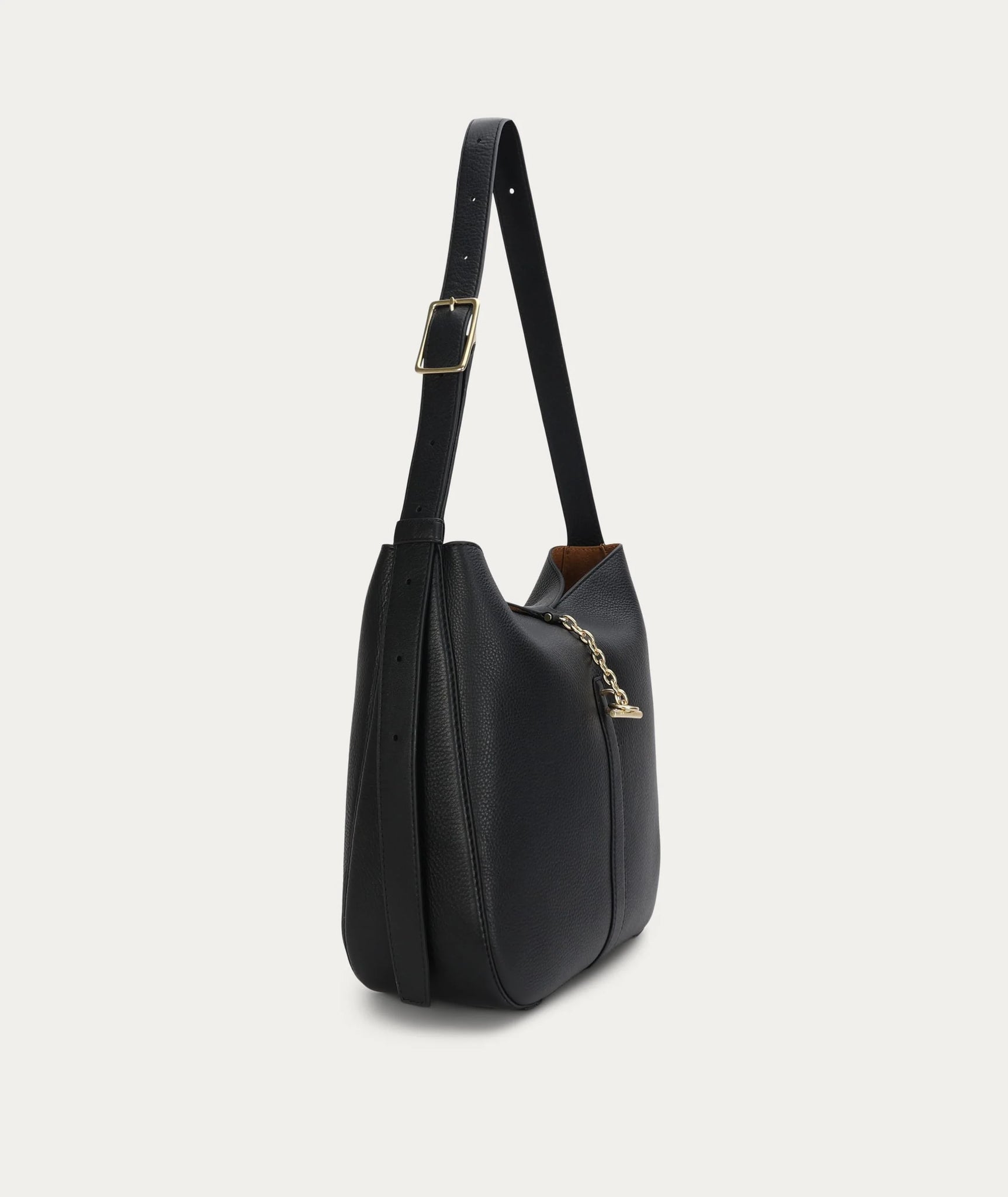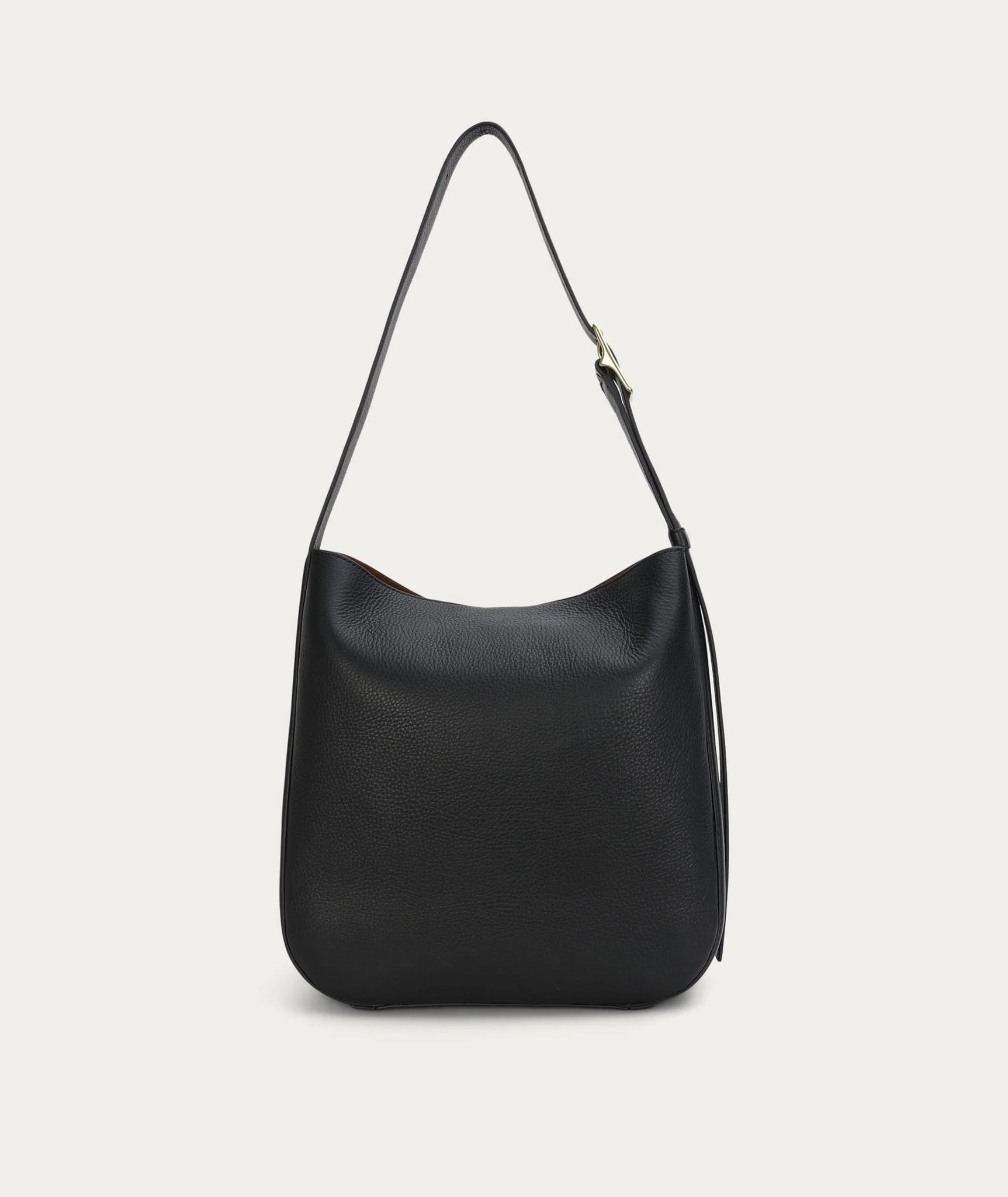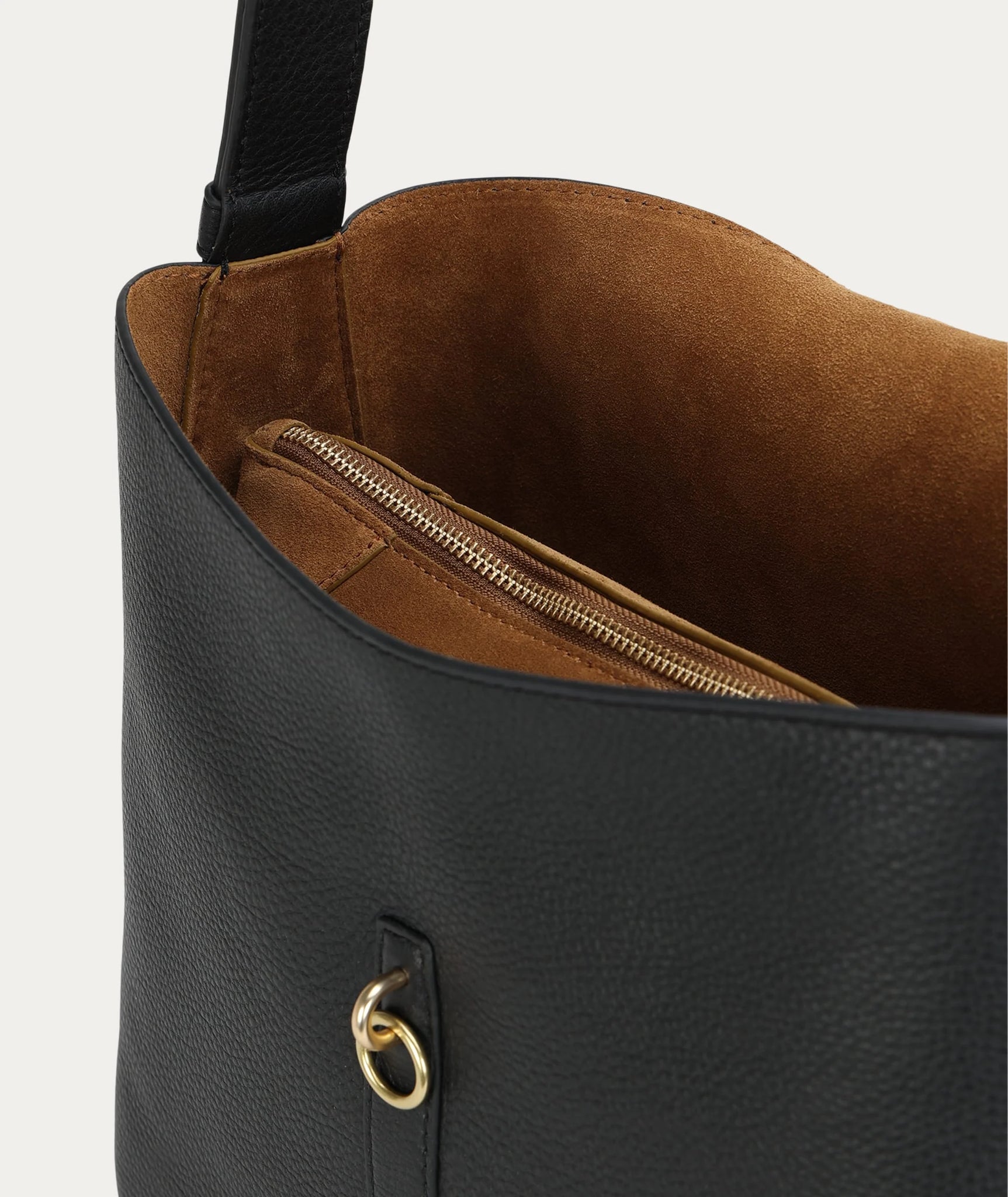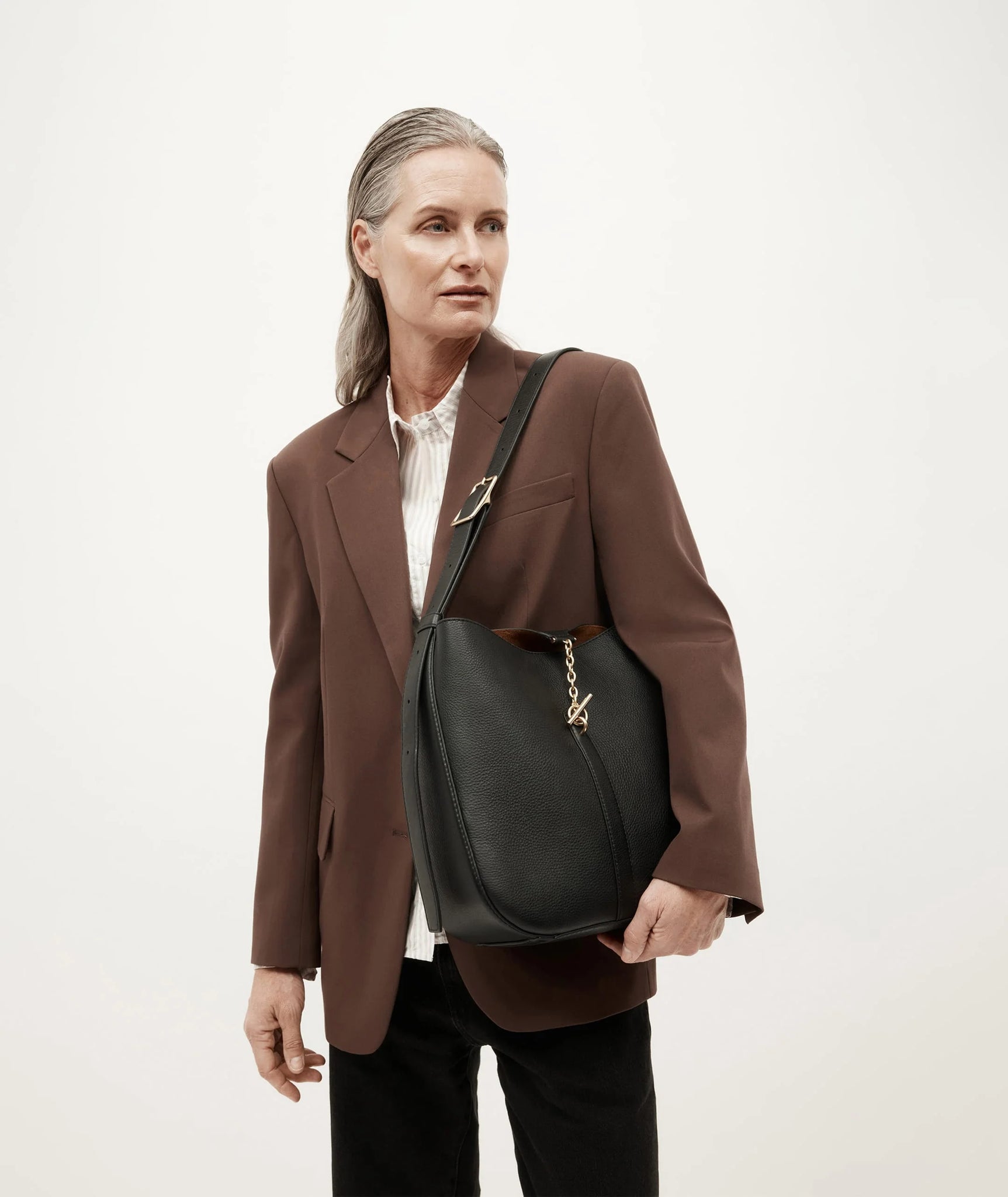 Mr Foldabit in Black is a structured tote, crafted from Calf Nappa with signature brass detailing. He features a chain and T-bar closure, an adjustable strap with a distinctive buckle, and a velvety suede interior with a detachable zip pouch.