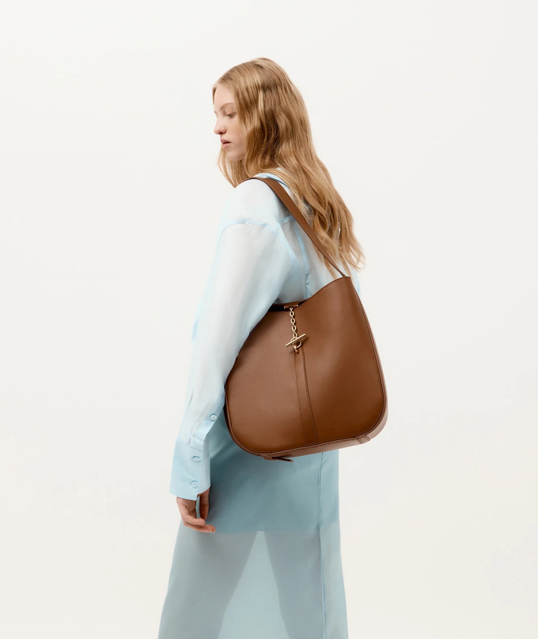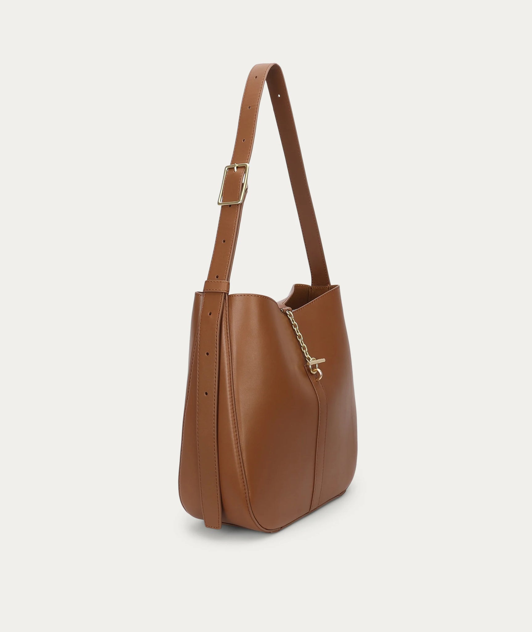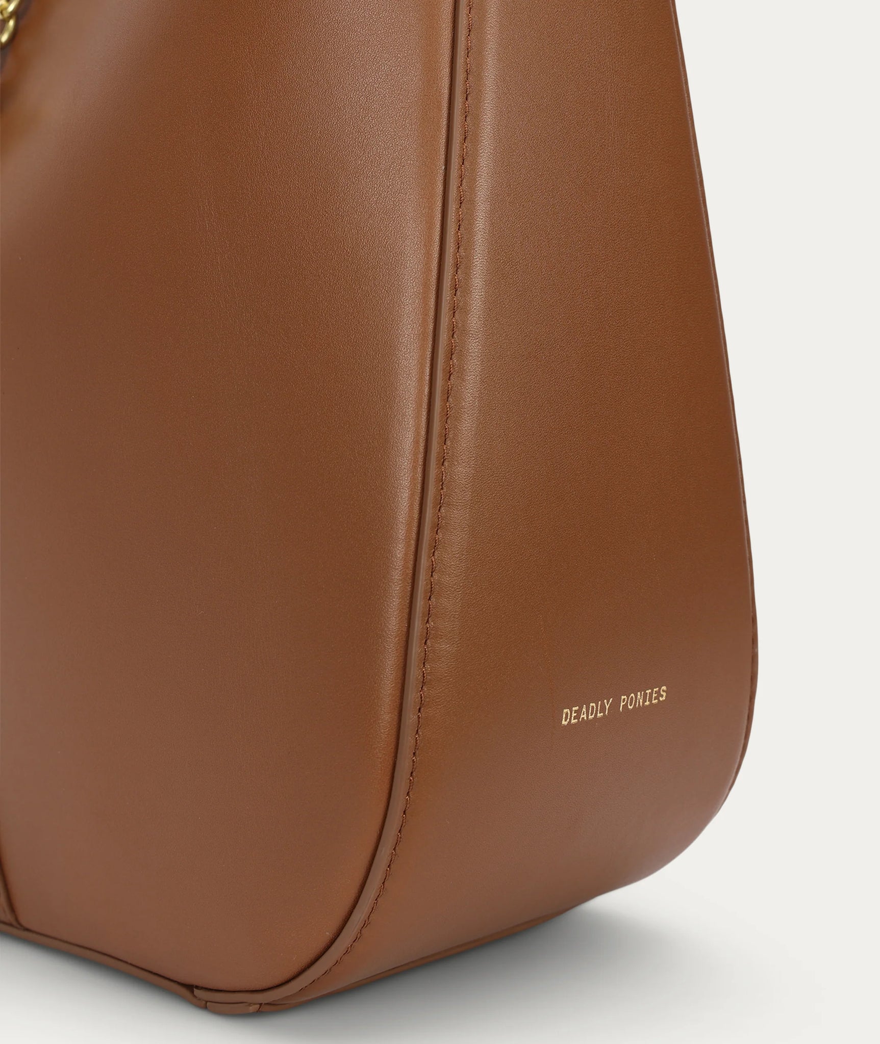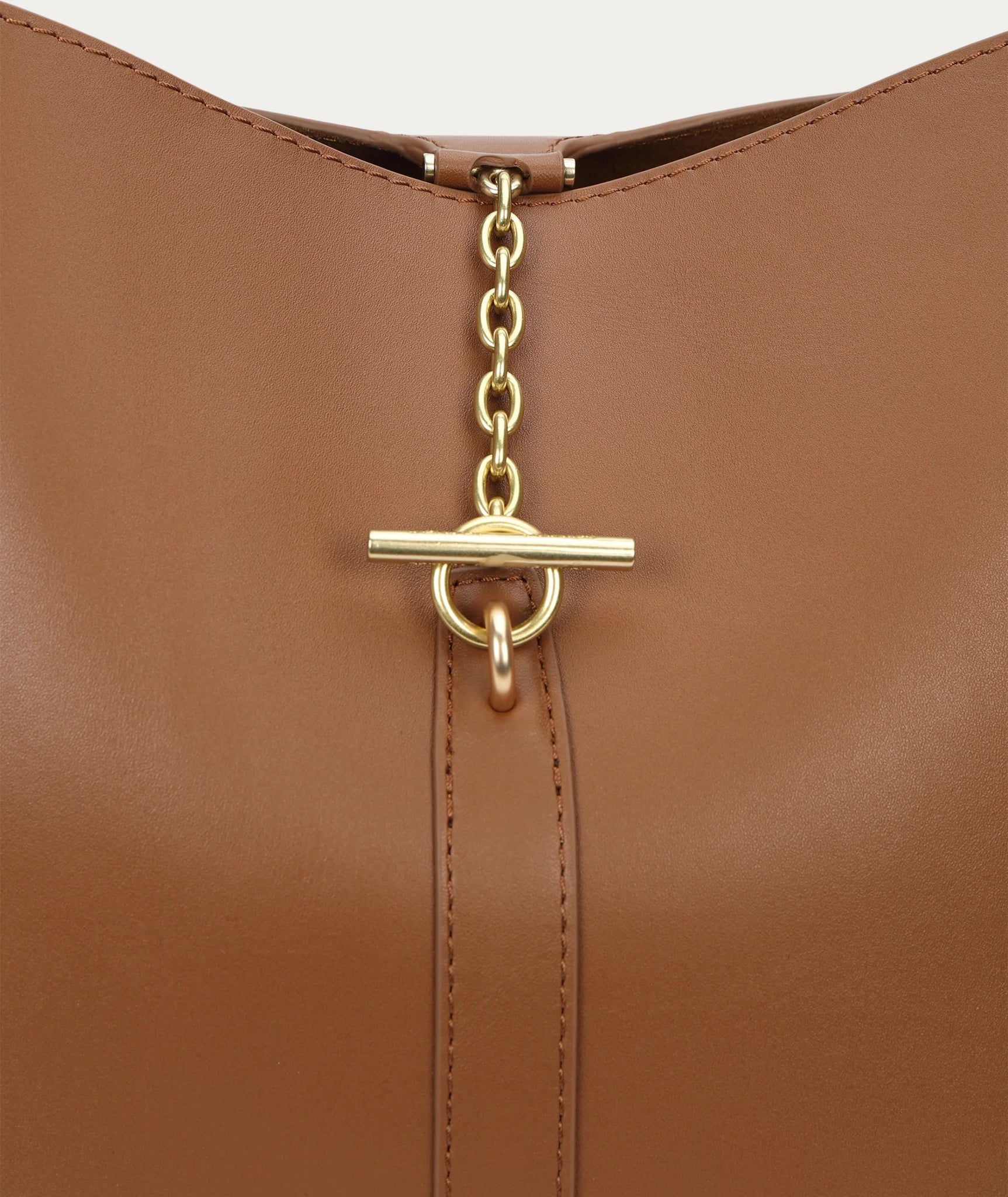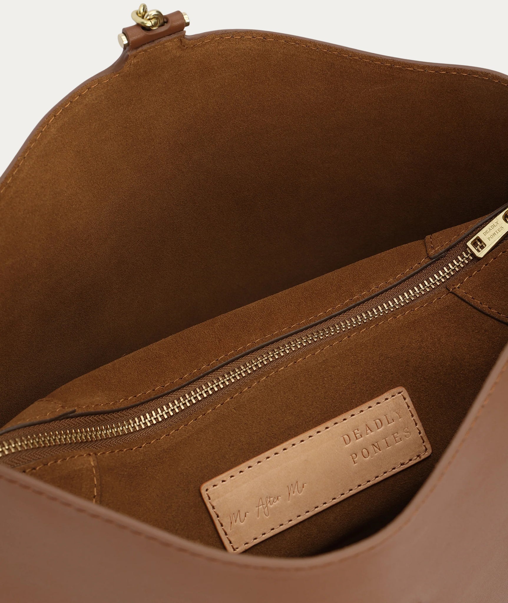 Mr Foldabit in Driftwood is a structured tote, crafted from Calf Nappa with signature brass detailing. He features a chain and T-bar closure, an adjustable strap with a distinctive buckle, and a velvety suede interior with a detachable zip pouch.