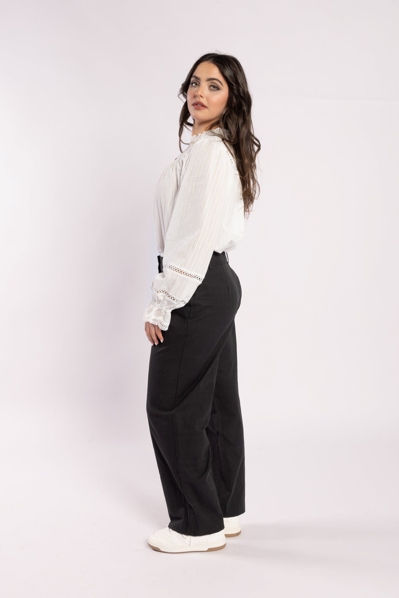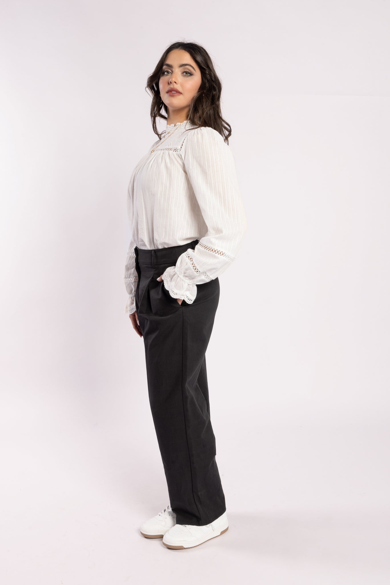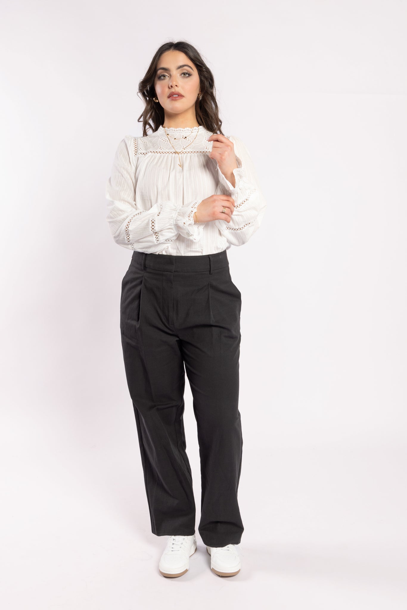 The Bon Jour Blouse by Drama the Label is an exquisite 100% cotton garment, featuring a sophisticated high neckline adorned with lace detailing. It includes a button closure at the back and long sleeves with elastic cuffs, enhanced by intricate lace accents. Pair it effortlessly with your preferred Drama bottoms for a polished ensemble.