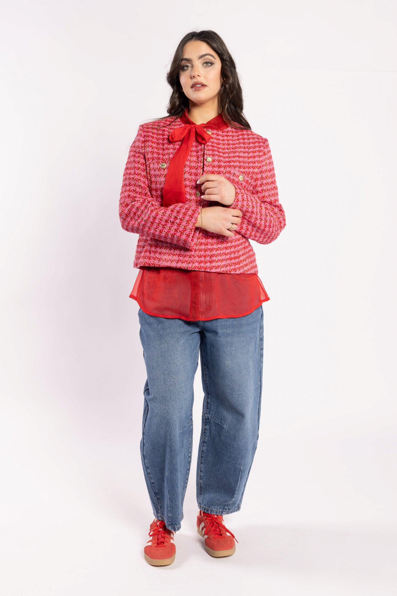 The Seine Blazer is a stylish statement piece designed in New Zealand for women who love effortless sophistication. This short women’s blazer features a crew neck, gold buttons, double front pockets, and a fully lined finish. Crafted in a pink and red herringbone check with subtle metallic threads, this blazer adds a polished, modern touch to any outfit — perfect for dressing up or layering for a chic everyday look.