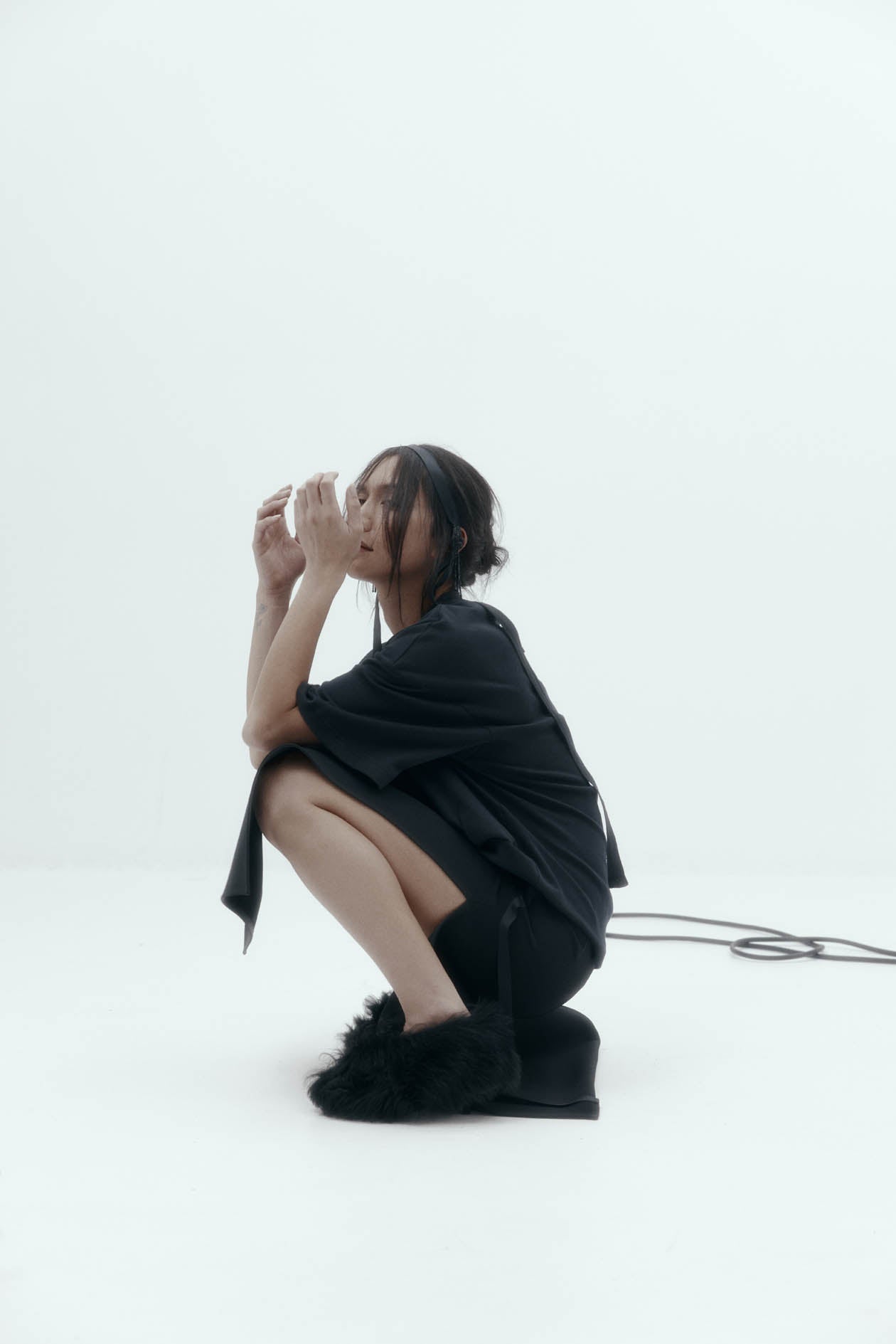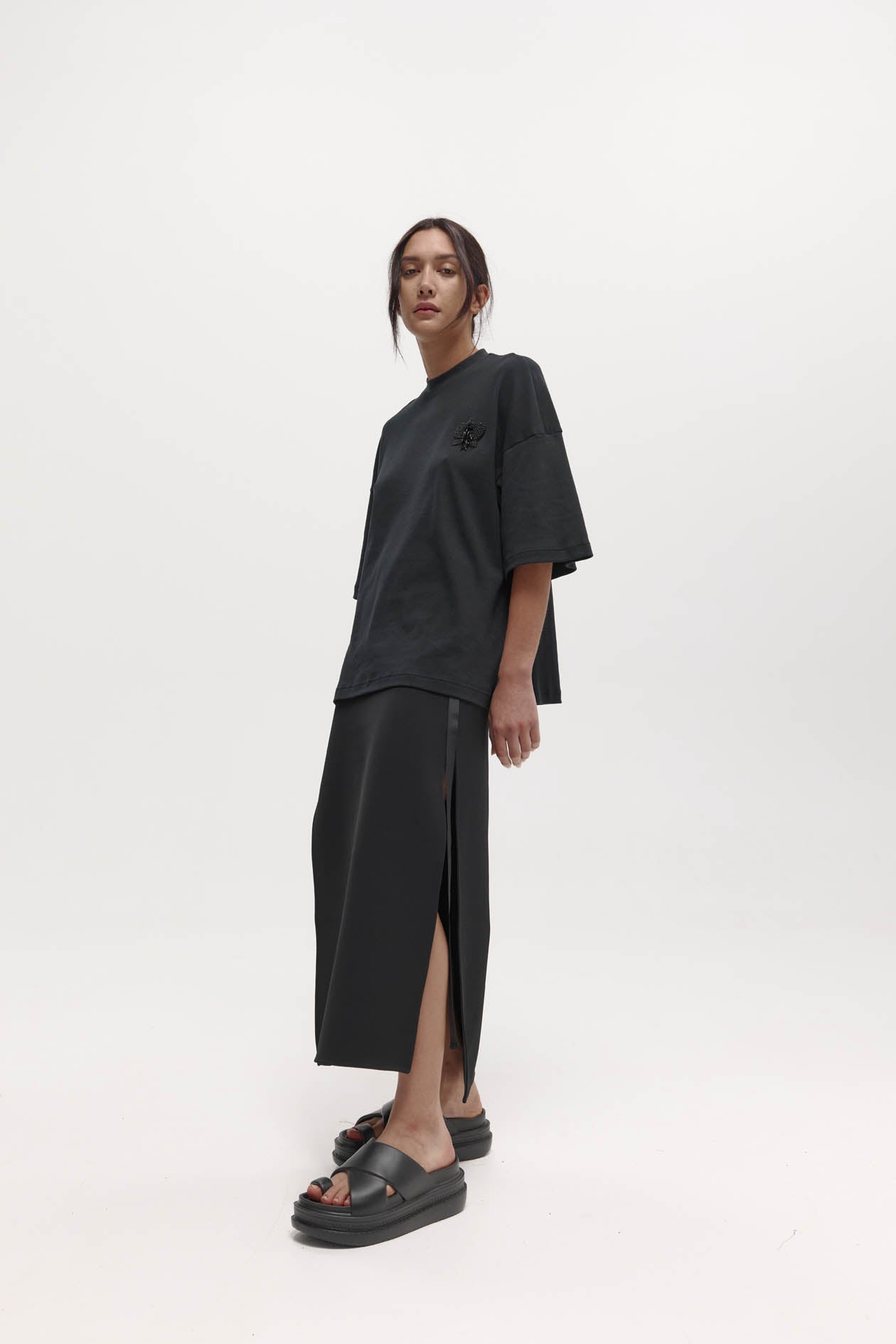Cut from Cotton T-shirting with dropped shoulders and elbow grazing sleeves for an intentionally oversized fit. Signature black orchid beading embellishes high on the left chest.