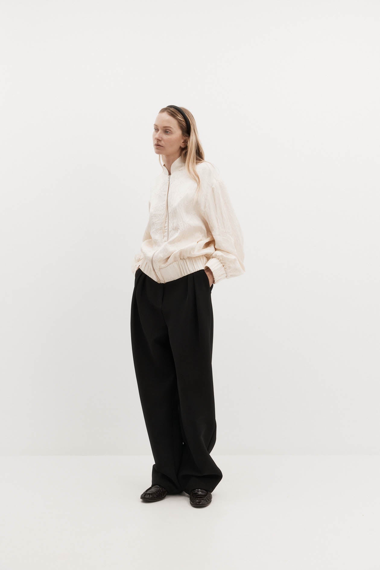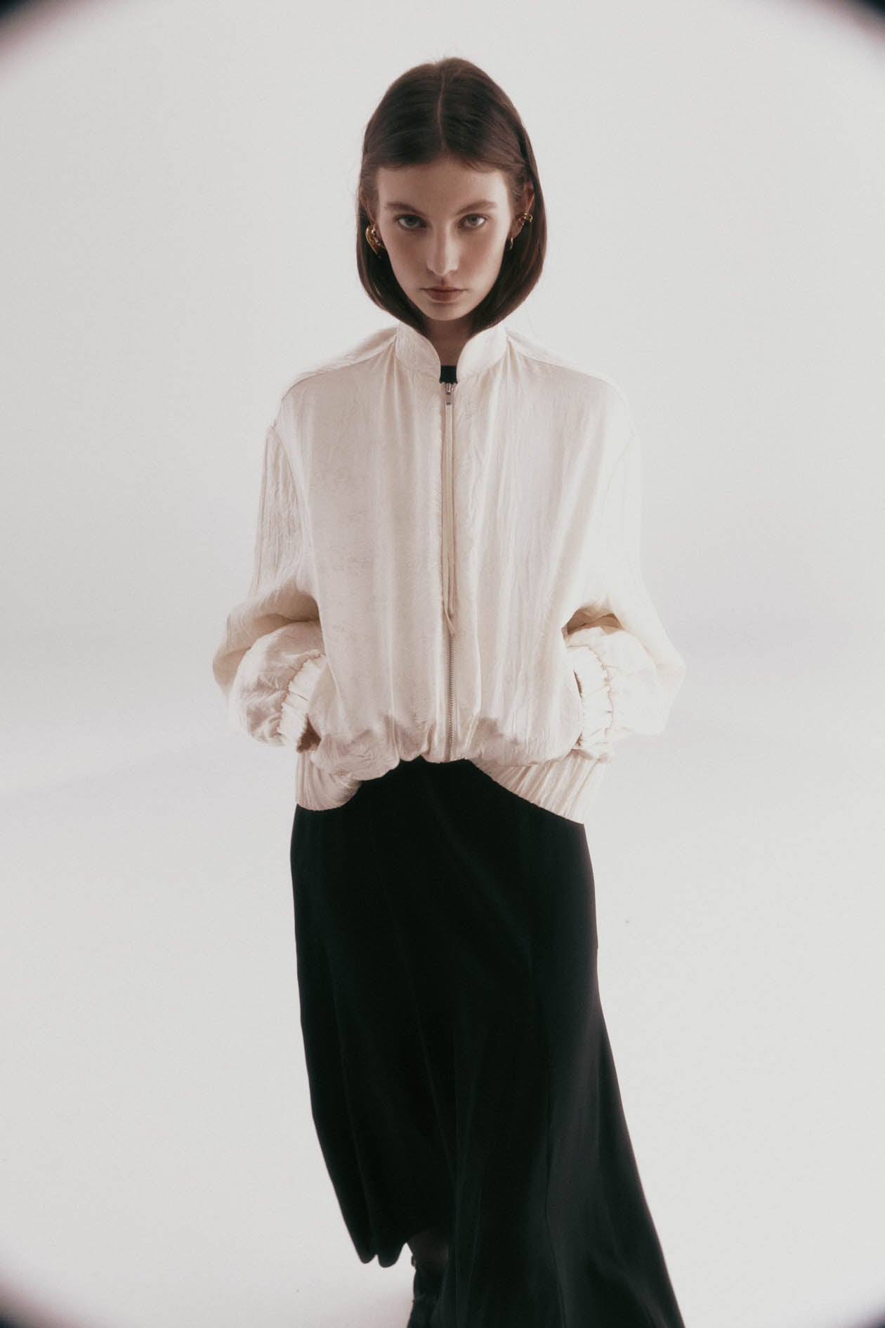 A lightweight bomber cut in black satin jacquard featuring a band collar, front pockets and tassel zip. Fully lined. Fabric is finished with intentional creasing.