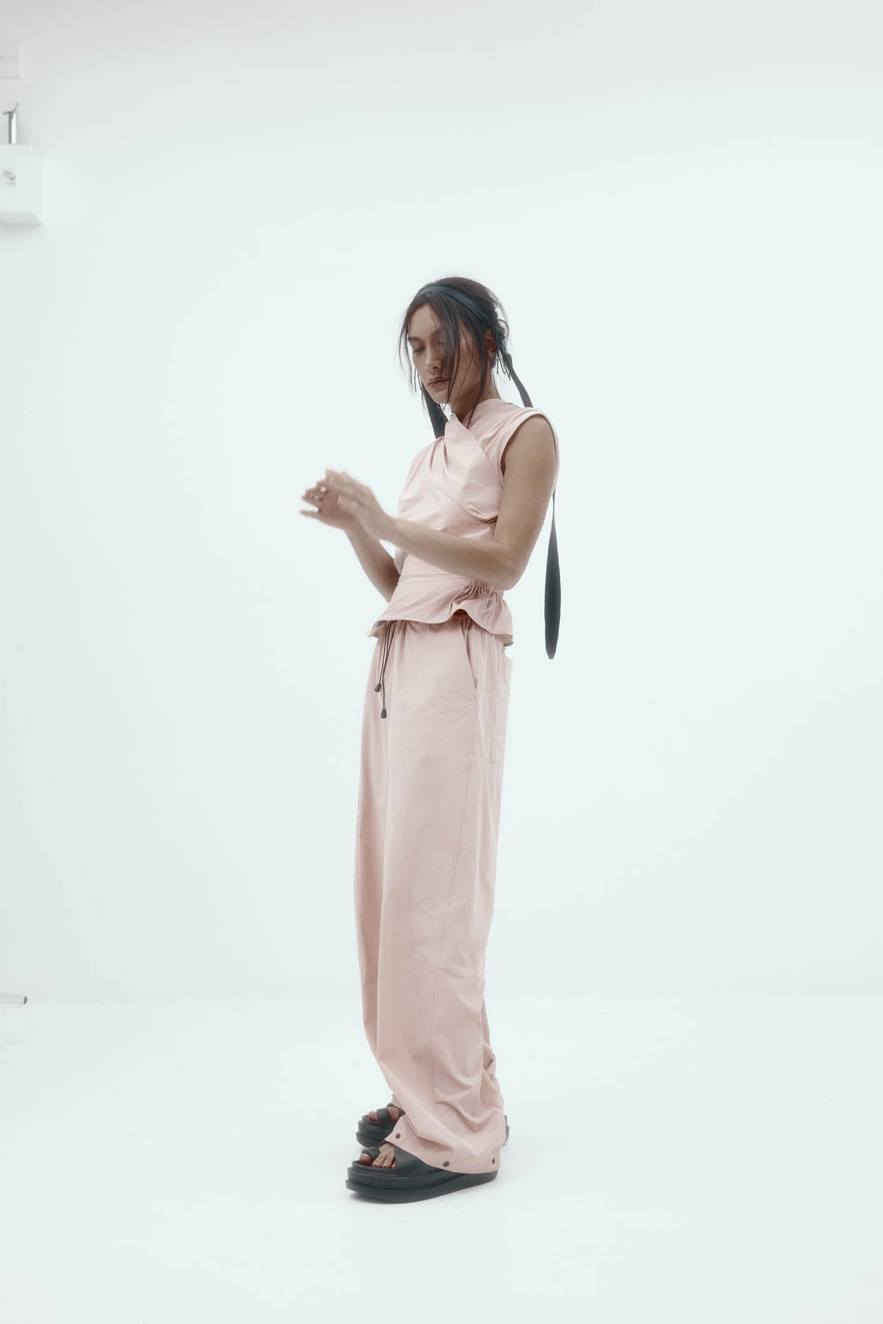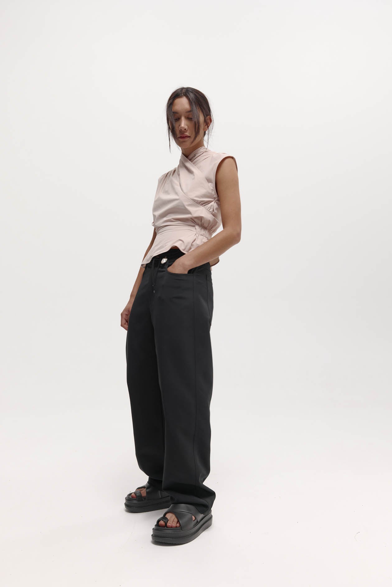 Echoing sculptural forms, a sleeveless wrap top in stretch nylon with gathered shoulders and draping across the front. Elasticated waist adds shape and ease through the silhouette.