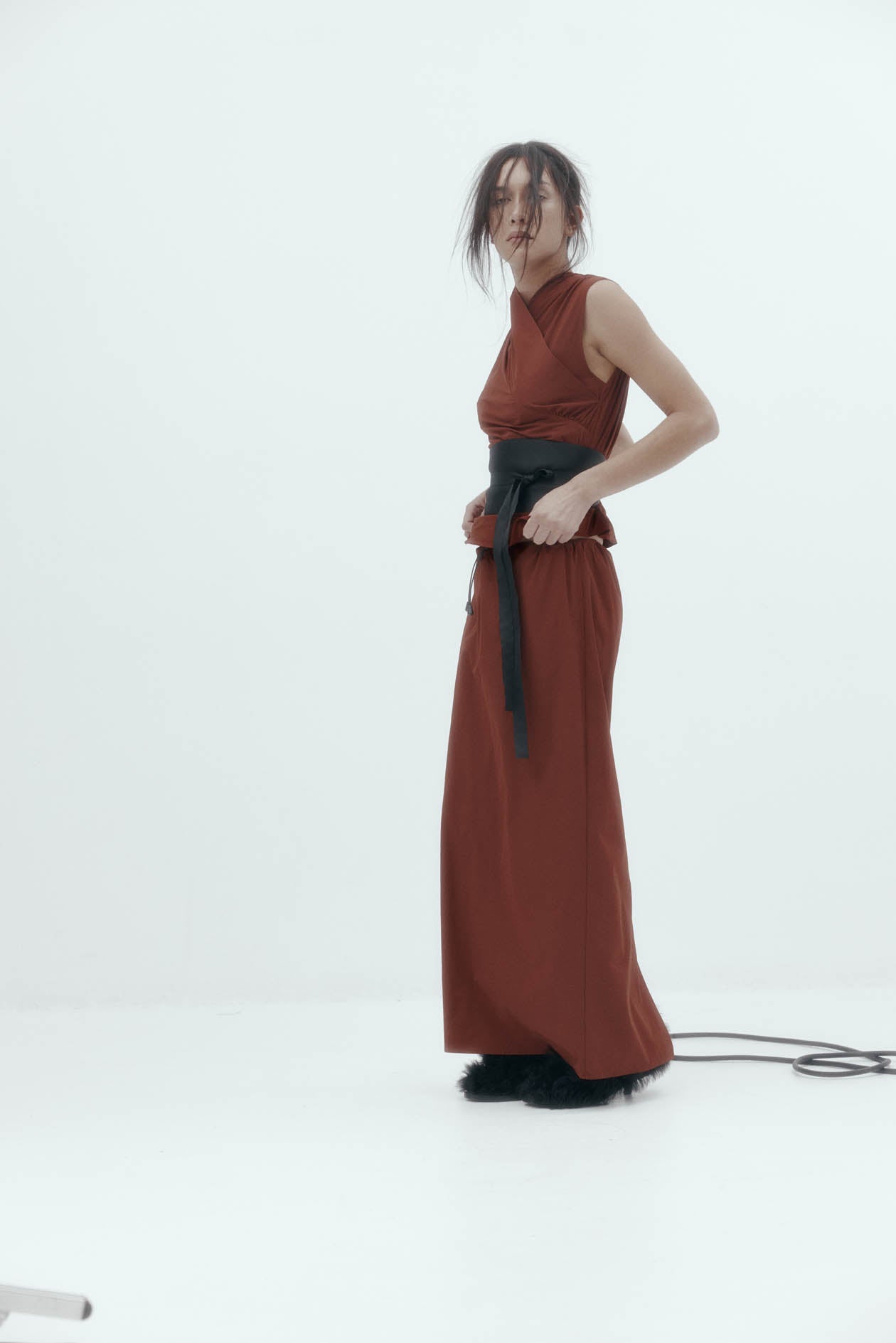 Echoing sculptural forms, a sleeveless wrap top in stretch nylon with gathered shoulders and draping across the front. Elasticated waist adds shape and ease through the silhouette.
