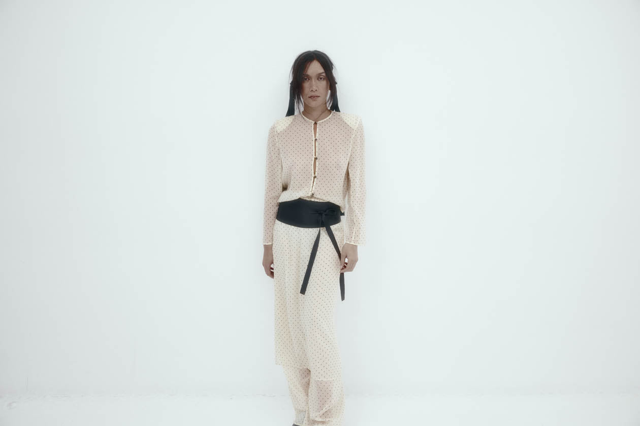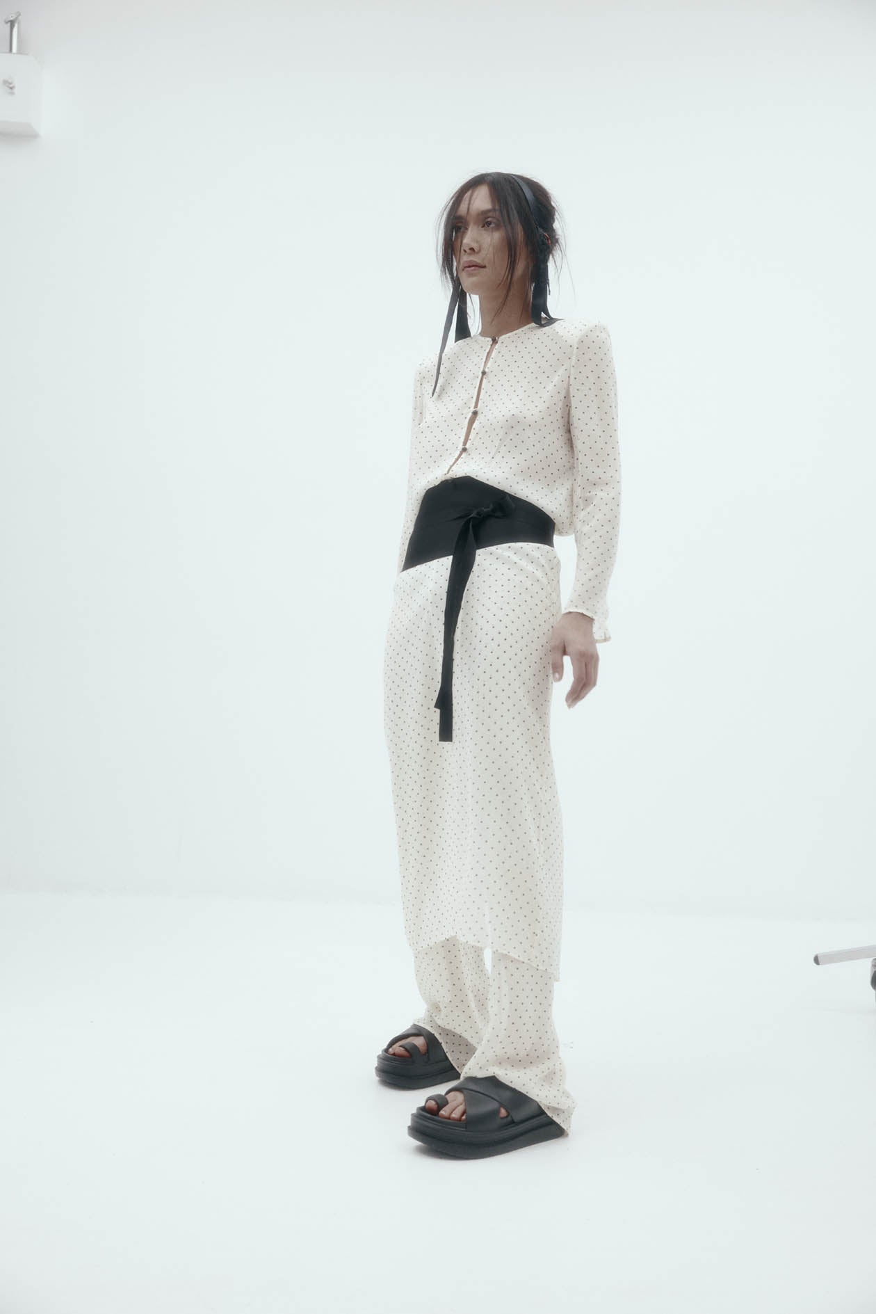 A cropped, long sleeve button-front blouse cut in sheer cream silk chiffon with black polka dots. Subtle shoulder pads lend quiet structure to the fluid silhouette, while the collarless neckline offers paired back elegance.