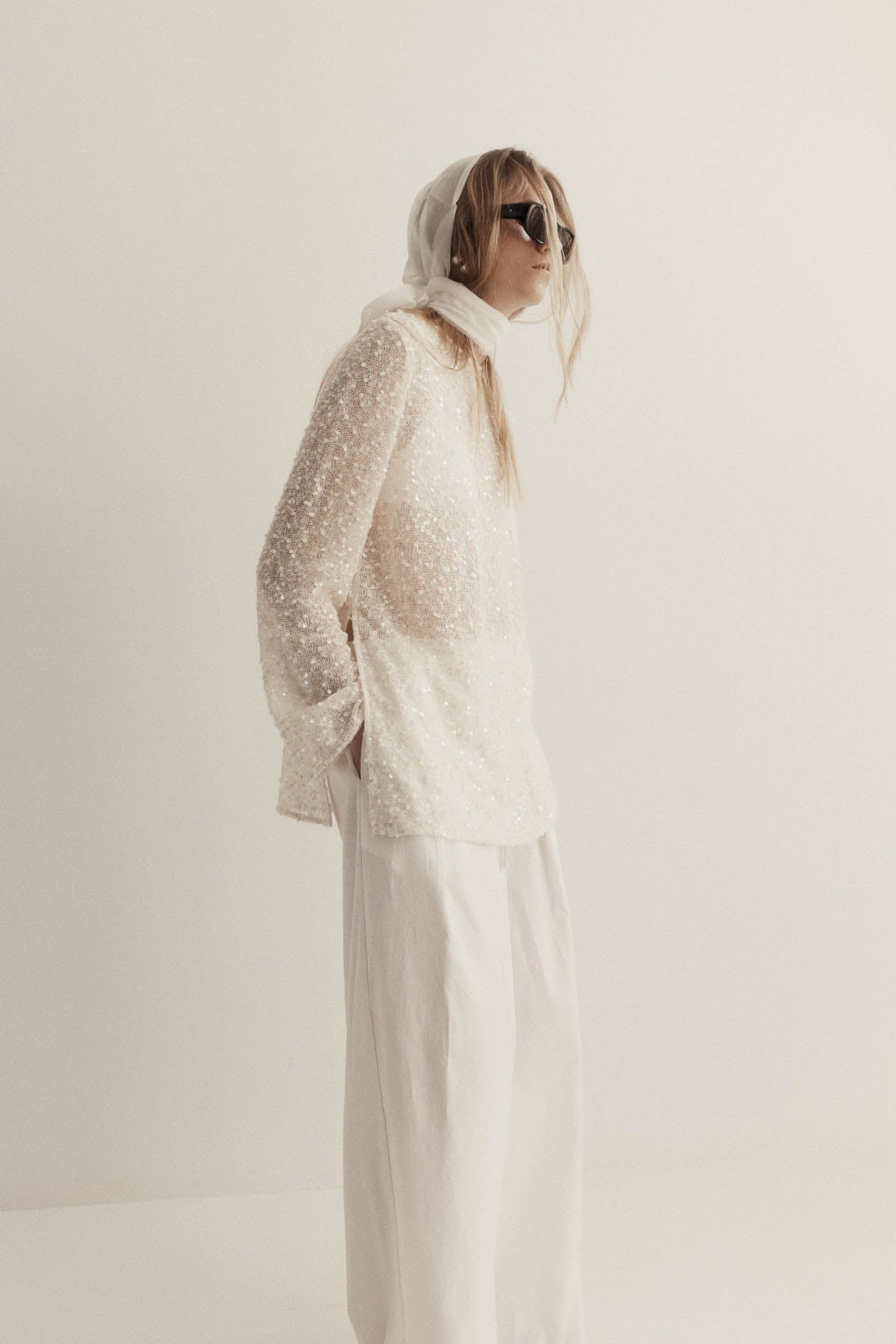 A relaxed silhouette crafted in a sheer sequin knit. Featuring long sleeves and a button closure at the centre back, this piece offers subtle shimmer with an effortless drape.