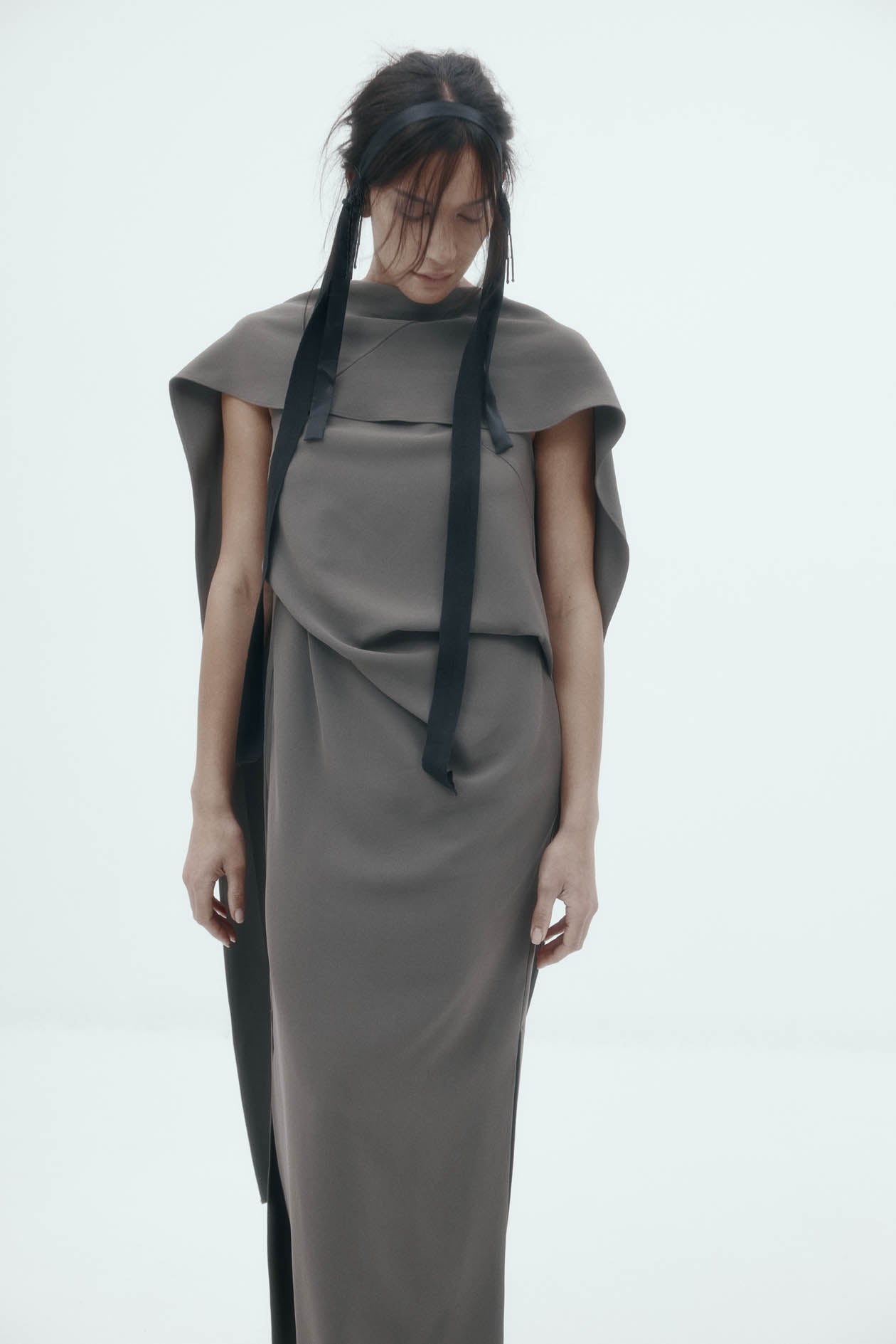 A floor length silhouette with sculptural gathering at the waist falls elegantly in drape suiting. Sash detailing drapes across the shoulders, designed to cascade elegantly down the back or be tied into a soft, half knot.
