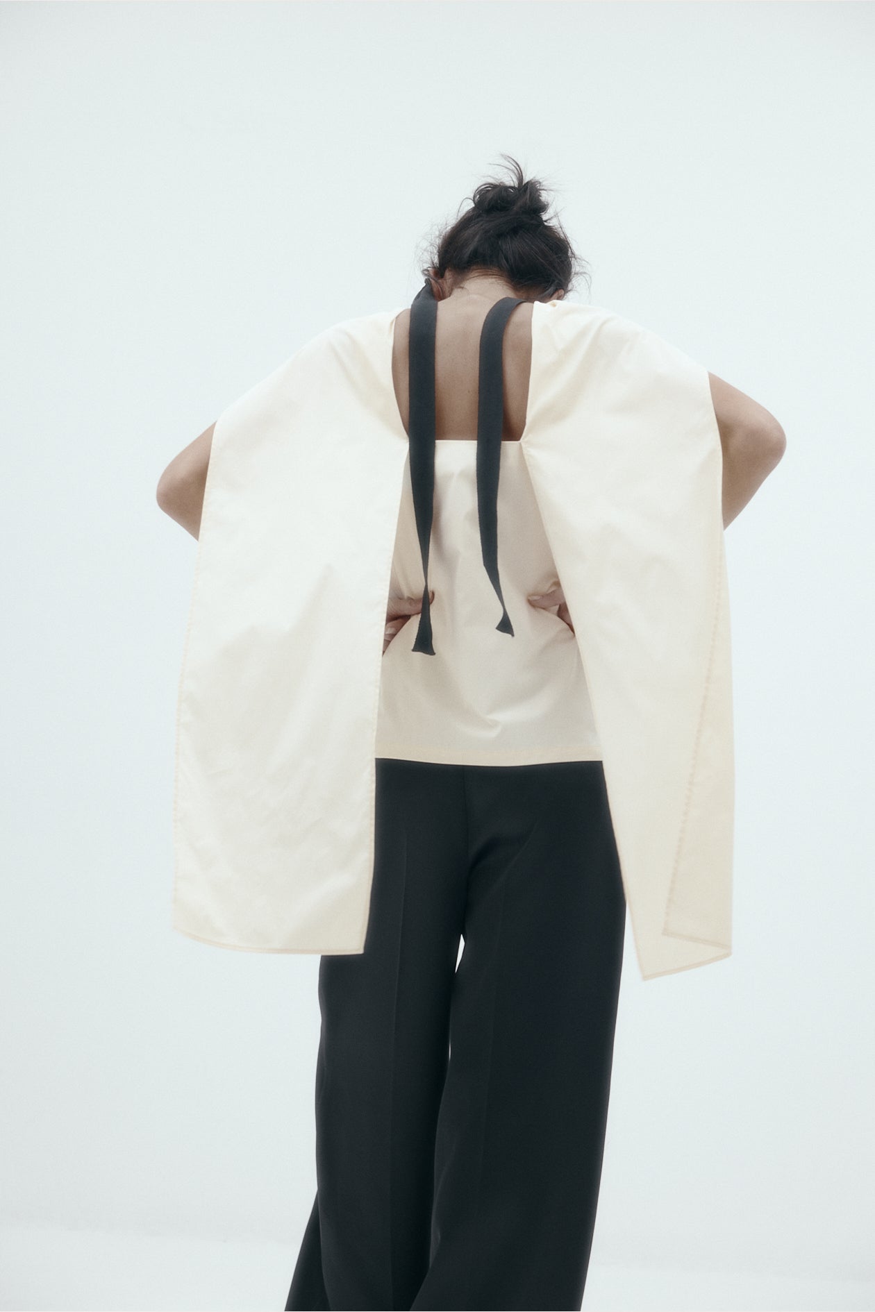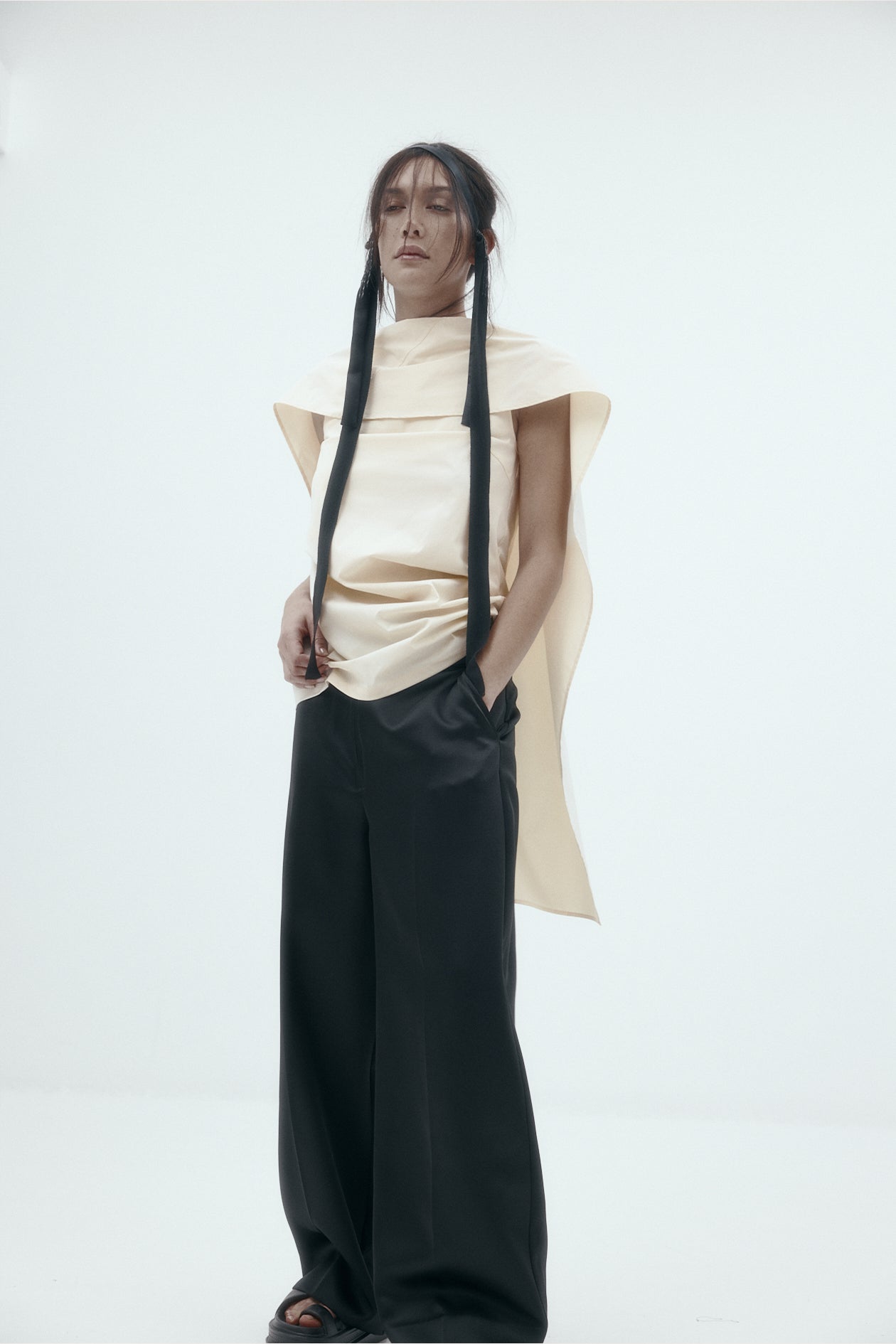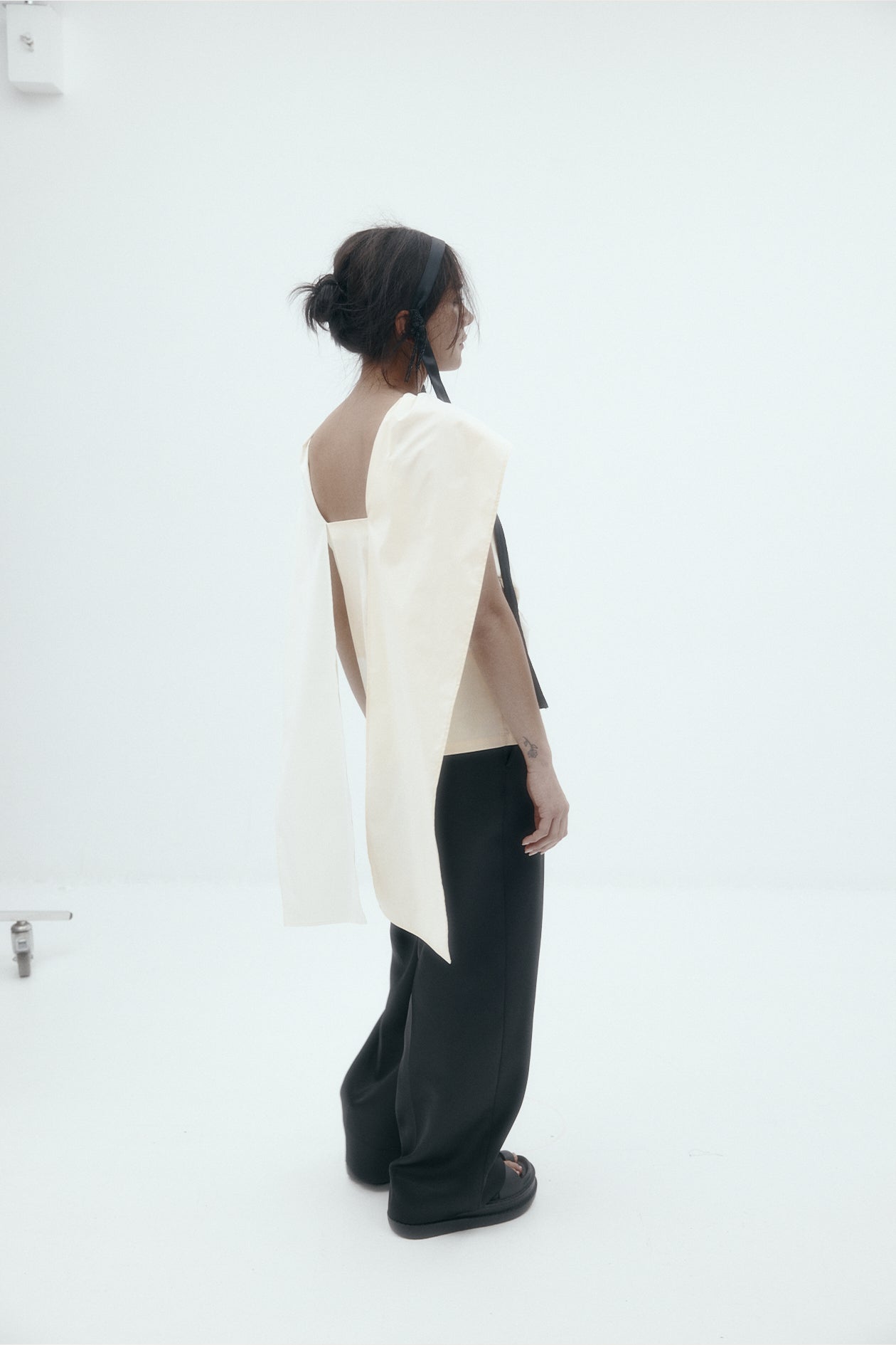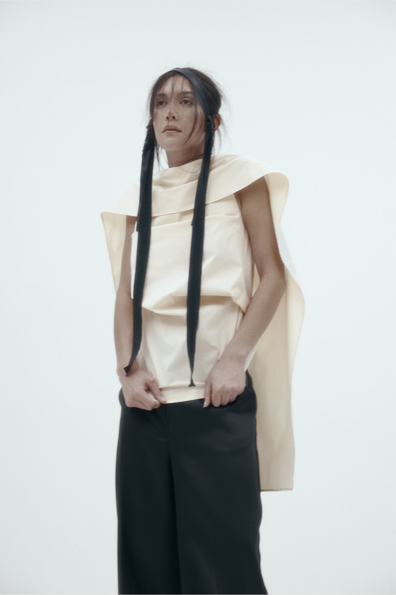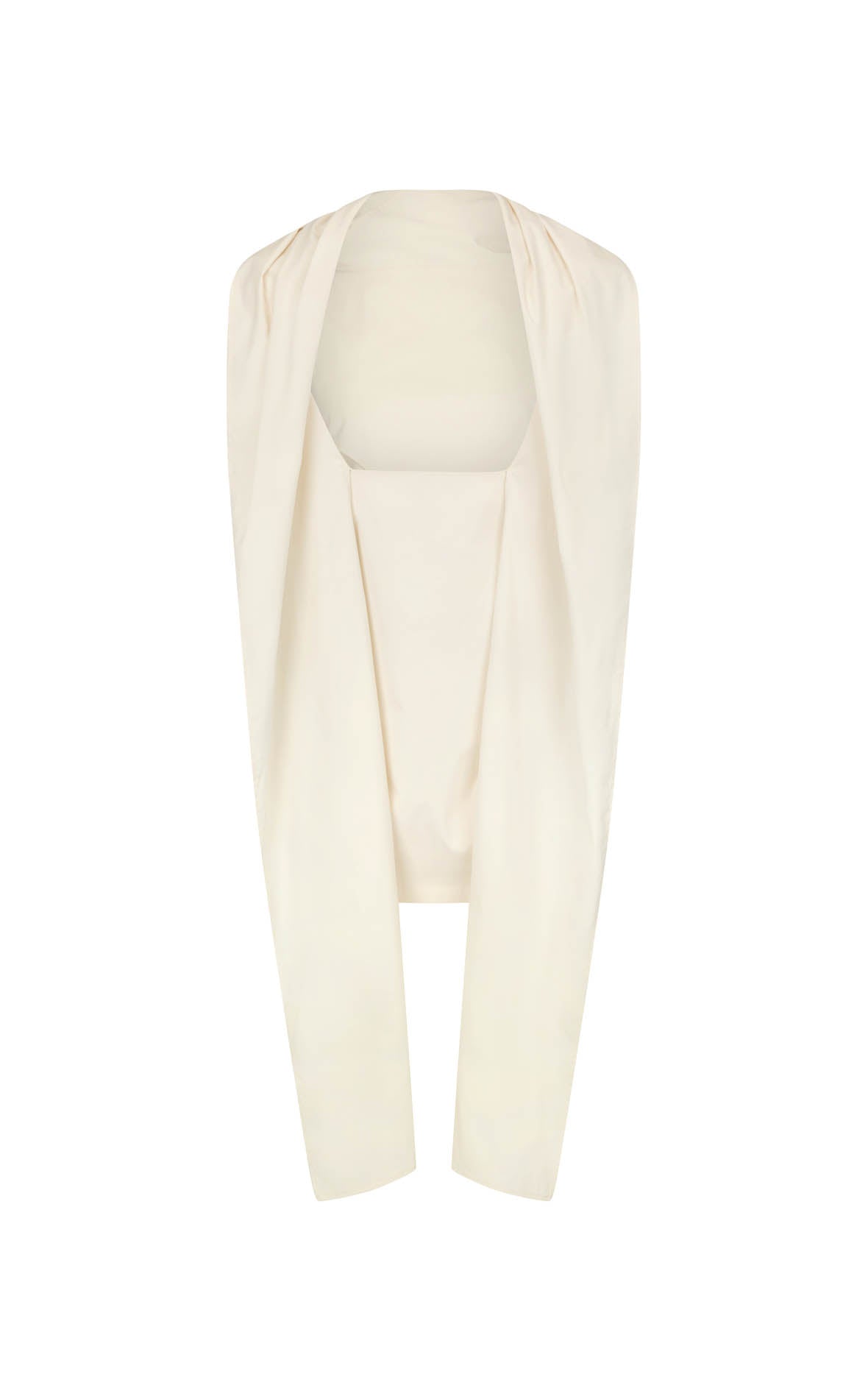 A sculptural silhouette built in tech taffeta with tuck detailing at the waist. Sash panels drape across the shoulders, cascading down the back or tying softly into a half knot.