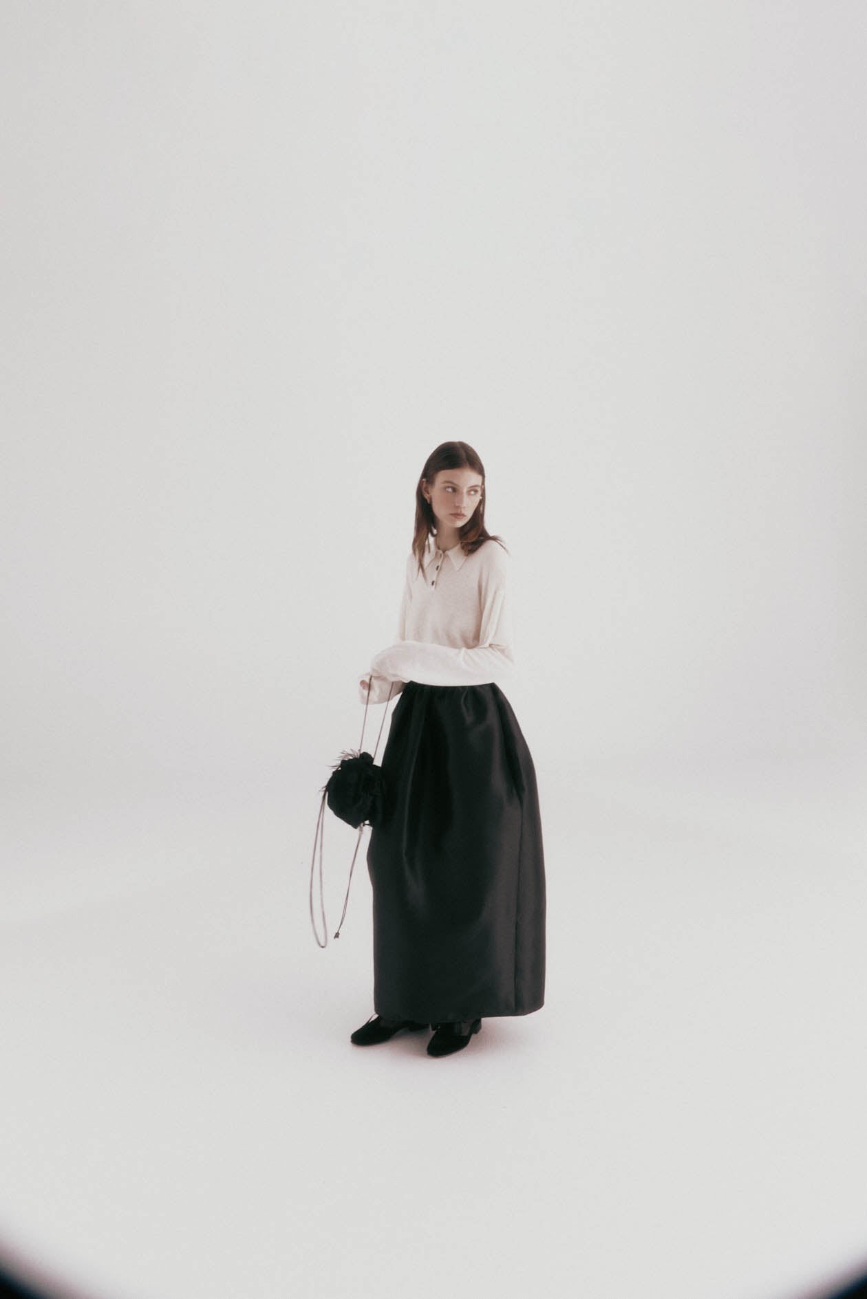 Cut in merino with a relaxed, longline silhouette. Features a pointed collar, three-button placket, and full-length sleeves.