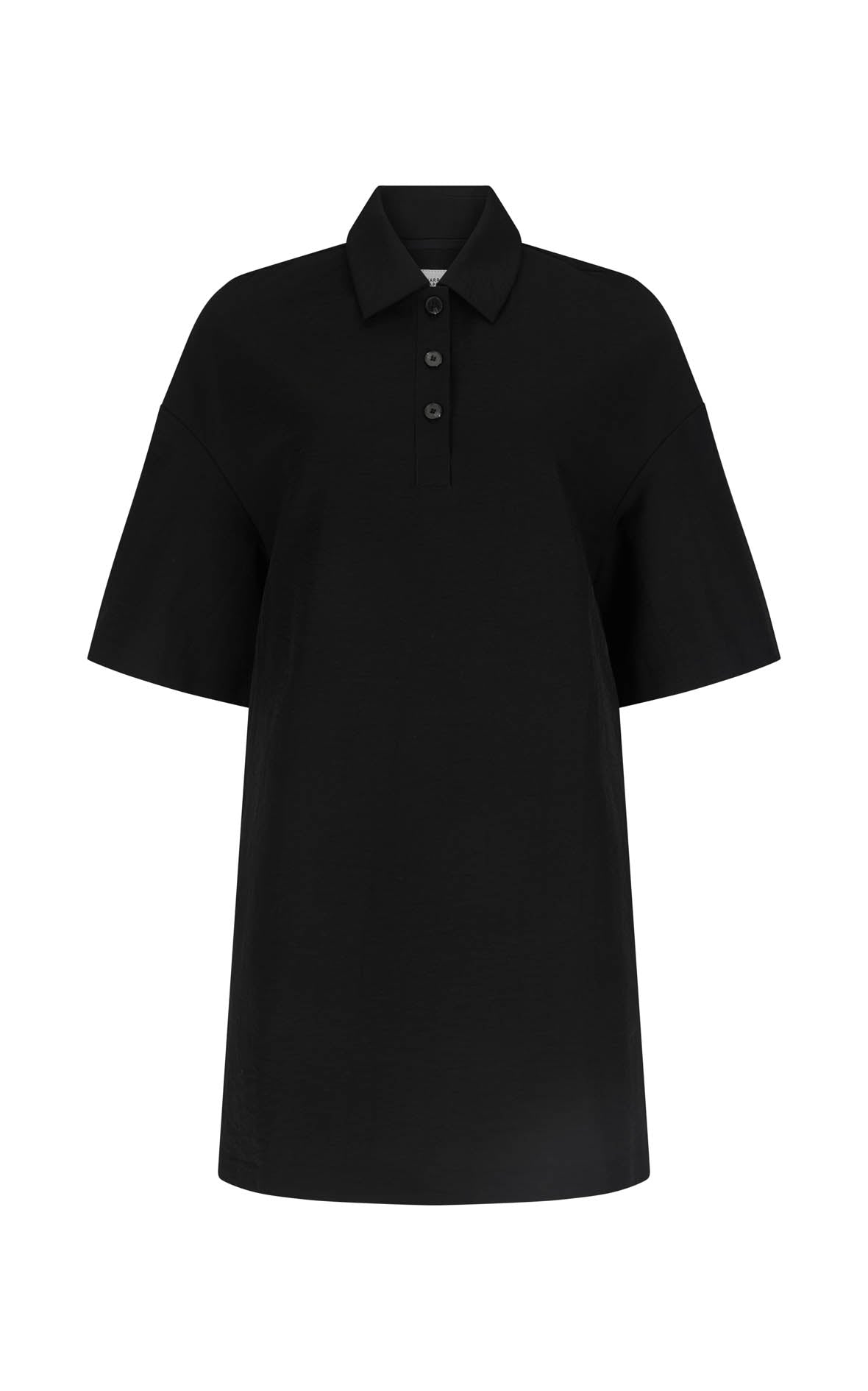 A short sleeve polo minidress with a relaxed silhouette in washed cotton. Features a pointed collar, three-button placket, and dropped shoulders.