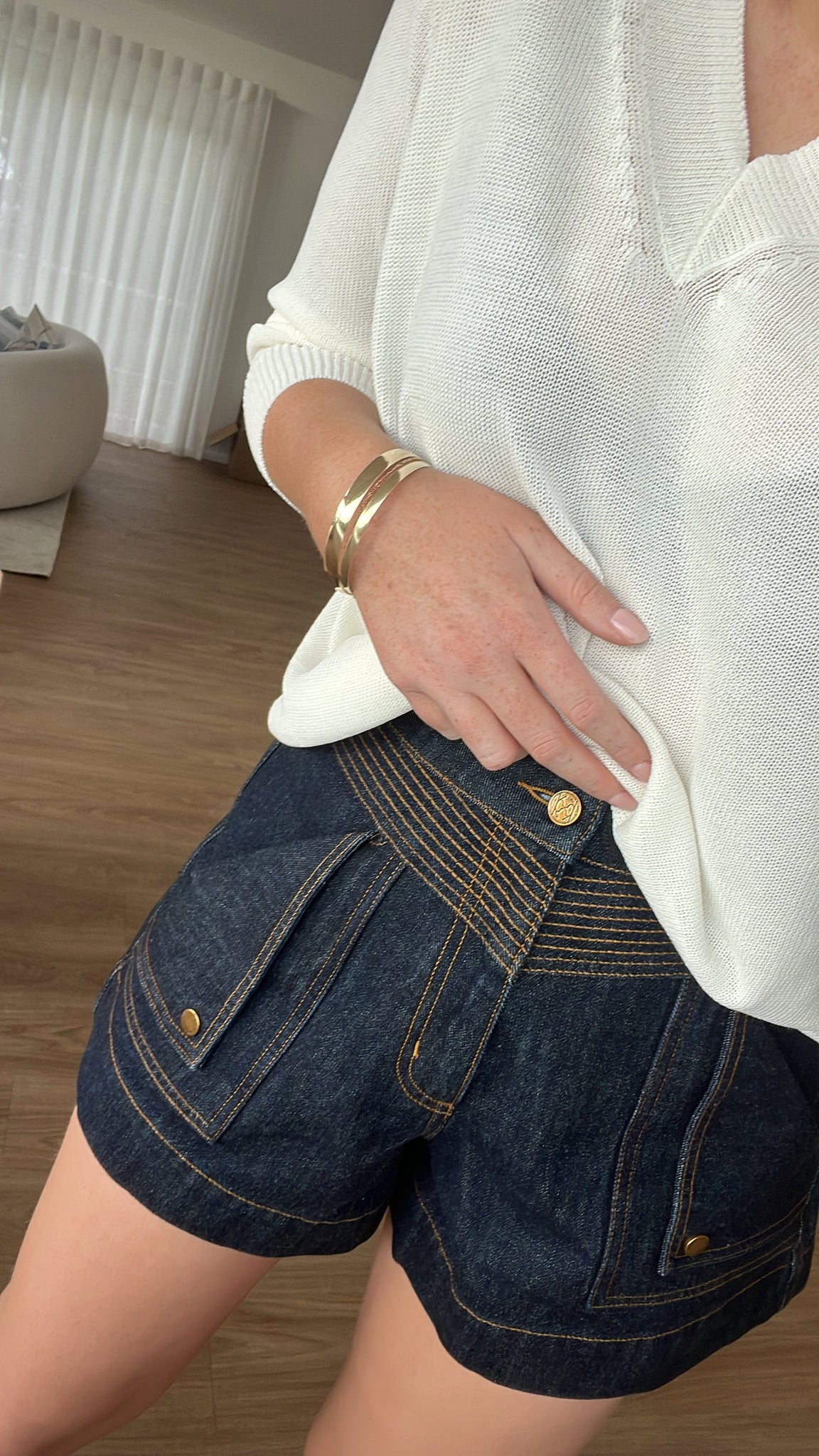 The Celene Short in indigo features contrast topstitching and panel detailing, front fold over pockets, complete with antique brass logo hardware.