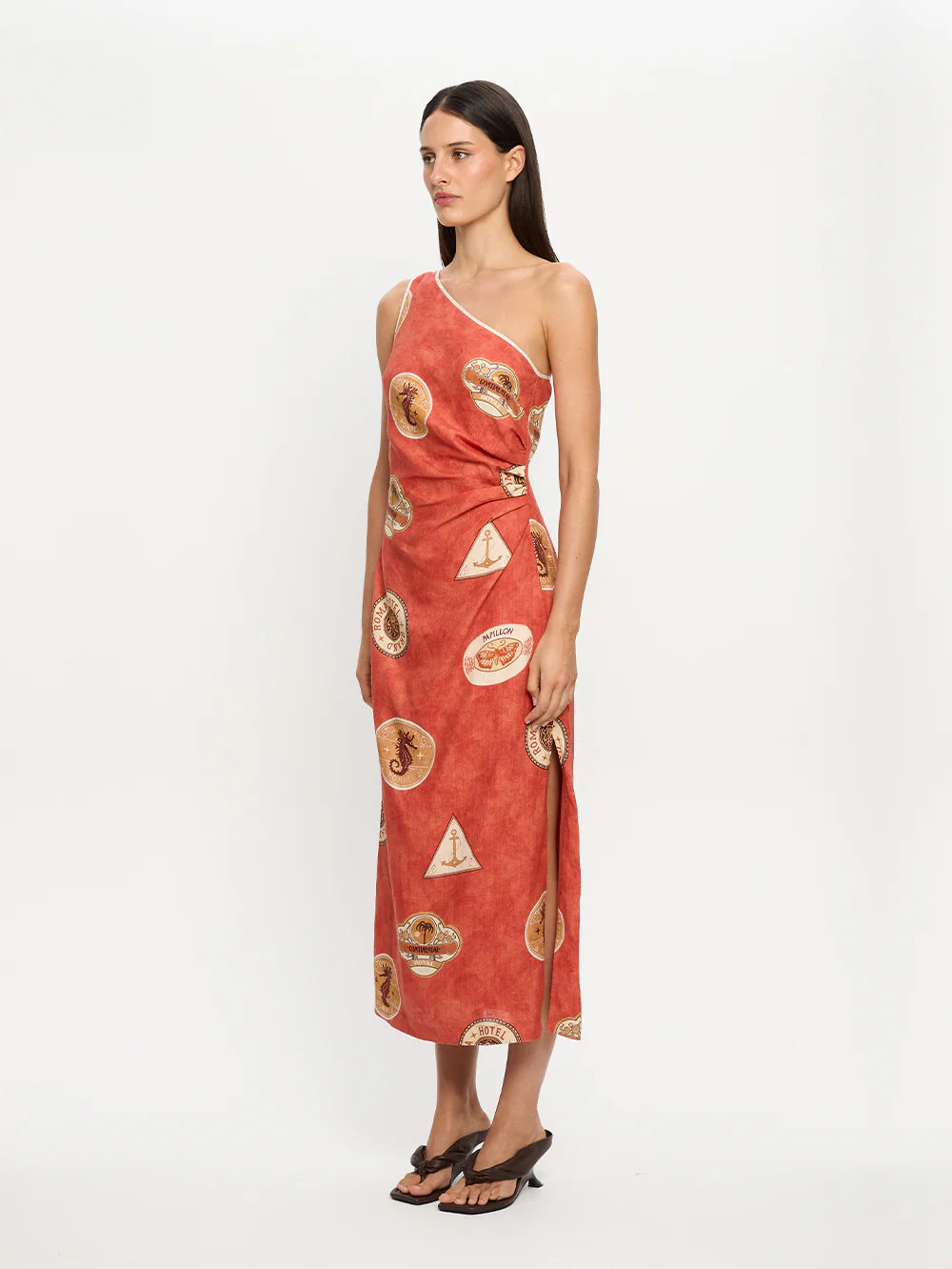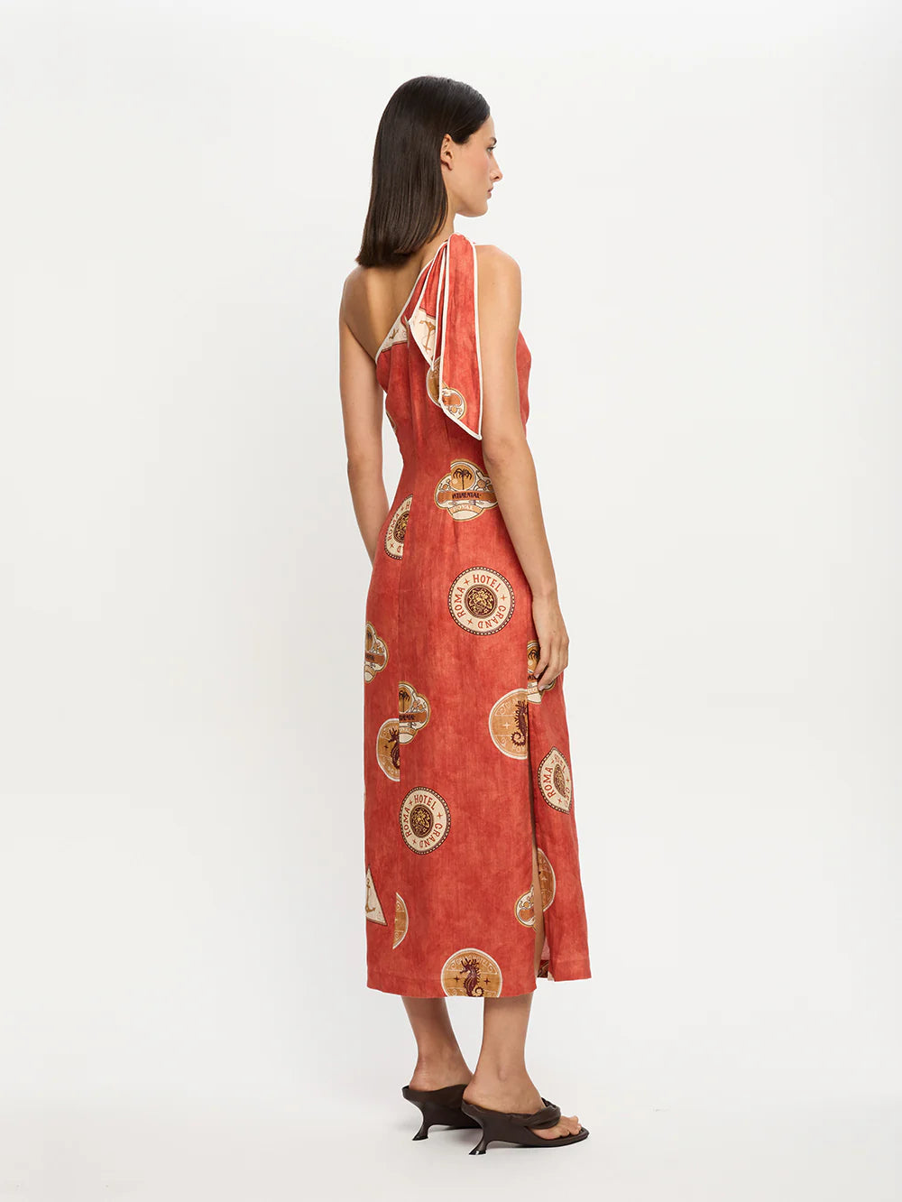Vacanza is vintage motifs set against a rich, warm red base. The Vacant Midi Dress features an asymmetrical neckline with adjustable tie, complete with a flared hem.