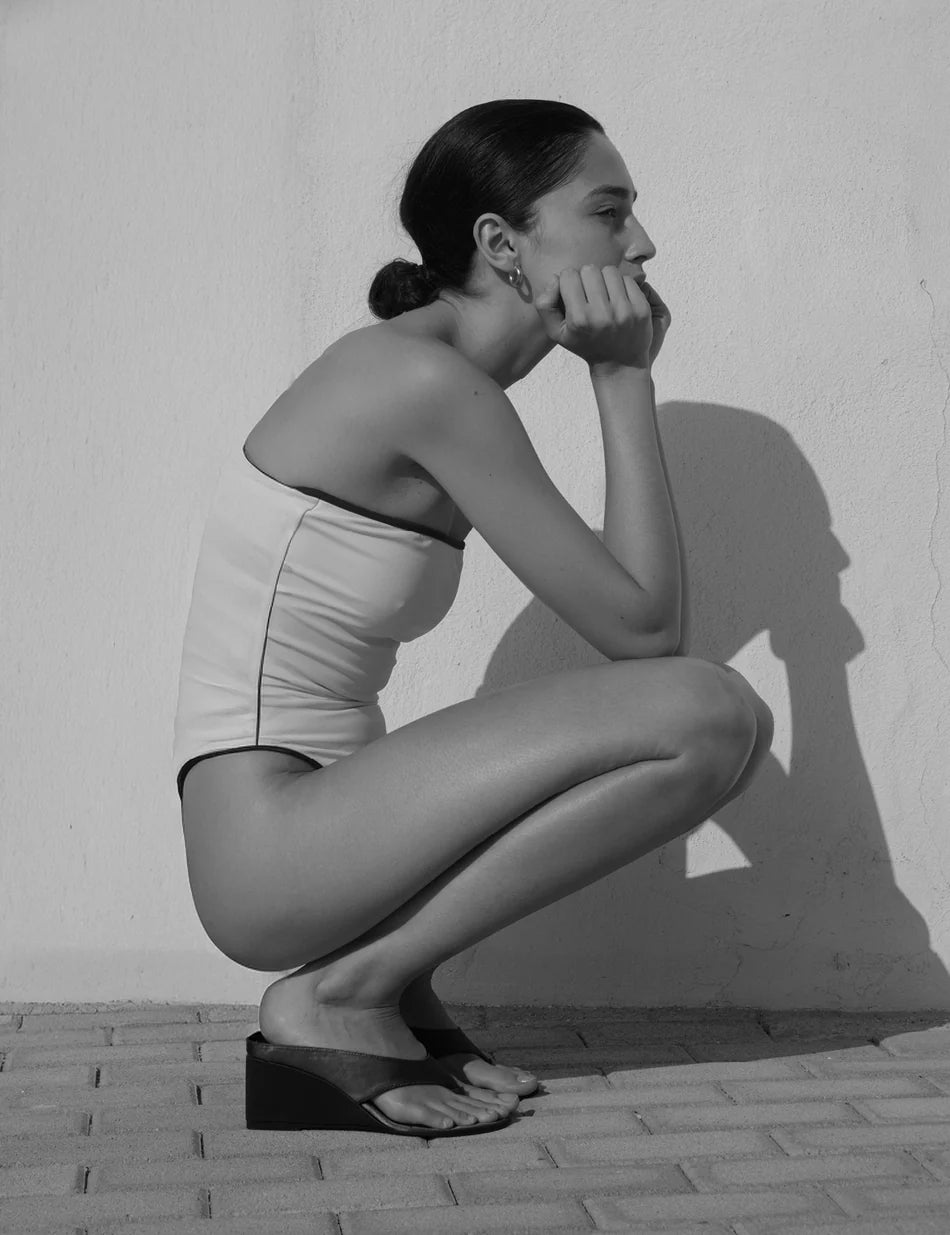 A refined study in proportion, the Wedge Thong pairs a sculptural silhouette with understated confidence, elevating the simplicity of a classic sandal. Smooth, minimal straps meet a clean, architectural wedge that feels modern, effortless, and quietly luxurious. Lightweight yet grounded, it brings a sense of poised ease to warm–weather dressing.