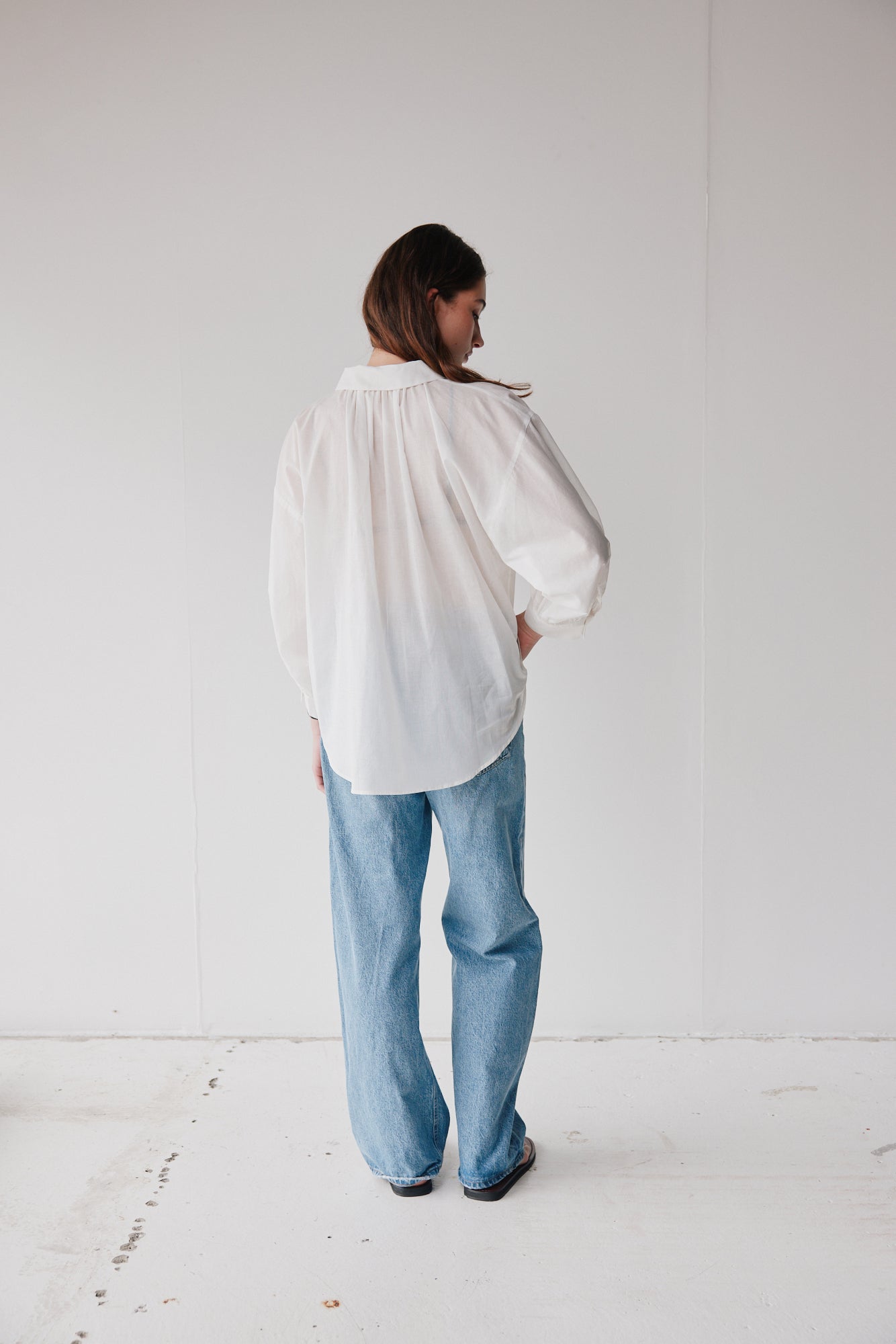 A relaxed-fit shirt with soft volume and ease. The curved one-piece club collar offers a subtle nod to the Peter Pan collar, while the clean stitched placket keeps the silhouette simple. Sleeves gather into a curved cuff, and the back hem dips gently, creating a modern, romantic shape. Finished with French seams, fine topstitching and shell buttons. Perfect with your hero denim.