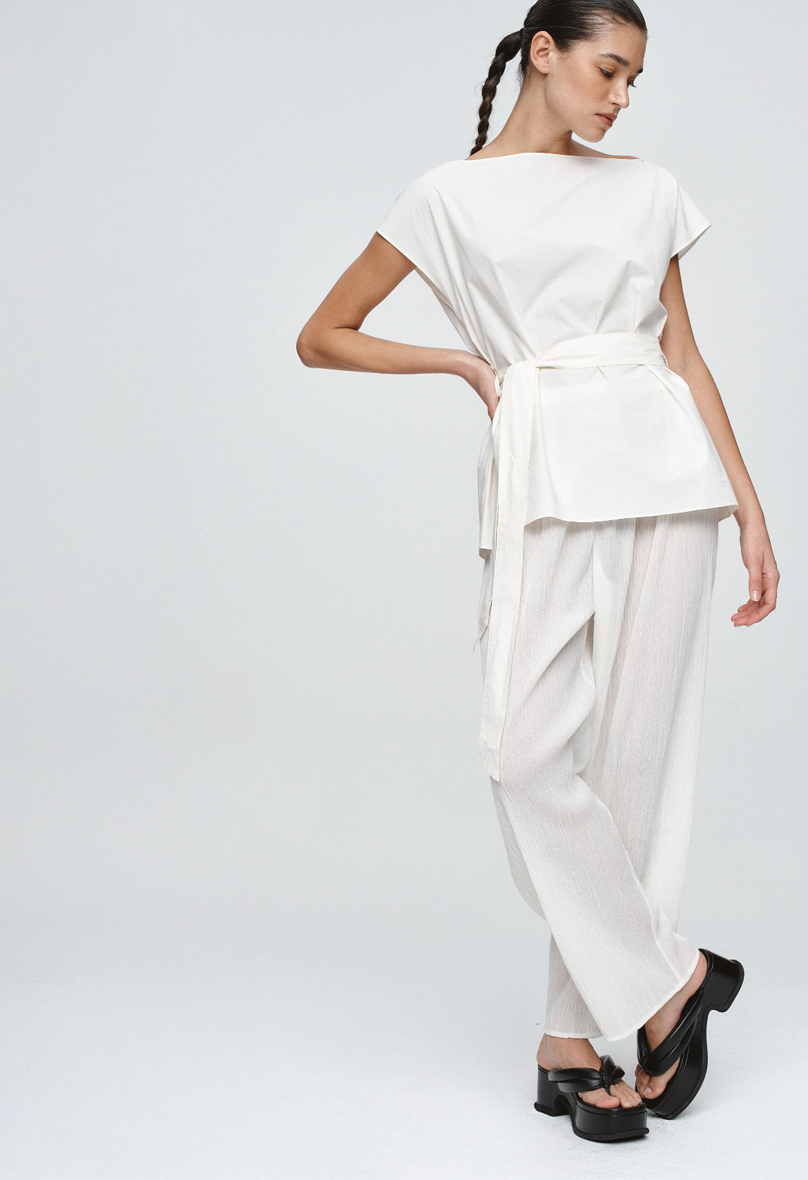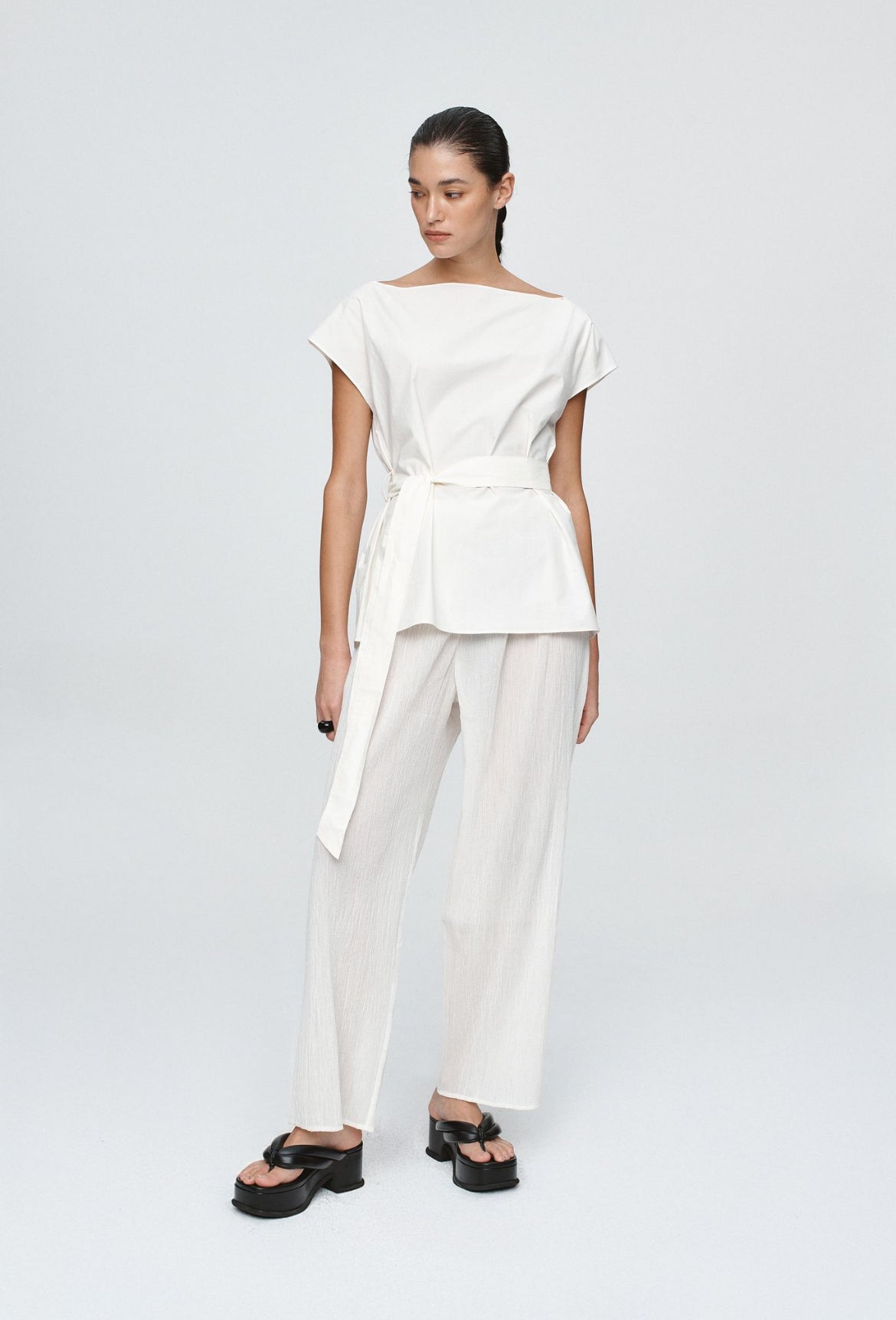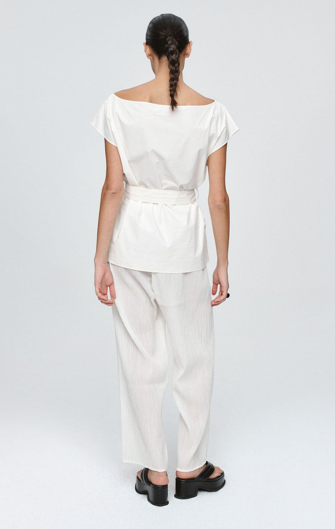 Sculptural yet softly undone, the Jude top is reimagined in a crisp cotton. Designed with an off-the-shoulder neckline and relaxed fit through the body. The waist is cinched with a removable self-fabric tie, threaded through narrow belt loops for adjustable shaping. Clean-finished neckline, armholes and hem.