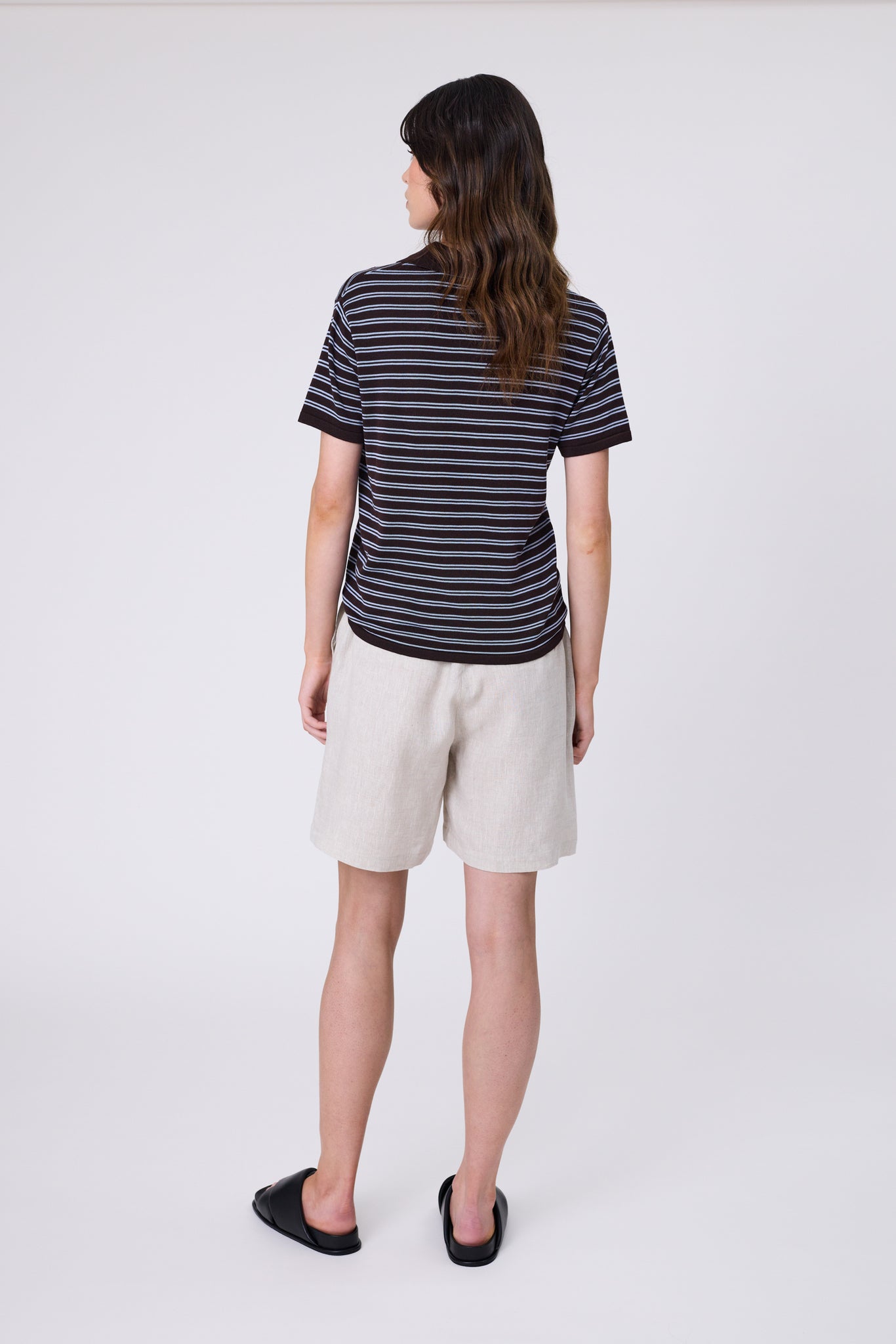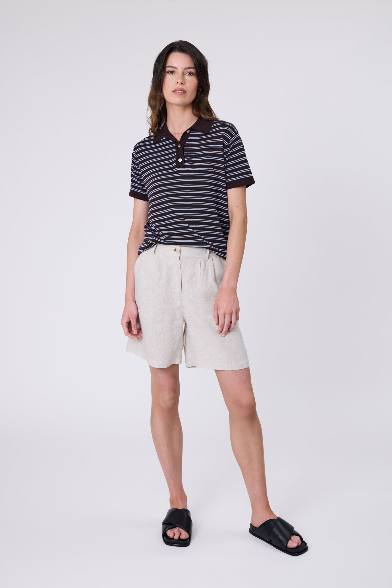 The Chime Knit Polo in Carob Stripe is a modern take on a timeless favourite, crafted in a custom stripe knit with a dark brown base and pale blue accents. Made from a premium cotton-modal blend, it combines the strength and breathability of cotton with the silky softness and drape of modal, resulting in a lightweight, durable yarn that feels luxuriously smooth against the skin. Designed with a relaxed fit, short sleeves, a neat quarter placket and shell buttons, it strikes the perfect balance between casual and refined. Wear it with the Vista Bermuda Short for a laid-back feel or pair with your favourite Marlow Denim for an elevated everyday look.