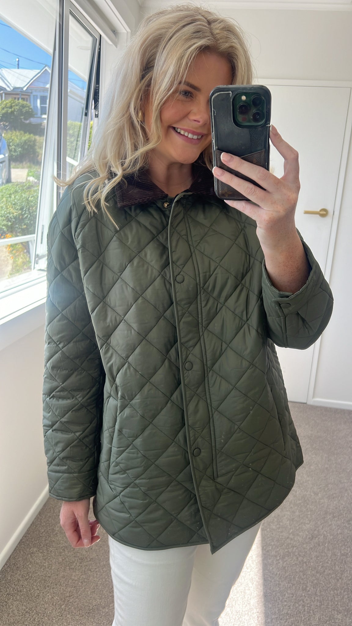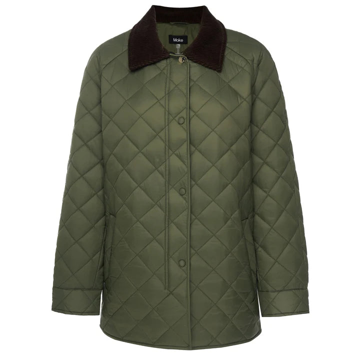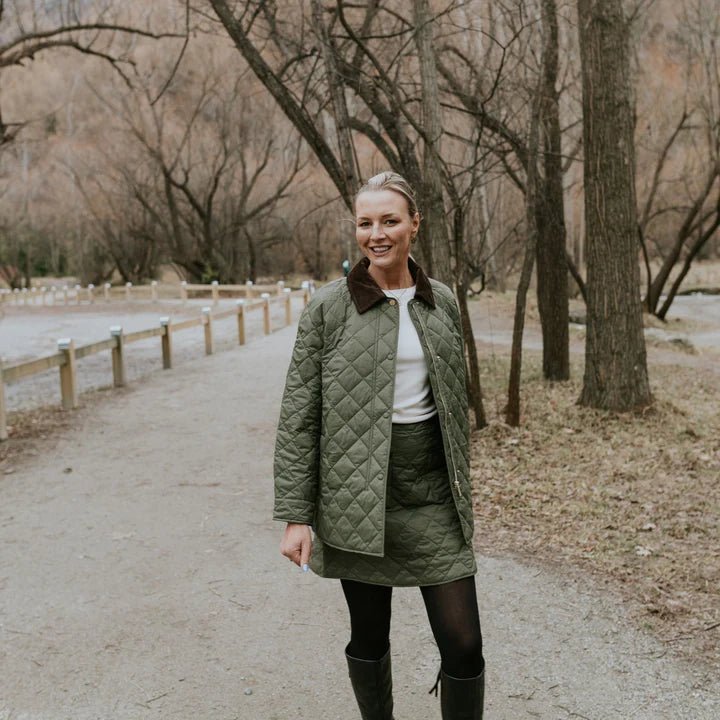 Designed with a classic diamond quilt pattern, Daisy channels an elegant English countryside aesthetic while maintaining a clean, modern feel. The statement corduroy collar adds texture and sophistication, while the snap-button front keeps the look relaxed yet elevated.
