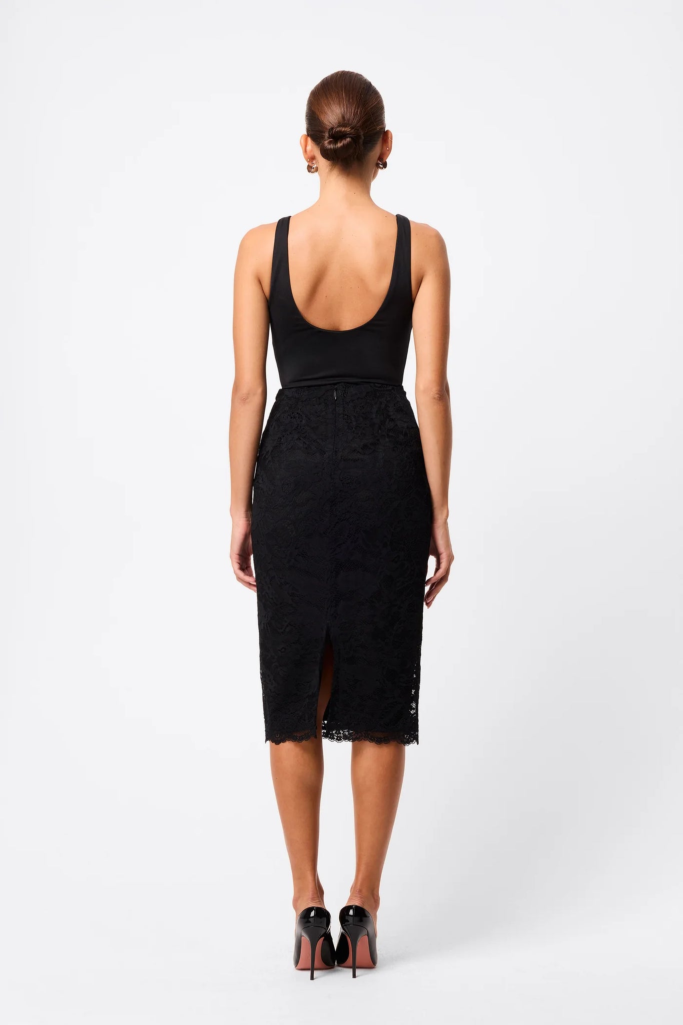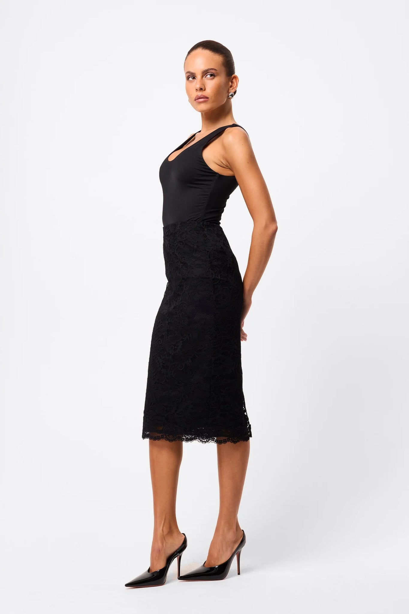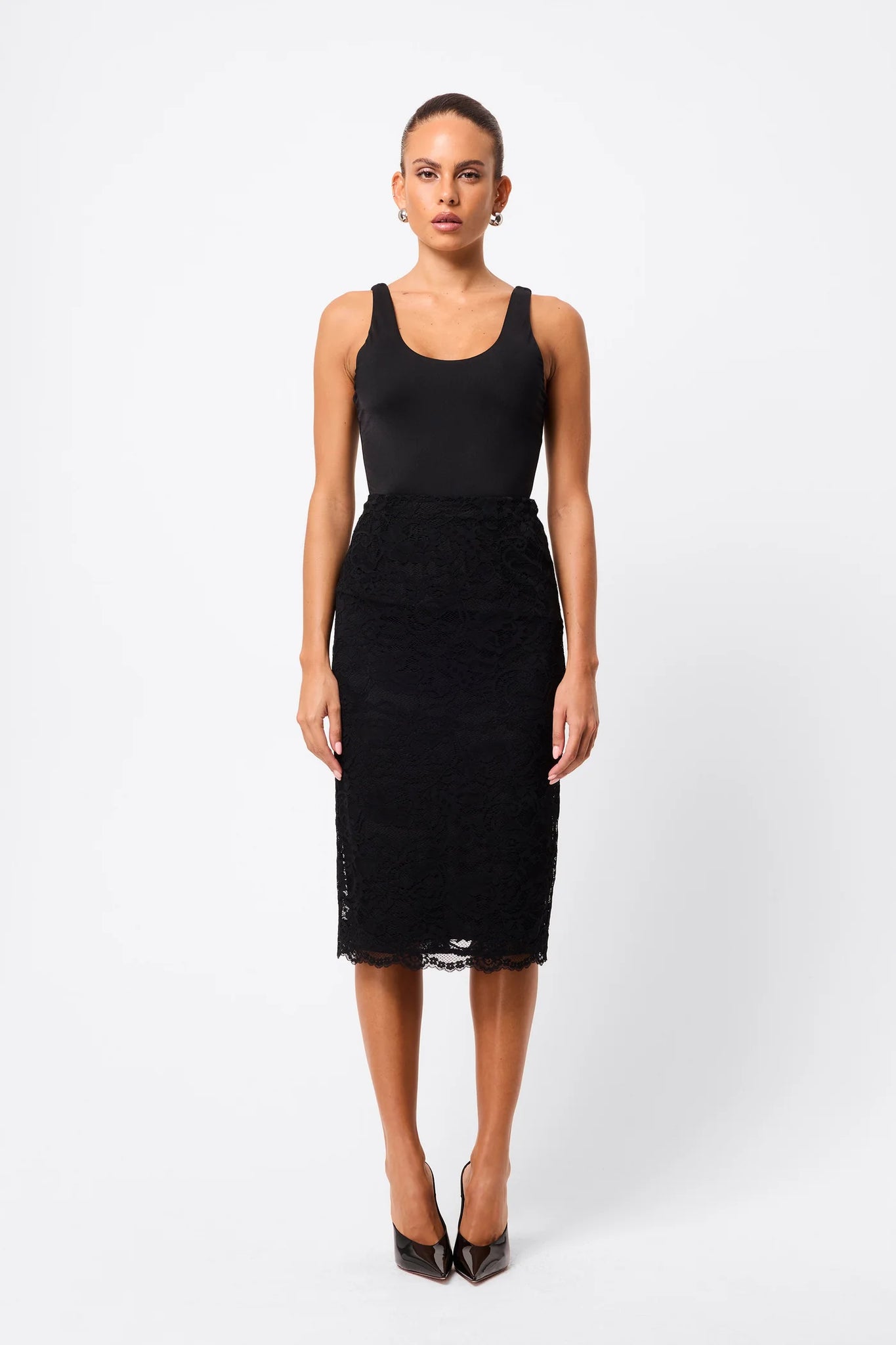 Refined and feminine, the Laced In Love Pencil Skirt in Black reimagines a classic silhouette with romantic lace detailing. Crafted from premium sheer lace with a removable slip, this sculpted style contours the body while offering versatile styling. A scalloped hemline, centre-back zip, and back split add refined detail and ease of movement. Perfect with a fitted top for sleek polish or paired with matching lace pieces for a coordinated statement look.