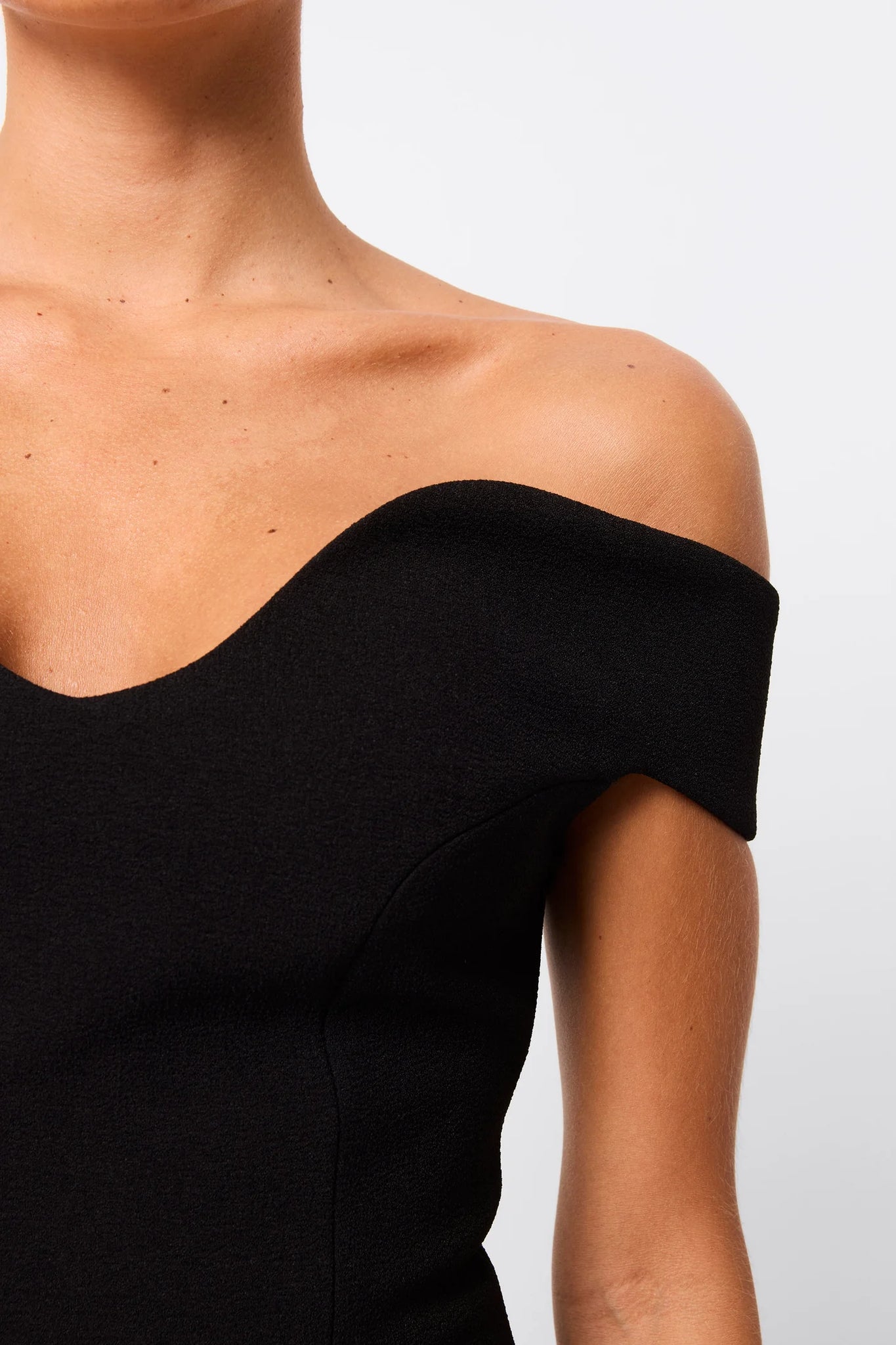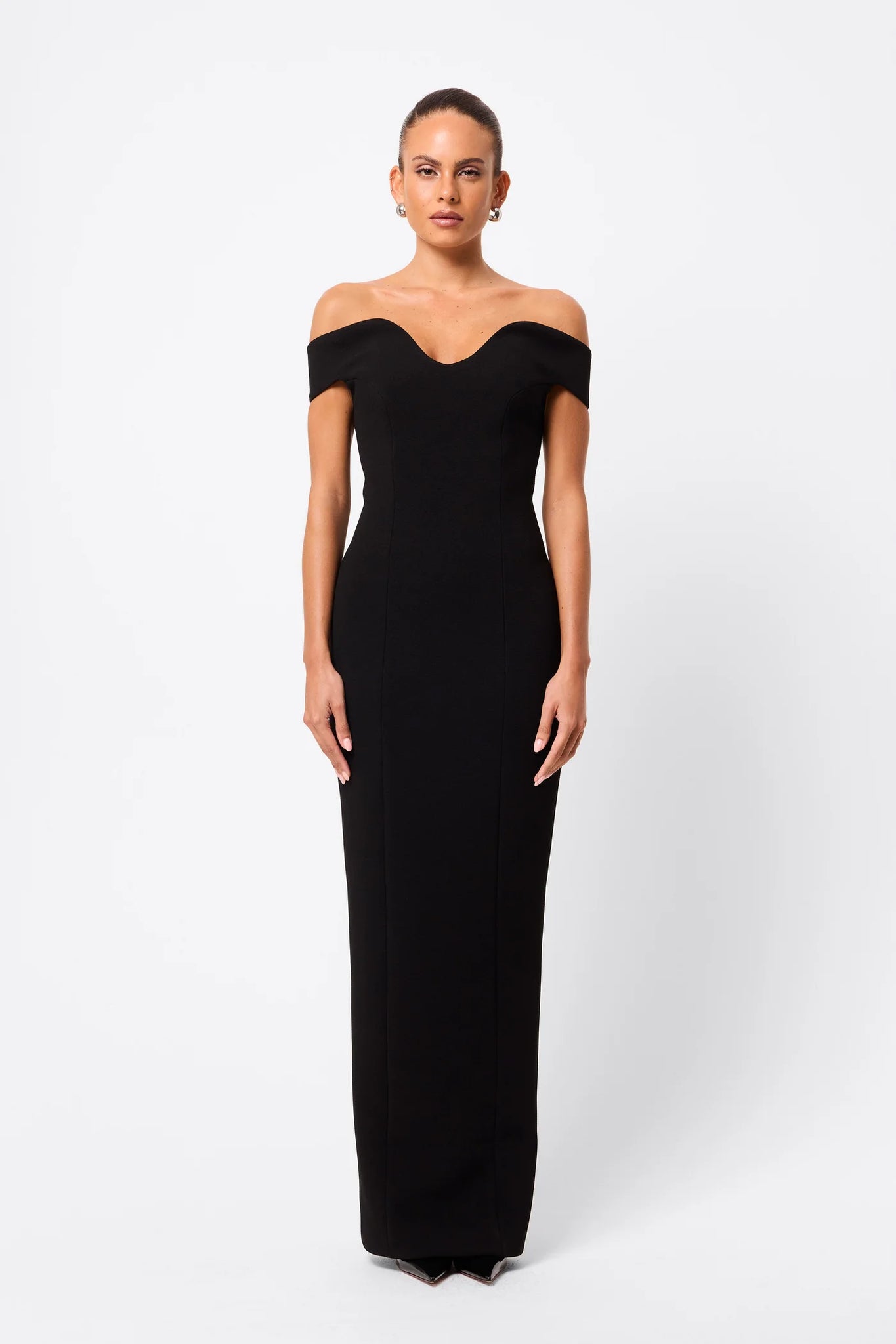 Turn heads in the Modernist Maxi Dress in Black— a sculptural silhouette that blends refined simplicity with modern edge. Crafted from premium matte crepe fabrication, it features a waved off-the-shoulder neckline with boning for structure and support. The sleek column fit is fully lined for a flawless finish, while an invisible centre-back zip and back split ensure ease of movement. Sophisticated and striking, it’s an unforgettable choice for any formal event.