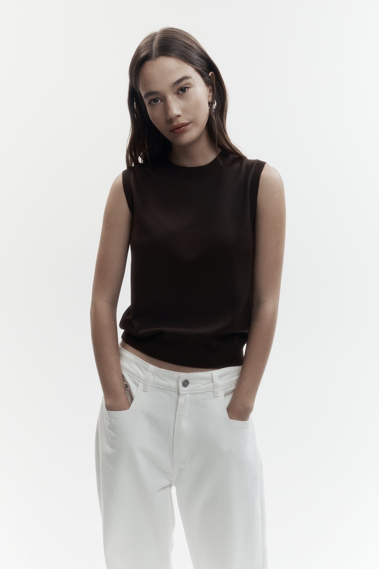 A sleeveless merino vest knitted from fine Australian-sourced wool, cut to a tidy silhouette for refined layering, in a rich ganache hue.